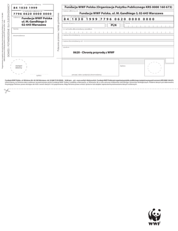 Przypominamy, że zgodnie z decyzją Dyrektora Generalnego Poczty Polskiej nr 17 z dn. 17.05.2005 opłata pocztowa za realizację przelewu na rzecz OPP wynosi tylko 1 złoty. 84 1030 1999 7796 0620 0000 0000 Fundacja WWF Polska ul. M. Gandhiego 3 02-645 Warszawa Fundacja WWF Polska (Organizacja Pożytku Publicznego KRS 0000 160 673) Fundacja WWF Polska, ul. M. Gandhiego 3, 02-645 Warszawa 84 1030 1999 7796 0620 0000 0000 PLN 0620 - Chronię przyrodę z WWF Fundacja WWF Polska • ul. Wiśniowa 38 • 02-520 Warszawa • tel. 22 848 75 93 (09:00 – 16:00 pon. – pt.) • www.wwf.pl • [email protected] • Fundacja WWF Polska jest organizacją pożytku publicznego zarejestrowaną pod numerem KRS 0000 160 673. Informujemy, że Państwa dane osobowe są przetwarzane przez Fundację WWF Polska z siedzibą w Warszawie, ul. Wiśniowa 38, w celu ochrony środowiska naturalnego i procesów ekologicznych. Podanie danych jest dobrowolne. Przysługuje Państwu prawo dostępu do treści swoich danych i ich poprawiania. Mają Państwo prawo wnieść sprzeciw lub zażądać zaprzestania przetwarzania danych osobowych.