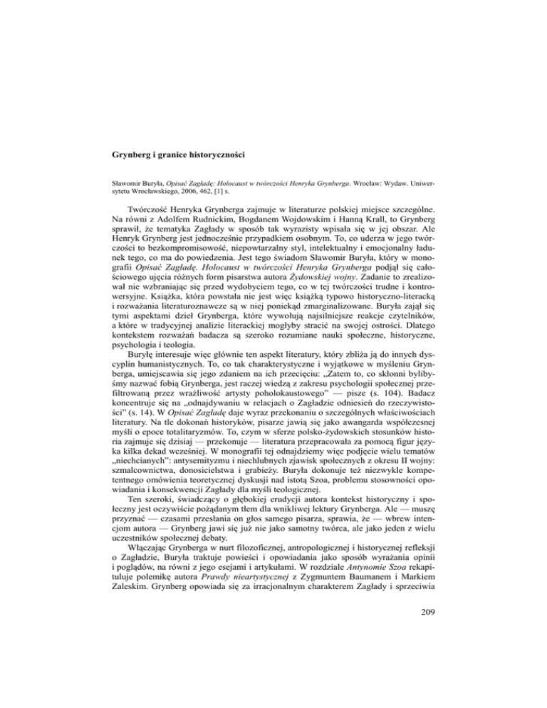 Grynberg i granice historyczności Sławomir Buryła, Opisać Zagładę: Holocaust w twórczości Henryka Grynberga. Wrocław: Wydaw. Uniwersytetu Wrocławskiego, 2006, 462, [1] s. Twórczość Henryka Grynberga zajmuje w literaturze polskiej miejsce szczególne. Na równi z Adolfem Rudnickim, Bogdanem Wojdowskim i Hanną Krall, to Grynberg sprawił, Ŝe tematyka Zagłady w sposób tak wyrazisty wpisała się w jej obszar. Ale Henryk Grynberg jest jednocześnie przypadkiem osobnym. To, co uderza w jego twórczości to bezkompromisowość, niepowtarzalny styl, intelektualny i emocjonalny ładunek tego, co ma do powiedzenia. Jest tego świadom Sławomir Buryła, który w monografii Opisać Zagładę. Holocaust w twórczości Henryka Grynberga podjął się całościowego ujęcia róŜnych form pisarstwa autora śydowskiej wojny. Zadanie to zrealizował nie wzbraniając się przed wydobyciem tego, co w tej twórczości trudne i kontrowersyjne. KsiąŜka, która powstała nie jest więc ksiąŜką typowo historyczno-literacką i rozwaŜania literaturoznawcze są w niej poniekąd zmarginalizowane. Buryła zajął się tymi aspektami dzieł Grynberga, które wywołują najsilniejsze reakcje czytelników, a które w tradycyjnej analizie literackiej mogłyby stracić na swojej ostrości. Dlatego kontekstem rozwaŜań badacza są szeroko rozumiane nauki społeczne, historyczne, psychologia i teologia. Buryłę interesuje więc głównie ten aspekt literatury, który zbliŜa ją do innych dyscyplin humanistycznych. To, co tak charakterystyczne i wyjątkowe w myśleniu Grynberga, umiejscawia się jego zdaniem na ich przecięciu: „Zatem to, co skłonni bylibyśmy nazwać fobią Grynberga, jest raczej wiedzą z zakresu psychologii społecznej przefiltrowaną przez wraŜliwość artysty poholokaustowego” — pisze (s. 104). Badacz koncentruje się na „odnajdywaniu w relacjach o Zagładzie odniesień do rzeczywistości” (s. 14). W Opisać Zagładę daje wyraz przekonaniu o szczególnych właściwościach literatury. Na tle dokonań historyków, pisarze jawią się jako awangarda współczesnej myśli o epoce totalitaryzmów. To, czym w sferze polsko-Ŝydowskich stosunków historia zajmuje się dzisiaj — przekonuje — literatura przepracowała za pomocą figur języka kilka dekad wcześniej. W monografii tej odnajdziemy więc podjęcie wielu tematów „niechcianych”: antysemityzmu i niechlubnych zjawisk społecznych z okresu II wojny: szmalcownictwa, donosicielstwa i grabieŜy. Buryła dokonuje teŜ niezwykle kompetentnego omówienia teoretycznej dyskusji nad istotą Szoa, problemu stosowności opowiadania i konsekwencji Zagłady dla myśli teologicznej. Ten szeroki, świadczący o głębokiej erudycji autora kontekst historyczny i społeczny jest oczywiście poŜądanym tłem dla wnikliwej lektury Grynberga. Ale — muszę przyznać — czasami przesłania on głos samego pisarza, sprawia, Ŝe — wbrew intencjom autora — Grynberg jawi się juŜ nie jako samotny twórca, ale jako jeden z wielu uczestników społecznej debaty. Włączając Grynberga w nurt filozoficznej, antropologicznej i historycznej refleksji o Zagładzie, Buryła traktuje powieści i opowiadania jako sposób wyraŜania opinii i poglądów, na równi z jego esejami i artykułami. W rozdziale Antynomie Szoa rekapituluje polemikę autora Prawdy nieartystycznej z Zygmuntem Baumanem i Markiem Zaleskim. Grynberg opowiada się za irracjonalnym charakterem Zagłady i sprzeciwia 209 się jej uniwersalistycznemu pojmowaniu. Na uwagę zasługują tutaj rozwaŜania o nieporównywalności i nieprzystawalności losów polskich i Ŝydowskich podczas okupacji. Figurą tej dziejowej asymetrii jest karuzela na placu Krasińskich. Była ona przejawem ciągłości Ŝycia Polaków, zachowanej pomimo wkroczenia wojennego terroru. Jednocześnie dla śydów w getcie stała się symbolem nieusuwalnej róŜnicy pomiędzy nimi a resztą społeczności Warszawy. Do tej nieprzystawalności wojennych losów naleŜy takŜe fakt całkowitej przypadkowości ocalenia Ŝydowskich istnień, ogromna zaleŜność śydów od Polaków oraz tragiczny bilans, jakiego dokonać musiał kaŜdy śyd po zakończeniu wojny. Z lektury Zwycięstwa, śycia ideologicznego i Niebieskookiej Marii płynie wniosek o niemoŜliwości porównania wojennego doświadczenia Polaków i śydów. Odsuwając na dalszy plan interpretację twórczości Grynberga, autor monografii śledzi fenomen przenikania się antyjudaizmu i antysemityzmu. Buryła podwaŜa czysto wyznaniowy charakter antyjudaizmu, kwestionując sens wyodrębniania tego zjawiska z szerszego pojęcia antysemityzmu. RozwaŜania te mają na celu rozwinięcie i uzupełnienie myśli Grynberga, zgodnie z którą chrześcijaństwo przygotowało grunt pod nowoŜytny antysemityzm i Zagładę. Trudno jednak nie ulec wraŜeniu, Ŝe rozdział ten wykorzystuje pisarstwo Grynberga w celach prezentacji tez bardziej ogólnych. Postępowanie interpretacyjne Buryły naraŜa jego wywód na inną jeszcze sprzeczność. Z jednej strony badacz przypisuje Grynbergowi „niewdzięczną rolę rozdrapywacza ran”, przypina mu etykietę „niesprawiedliwego”, ogarniętego swoistą obsesją pisarską publicysty, z drugiej poddaje racjonalizacji poglądy pisarza i podwaŜa ich oryginalność w kontekście publikacji zagranicznych: Grynberg „porządkuje jedynie rzeczy, które są znane badaczom” (s. 82). Autor Monologu polsko-Ŝydowskiego wpisany w krąg podobnych mu myślicieli (Emanuel Levinas, Bogdan Wojdowski, Marcin Król) staje się pisarzem bardziej wywaŜonym, ale i mniej kontrowersyjnym. Podobne problemy rodzi rekonstrukcja obrazu Marca ‘68 w twórczości pisarza. Wydarzenia marcowe stanowią dla Grynberga ostatni akt prześladowań śydów na terenie Europy i swoistą kontynuację realizowanego przez nazistów dzieła Zagłady. Tym, co działo się w Polsce pod koniec lat 60. zajmuje się w Memorbuchu i szkicu zatytułowanym R