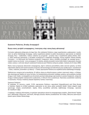 Gdańsk, czerwiec 2008 Szanowni Państwo, Drodzy Areopagici! Rusza nowy projekt areopagowy, tworzymy więc nową bazę adresową! Formularz zgłoszenia dołączamy do tego listu. Nie zwlekajcie Państwo z jego wypełnieniem, podpisaniem i wysłaniem na adres Gdańskiego Areopagu. Jedna wypełniona ankieta to jedno dwuosobowe zaproszenie na Gdański Areopag. Pary – małżonków, rodzica i dziecka czy przyjaciół – prosimy więc o wypełnienie jednej ankiety. Dzieci, które ukończyły gimnazjum, a chciałyby uczestniczyć w Gdańskim Areopagu, muszą wypełnić własną ankietę. Formularz – to informacja dla Państwa przyjaciół i znajomych, którzy chcieliby przystąpić do naszego grona – znaleźć można na stronie: www.areopag.pl. Co istotne, ankiety przesyłać można tylko listem tradycyjnym, bowiem wobec ustawy o ochronie danych osobowych konieczny jest Państwa odręczny podpis. Czekamy do 31 lipca 2008. Mamy nowe propozycje aktywności areopagowej, stąd w ankiecie pozwoliliśmy sobie zawrzeć pytania, na które odpowiedzi ułatwią nam konstruowanie programu adresowanego do konkretnych grup społecznych i zawodowych – dzieci, rodziców, prawników czy lekarzy – a także zapraszanie Państwa do współtworzenia Gdańskiego Areopagu. Telefoniczna recepcja jest przeszłością. W obliczu skarg na dotychczasowy system rezerwacji miejsc, w listopadzie obowiązywać będzie już nowa formuła. Ze świadomością ułomności każdego systemu wprowadzamy kontakt drogą e-mail. Każdy z areopagitów po otrzymaniu pocztą tradycyjnego zaproszenia w postaci książeczki, wyłącznie drogą e-mailową będzie wskazywał te wydarzenia, w których chce uczestniczyć. Nazwiska uczestników wyłonimy w losowaniu. Pocztą e-mailową odsyłać będziemy numery rezerwacji. Szanowni Państwo! W niedzielę, 15 czerwca, o godz. 13.30, zapraszamy Państwa z aparatami fotograficznymi pod Złotą Bramę w Gdańsku. Będzie to krótkie spotkanie, spojrzenie na ten stary, pełen symboliki obiekt. Osiem alegorii ożyje spacerując między przechodniami. Zgoda, którą uczyniliśmy patronką najbliższego Areopagu, zaprasza do wspólnych zdjęć. Z nadzieją i radością informujemy, że gościem specjalnym otwarcia areopagowego projektu „Złota Brama” będzie prof. Aleksander Wolszczan, astronom, którego przecież nikomu przedstawiać nie trzeba, odkrywca pierwszych planet spoza Układu Słonecznego. Z szacunkiem Forum Dialogu – Gdański Areopag Ankieta areopagowa Formularz zgłoszenia* Imię / nazwisko / wiek 1. 2. Adres e-mail (wspólny) Adres korespondencyjny (wspólny) Numer telefonu kontaktowego 1. 2. Wykształcenie (specjalizacja, osiągnięcia naukowe) 1. 2. Zawód wykonywany i miejsce pracy 1. 2. Przynależność do organizacji o charakterze społecznym (edukacyjne, charytatywne, religijne, non profit, z wyłączeniem partii i inicjatyw politycznych) 1. 2. Hobby 1. 2. * Uwaga! Warunkiem przyjęcia zgłoszenia jest wypełnienie wszystkich rubryk Wyrażam zgodę na przetwarzanie moich danych osobowych zawartych w formularzu zgłoszenia niezbędnych do realizacji procesu rejestracji (zgodnie z ustawą z dn. 29.08.97 roku o Ochronie Danych Osobowych Dz. Ust Nr 133 poz. 883). podpisy
