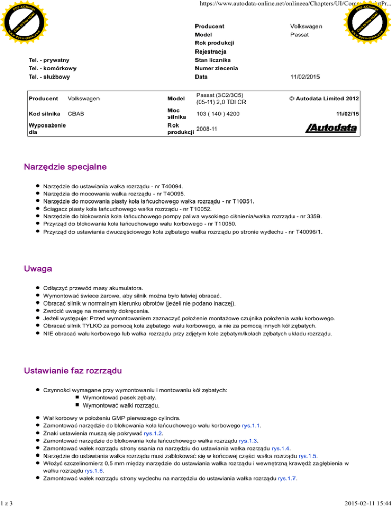 https://www.autodata-online.net/onlineea/Chapters/UI/CommonPrintPr... -X C h a n F -X C h a n ge F ge 1z3 N y k w .d o m Passat lic Model o .c to bu c u -tr a c k Volkswagen C m o .d o Producent w w w w w C lic k to bu y N O W ! PD O W ! PD c u -tr a c k .c Rok produkcji Rejestracja Tel. - prywatny Stan licznika Tel. - komórkowy Numer zlecenia Tel. - s Data 11/02/2015 © Autodata Limited 2012 bowy Producent Volkswagen Model Passat (3C2/3C5) (05-11) 2,0 TDI CR Kod silnika CBAB Moc silnika 103 ( 140 ) 4200 Wyposa enie dla 11/02/15 Rok 2008-11 produkcji Narz dzie specjalne Narz dzie do ustawiania wa ka rozrz du - nr T40094. Narz dzia do mocowania wa ka rozrz du - nr T40095. Narz dzie do mocowania piasty ko a cuchowego wa ka rozrz du - nr T10051. ci gacz piasty ko a cuchowego wa ka rozrz du - nr T10052. Narz dzie do blokowania ko a cuchowego pompy paliwa wysokiego ci nienia/wa ka rozrz du - nr 3359. Przyrz d do blokowania ko a cuchowego wa u korbowego - nr T10050. Przyrz d do ustawiania dwucz ciowego ko a z batego wa ka rozrz du po stronie wydechu - nr T40096/1. Uwaga Od czy przewód masy akumulatora. Wymontowa wiece arowe, aby silnik mo na by o atwiej obraca . Obraca silnik w normalnym kierunku obrotów (je eli nie podano inaczej). Zwróci uwag na momenty dokr cenia. Je eli wyst puje: Przed wymontowaniem zaznaczy po enie monta owe czujnika po enia wa u korbowego. Obraca silnik TYLKO za pomoc ko a z batego wa u korbowego, a nie za pomoc innych kó z batych. NIE obraca wa u korbowego lub wa ka rozrz du przy zdj tym kole z batym/ko ach z batych uk adu rozrz du. Ustawianie faz rozrz du Czynno ci wymagane przy wymontowaniu i montowaniu kó z batych: Wymontowa pasek z baty. Wymontowa wa ki rozrz du. Wa korbowy w po eniu GMP pierwszego cylindra. Zamontowa narz dzie do blokowania ko a cuchowego wa u korbowego rys.1.1. Znaki ustawienia musz si pokrywa rys.1.2. Zamontowa narz dzie do blokowania ko a cuchowego wa ka rozrz du rys.1.3. Zamontowa wa ek rozrz du strony ssania na narz dziu do ustawiania wa ka rozrz du rys.1.4. Narz dzie do ustawiania wa ka rozrz du musi zablokowa si w ko cowej cz ci wa ka rozrz du rys.1.5. szczelinomierz 0,5 mm mi dzy narz dzie do ustawiania wa ka rozrz du i wewn trzn kraw zag bienia w wa ku rozrz du rys.1.6. Zamontowa wa ek rozrz du strony wydechu na narz dziu do ustawiania wa ka rozrz du rys.1.7. 2015-02-11 15:44 https://www.autodata-online.net/onlineea/Chapters/UI/CommonPrintPr... -X C h a n F -X C h a n ge F ge 2z3 c u -tr a c k N y bu to k o m lic .c C m o .d o Narz dzie do ustawiania wa ka rozrz du musi zablokowa si w ko cowej cz ci wa ka rozrz du rys.1.8. Zag bienia w wa kach rozrz du musz by zwrócone na zewn trz rys.1.9. w .c .d o c u -tr a c k Ustawi z by na dwucz ciowym kole z batym wa ka rozrz du po stronie wydechu tak, aby pokrywa y si z przyrz dem do ustawiania ko a z batego wa ka rozrz du rys.1.10. Obraca wa kiem rozrz du po stronie ssania w kierunku strza ki, a z by kó z batych wa ków rozrz du po cz si rys.1.11. Umie ci obudow wa ków rozrz du na wa kach rozrz du rys.1.12. Przytrzyma wa ki rozrz du w tym po eniu narz dziem do mocowania wa ków rozrz du rys.1.13. Zdj narz dzie do ustawiania wa ka rozrz du z ko ców wa ków rozrz du rys.1.5 i rys.1.8. Wymontowa obudow wa ków rozrz du i wa ki rozrz du zabezpieczone w swoim po eniu za pomoc specjalnych narz dzi z narz dzia do ustawiania wa ka rozrz du. Umie ci obudow wa ków rozrz du z wa kami rozrz du oraz specjalne narz dzia na g owicy cylindrów rys.1.12. Zwróci uwag na prawid owe umieszczenie narz dzia do blokowania ko a cuchowego wa u korbowego rys.1.1. Znaki ustawienia musz si pokrywa rys.1.2. Zamontowa ponownie obudow wa ka rozrz du rys.1.12. Wymontowa specjalne narz dzia rys.1.10 i rys.1.13. w w w w w C lic k to bu y N O W ! PD O W ! PD 2015-02-11 15:44 https://www.autodata-online.net/onlineea/Chapters/UI/CommonPrintPr... -X C h a n F -X C h a n ge F ge 3z3 c u -tr a c k N y bu to k lic .d o m w o .c C m o .d o w w w w w C lic k to bu y N O W ! PD O W ! PD c u -tr a c k .c 2015-02-11 15:44