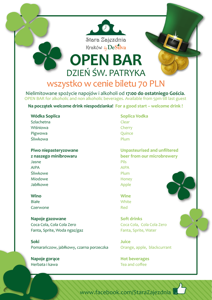 OPEN BAR DZIEŃ ŚW. PATRYKA wszystko w cenie biletu 70 PLN Nielimitowane spożycie napojów i alkoholi od 17:00 do ostatniego Gościa. OPEN BAR for alkoholic and non alkoholic beverages. Available from 5pm till last guest Na początek welcome drink niespodzianka! For a good start – welcome drink ! Wódka Soplica Soplica Vodka Szlachetna Wiśniowa Pigwowa Śliwkowa Clear Cherry Quince Plum Piwo niepasteryzowane z naszego minibrowaru Unpasteurised and unfiltered beer from our microbrewery Jasne AIPA Śliwkowe Miodowe Jabłkowe Pils AIPA Plum Honey Apple Wino Wine Białe Czerwone White Red Napoje gazowane Soft drinks Coca Cola, Cola Cola Zero Fanta, Sprite, Woda ngaz/gaz Coca Cola, Cola Cola Zero Fanta, Sprite, Water Soki Juice Pomarańczow, jabłkowy, czarna porzeczka Orange, apple, blackcurrant Napoje gorące Hot beverages Herbata i kawa Tea and coffee www.facebook.com/StaraZajezdnia MENU DZIEŃ ŚW. PATRYKA PRZYSTAWKI | Starters Wiejski pasztet z kiszonym ogórkiem i pieczywem ......................................................... Pâté de Campagne with gherkins and bread 14zł Sałatka cezar z kurczakiem, parmezanem, kremowym sosem i grzankami .................. 24zł Caesar salad with chicken, Parmesan cheese, creamy sauce and croutons Grillowany oscypek z żurawiną ......................................................................................... 19zł Grilled oscypek cheese with cranberries ZUPY | Soups Żurek staropolski z kiełbasą i jajkiem ................................................................................ 12zł Traditional Polish sour rye soup with regional sausage and hard boiled egg Zupa gulaszowa z pieczywem ........................................................................................... 14zł Goulash soup with bread DANIA GŁÓWNE | Main courses Żeberka wieprzowe duszone w whisky, podane z sałatką colesław .............................. 29zł i opiekanymi ziemniakami Pork ribs stewed in whisky, served with coleslaw and baked potatoes Golonka wieprzowa duszona w ciemnym piwie z naszego minibrowaru ...................... 35zł podana na chlebie prądnickimi i zasmażaną kapustą Ham hock stewed in ale from our micro-brewery, served on traditional rye bread with fried cabbage Gicz jagnięca duszona w sosie miętowym podana .......................................................... 39zł z puree ziemniaczanym i brokułami Veal shank stewed in mint sauce served with mashed potatoes and broccoli Pappardelle z młodym szpinakiem i suszonymi pomidorami .......................................... 27zł Pappardelle with fresh spinach and dried tomatoes DESERY | Desserts Tradycyjne brownie z orzechami oraz lodami waniliowymi ............................................ 15zł Traditional brownie with nuts and vanilla ice cream Strudel jabłkowy z sosem waniliowym ............................................................................. 15zł Apple strudel with vanilla sauce Życzymy smacznego! www.StaraZajezdniaKrakow.pl www.facebook.com/StaraZajezdnia