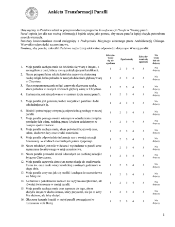 Ankieta Transformacji Parafii Dziękujemy za Państwa udział w przeprowadzeniu programu Transformacji Parafii w Waszej parafii. Pana/i opinia jest dla nas ważną informacją i będzie użyta jako pomoc, aby nasza parafia lepiej służyła potrzebom swoich wiernych. Poniższy kwestionariusz został zasięgnięty z Podręcznika Misyjnego ułożonego przez Archidiecezję Chicago. Wszystkie odpowiedzi są anonimowe. Prosimy, aby poniżej zakreślili Państwo najbardziej adekwatne odpowiedzi dotyczące Waszej parafii: Zdecydowanie się nie zgadzam 1. Moja parafia zachęca mnie do dzielenia się wiarą z innymi, a szczególnie z tymi, którzy nie są praktykującymi katolikami. 2. Nasza przyparafialna szkoła katolicka zapewnia skuteczną naukę religii, która pobudza w naszych dzieciach głębszą wiarę w Chrystusa. 3. Nasz program nauczania religii zapewnia skuteczną naukę, która pobudza w naszych dzieciach głębszą wiarę w Chrystusa. Zgadzam się Zdecydowanie się zgadzam Nie wiem lub nie dotyczy 1 2 3 4 5 Nie dotyczy 1 2 3 4 5 Nie dotyczy 1 2 3 4 5 Nie dotyczy 4. Eucharystia jest zdecydowanie w centrum życia naszej parafii. 1 2 3 4 5 Nie dotyczy 5. Moja parafia jest gościnną wobec wszystkich parafian i ludzi odwiedzających ją. 1 2 3 4 5 Nie dotyczy 1 2 3 4 5 Nie dotyczy 1 2 3 4 5 Nie dotyczy 1 2 3 4 5 Nie dotyczy 9. Moja parafia odpowiednio informuje nas o swojej sytuacji finansowej i o środkach materialnych jakimi dysponuje. 1 2 3 4 5 Nie dotyczy 10. Nasza młodzież jest mile widziana i wysłuchana w parafii oraz zapraszana do aktywnego w niej uczestnictwa. 1 2 3 4 5 Nie dotyczy 1 2 3 4 5 Nie dotyczy 1 2 3 4 5 Nie dotyczy 1 2 3 4 5 Nie dotyczy 1 2 3 4 5 Nie dotyczy 1 2 3 4 5 Nie dotyczy 1 2 3 4 5 Nie dotyczy 6. Biedni i potrzebujący otrzymują odpowiednią posługę w naszej parafii. 7. Moja parafia pomaga swoim wiernym w odnalezieniu związku pomiędzy ich wiarą, rodziną, pracą i życiem codziennym w naszym społeczeństwie. 8. Moja parafia zachęca mnie, abym poświęcił/a jej swój czas, talent, duchowe dary oraz środki materialne. 11. Nasza parafia prowadzi dzieci i dorosłych do osobistej relacji z żyjącym Chrystusem. 12. Moja parafia zapewnia dorosłym rozne okazje do studiowania Pisma św. oraz nauki wiary katolickiej o różnych godzinach w ciągu dnia. 13. Moja parafia uczy nas jak się modlić i zachęca do uczestnictwa we Mszy św. 14. Kulturowe i pokoleniowe różnice nie są tylko akceptowane, ale również świętowane w mojej parafii. 15. Moja parafia zachęca mnie oraz zaprasza do tego, abym służył/a innym w duchu Jezusa, który przyszedł, nie po to żeby Mu służono, ale żeby slużyć. 16. Głoszone kazania i nauki w mojej parafii pomagają mi w rozeznaniu woli Bożej 1 Ankieta Transformacji Parafii 17. Moja parafia jest wdzięczna tym wszystkim, którzy dzielą się swoimi darami ze wspólnotą. 1 2 3 4 5 Nie dotyczy 18. Moja parafia dobrze zarządza swoimi zasobami materialnymi. 1 2 3 4 5 Nie dotyczy 1 2 3 4 5 Nie dotyczy 1 2 3 4 5 Nie dotyczy 1 2 3 4 5 Nie dotyczy 22. Moja parafia uczy, że nasza wzajemna więź jedności i miłości w Chrystusie jest podstawą naszego życia wspólnotowego 1 2 3 4 5 Nie dotyczy 23. Moja parafia stwarza szanse do zaangażowania się w misję Chrystusa w parafii i poza nią. 1 2 3 4 5 Nie dotyczy 24. Moja parafia oferuje programy mające na celu wzmocnienie małżeństw i życia rodzinnego. 1 2 3 4 5 Nie dotyczy 1 2 3 4 5 Nie dotyczy 1 2 3 4 5 Nie dotyczy 1 2 3 4 5 Nie dotyczy 1 2 3 4 5 Nie dotyczy 1 2 3 4 5 Nie dotyczy 19. Nasza parafia jest przepełniona duchem nadziei i idzie w dobrym kierunku. 20. Moja parafia jest świadkiem Chrystusa w naszym społeczeństwie poprzez walkę na rzecz biednych i sprawiedliwości społecznej. 21. Moja parafia zapewnia możliwość uczestniczenia w modlitwach i nabożeństwach poza Mszą św. 25. W mojej parafii są osoby, które są w stanie mi pomóc wzrastać w mojej wierze poprzez wspólną ‘wędrówkę’ drogą wiary. 26. Liturgia w naszej parafii jest pięknie i godnie sprawowana, z dobrze przygotowanymi świeckimi szafarzami oraz z głębokimi kazaniami. 27. Moja parafia dobrze rozporządza swoimi środkami materialnymi dzieląc się nimi z innymi i opierając się na modelu dobrej współodpowiedzialności. 28. Nasza parafia zapewnia okazję do skorzystania z Sakramentu Pojednania o różnych porach. 29. Nasza parafia współpracuje z sąsiednimi parafiami w stwarzaniu silniejszej katolickiej obecności w naszej dzielnicy. Jakie są mocne strony Waszej parafii? Jakie są słabe strony Waszej parafii? Co należy zrobić, aby uczynić Waszą parafię bardziej żywą i skuteczną? Co może być dzisiaj zagrożeniem dla parafii? 2 Ankieta Transformacji Parafii Prosimy zakreślić odpowiedzi do pytań dotyczących Waszej wiary: Zdecydowanie się nie zgadzam Zgadzam się Zdecydowanie się zgadzam Nie wiem lub nie dotyczy 1. Traktuję moją wiarę na poważnie poprzez regularną modlitwę osobistą, czytanie duchowe oraz pracę charytatywną. 1 2 3 4 5 Nie dotyczy 2. Rozumiem znaczenie Mszy św. i powód dla kórego uczestniczenie w niej w każdą niedzielę jest obowiązkowe. 1 2 3 4 5 Nie dotyczy 1 2 3 4 5 Nie dotyczy 1 2 3 4 5 Nie dotyczy 1 2 3 4 5 Nie dotyczy 1 2 3 4 5 Nie dotyczy 1 2 3 4 5 Nie dotyczy 1 2 3 4 5 Nie dotyczy 1 2 3 4 5 Nie dotyczy 1 2 3 4 5 Nie dotyczy 11. Uczyniłbym więcej dla parafii, gdyby mnie o to poproszono. 1 2 3 4 5 Nie dotyczy 12. Jasno rozumiem czego oczekuje ode mnie moja parafia. 1 2 3 4 5 Nie dotyczy 13. Wierzę, że Jezus jest obecny w Eucharystii. 1 2 3 4 5 Nie dotyczy 1 2 3 4 5 Nie dotyczy 1 2 3 4 5 Nie dotyczy 3. Uczestniczenie w Sakramentach jest istotną częścią mojego życia katolickiego. 4. Wierzę, że przywiązanie do praktyk religijnych Kościoła znacząco przyczynia się do mojej duchowości jako Katolika. 5. Przynależność do mocnej katolickiej wspólnoty jest istotna dla mojego wzrostu duchowego oraz wytrwałości