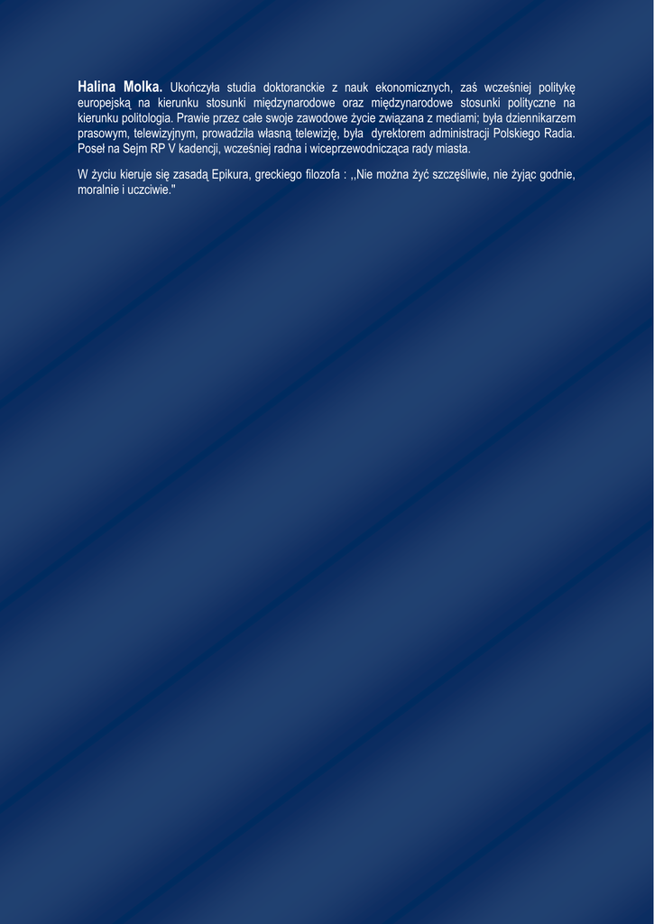Halina Molka. Ukończyła studia doktoranckie z nauk ekonomicznych, zaś wcześniej politykę europejską na kierunku stosunki międzynarodowe oraz międzynarodowe stosunki polityczne na kierunku politologia. Prawie przez całe swoje zawodowe życie związana z mediami; była dziennikarzem prasowym, telewizyjnym, prowadziła własną telewizję, była dyrektorem administracji Polskiego Radia. Poseł na Sejm RP V kadencji, wcześniej radna i wiceprzewodnicząca rady miasta. W życiu kieruje się zasadą Epikura, greckiego filozofa : ,,Nie można żyć szczęśliwie, nie żyjąc godnie, moralnie i uczciwie.''