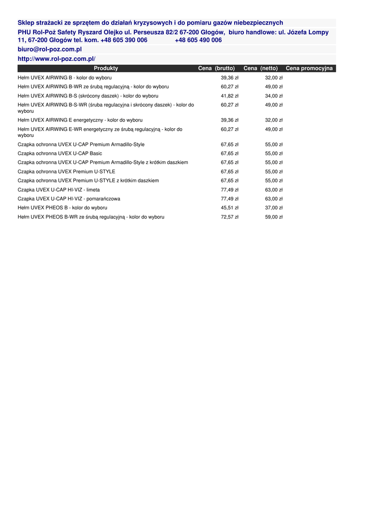 Sklep strażacki ze sprzętem do działań kryzysowych i do pomiaru gazów niebezpiecznych PHU Rol-Poż Safety Ryszard Olejko ul. Perseusza 82/2 67-200 Głogów, biuro handlowe: ul. Józefa Lompy 11, 67-200 Głogów tel. kom. +48 605 390 006 +48 605 490 006 [email protected] http://www.rol-poz.com.pl/ Produkty Cena (brutto) Cena (netto) Hełm UVEX AIRWING B - kolor do wyboru 39,36 zł 32,00 zł Hełm UVEX AIRWING B-WR ze śrubą regulacyjną - kolor do wyboru 60,27 zł 49,00 zł Hełm UVEX AIRWING B-S (skrócony daszek) - kolor do wyboru 41,82 zł 34,00 zł Hełm UVEX AIRWING B-S-WR (śruba regulacyjna i skrócony daszek) - kolor do wyboru 60,27 zł 49,00 zł Hełm UVEX AIRWING E energetyczny - kolor do wyboru 39,36 zł 32,00 zł Hełm UVEX AIRWING E-WR energetyczny ze śrubą regulacyjną - kolor do wyboru 60,27 zł 49,00 zł Czapka ochronna UVEX U-CAP Premium Armadillo-Style 67,65 zł 55,00 zł Czapka ochronna UVEX U-CAP Basic 67,65 zł 55,00 zł Czapka ochronna UVEX U-CAP Premium Armadillo-Style z krótkim daszkiem 67,65 zł 55,00 zł Czapka ochronna UVEX Premium U-STYLE 67,65 zł 55,00 zł Czapka ochronna UVEX Premium U-STYLE z krótkim daszkiem 67,65 zł 55,00 zł Czapka UVEX U-CAP HI-VIZ - limeta 77,49 zł 63,00 zł Czapka UVEX U-CAP HI-VIZ - pomarańczowa 77,49 zł 63,00 zł Hełm UVEX PHEOS B - kolor do wyboru 45,51 zł 37,00 zł Hełm UVEX PHEOS B-WR ze śrubą regulacyjną - kolor do wyboru 72,57 zł 59,00 zł Cena promocyjna