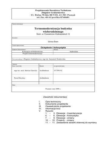 Projektowanie Doradztwo Techniczne Zbigniew Grabarkiewicz Ul. Dolna Wilda 88/VIII, 61-501 Poznań tel./fax 48 61/prefiks/8740681 Nazwa inwestycji Termomodernizacja budynku wielorodzinnego Śrem, ul. Powstańców Wielkopolskich 10 Inwestor Gmina Śrem Temat opracowania Ocieplenie i kolorystyka Branża Stadium dokumentacji Koncepcja architektoniczna Projekt termomodernizacji Proj. prowadzący: budowlana Zbigniew Grabarkiewicz, mgr inż. Inżynierii Środowiska Autorzy Imię i nazwisko Branża nr uprawnień proj. mgr inż. arch. Mariusz Sawicki Architektura 357/PW/92 Paweł Brzykcy Architektura Data Poznań, Luty 2008 r. Zawartość dokumentacji I. II. III. IV. V. Opis techniczny Dokumenty projektanta Oswiadczenie projektanta Informacja bioz Rysunki 1. - 3. Elewacje - Inwentaryzacja 4. - 6. Elewacje - Kolorystyka 7. - 9. Elewacje - zmiany 10. - 10. Przekrój - zmiany 11. - 11. Zestawienie stolarki okiennej do wymiany OPIS DO PROJEKTU TERMOMODERNIZACJI Budynku wielorodzinnego Śrem, ul. Powstańców Wielkopolskich 10 I. Podstawa opracowania 1. 2. 3. 4. 5. Zlecenie inwestora. Dokumentacja inwentaryzacyjna obiektu. Wizja w terenie. PN-EN ISO 6946:2004– ochrona cieplna budynków. Rozporządzenie Ministra Infrastruktury z dnia 12.04.2002 w sprawie warunków technicznych, jakim powinny odpowiadać budynki i ich usytuowanie. 6. Ustawa Prawo budowlane. II. Opis budynku 2.1 Ogólna charakterystyka i położenie Budynek przeznaczony do remontu zlokalizowany jest przy ulicy Powstańców Wielkopolskich 10 w Śremie. Budynek mieszkaniowy - wielorodzinny, jeden z kilku budynków tego typu zlokalizowanych wzdłuż ulicy. 2.2 Układ i uzbrojenie budynku Budynek jest obiektem mieszkalnym, pięciokondygnacyjny w pełni podpiwniczonym, posiadającym dwie klatki schodowe. Do obiektu doprowadzone są niezbędne media: wod.-kan., gaz, elektryczność, telefonia i TV. 2.3 Projektowanie zmiany zabudowy Nie zakłada się realizacji żadnych nowych elementów konstrukcyjnych budynku ani sieci od strony ulicy. Dla uporządkowania elewacji, zarówno ulicznych jak i podwórzowych, zakłada się likwidację zbędnych instalacji i urządzeń na nich zamontowanych. 2.4 Opis budynku – stan istniejący Budynek został wykonany w konstrukcji tradycyjnej – murowanej. Konstrukcja jest zwieńczona dachem skośnym dwuspadowym posiadającym doświetlenie w postaci lukarn oraz okien dachowych. Cztery kondygnacje mieszkalne są obsługiwane przez jedną klatkę schodową. Na poddaszu znajdują się powierzchnie użytkowe. III. Ocena ciepłochronności przegród budynku Żadna z zewnętrznych przegród budynku nie spełnia obecnie obowiązujących norm w zakresie ochrony cieplnej. Stolarka otworowa również nie spełnia norm w zakresie ochrony cieplnej i jest technicznie zużyta. IV. Działania sanacyjne W celu doprowadzenia budynku do zgodności z obowiązującymi wymaganiami w zakresie ochrony cieplej budynków niezbędne jest docieplenie następujących przegród zewnętrznych: 1. Ścian zewnętrznych: - ściany zewnętrzne kondygnacji naziemnych - wykonanie docieplenia w systemie lekkim na bazie styropianu EPS 70 gr. 14 cm - ściany piwnic – wykonanie docieplenia w systemie lekkim na bazie styropianu EPS 100 gr. 14 cm w pasie piwnicy i wkopaniem poniżej poziomu gruntu na głębokość 30-50 cm. 2. Podłoga strychu nieużytkowego: – 16 cm wełny mineralnej twardej w płytach montowane w podłodze strychu nieużytkowego z podłogą z Płyt OSB 2,2 cm montowanych na pióro-wpust (np. ROCKWOOL STROPROCK =0,041 W/mK – w audycie przyjęto 15 cm wełny o współczynniku =0,040 W/mK). Wełnę Mineralną należy od spodu zabezpieczyć folią przeciwwilgociową, od góry folią półprzepuszczalną. W ramach prowadzonych robót projektuje się również wymianę stolarki mieszkań i powierzchni wspólnych oraz drzwi zewnętrznych. . V. Opis projektowanych robót 1. Prace przygotowawcze. Przed przystąpieniem do robót ociepleniowych zdemontować rury spustowe, instalację odgromową, i wszystkie elementy przytwierdzone do ścian zewnętrznych ( anteny satelitarne, kable, instalację odgromową itp. ). Istniejące okablowanie biegnące na ścianach zabezpieczyć poprzez przełożenie ich do rurek winidurowych lub PCW. Istniejące puszki, tablice i inny osprzęt wysunąć od ściany na grubość projektowanej warstwy styropianu. . 2. Docieplenie ścian zewnętrznych. Docieplenie wykonać w systemie lekkim na bazie styropianu EPS 70 gr. 14 cm Ze względów użytkowych i ekonomicznych proponuje się zastosowanie tynku mineralnego łączącego dobre właściwości fizyko – mechaniczne z umiarkowaną ceną. Elewacje narażone na uszkodzenia mechaniczne wykonać na bazie tynków bezcementowych. Wymagane parametry techniczne spełniają wszystkie dostępne na rynku systemy dociepleń. Przedstawiony poniżej opis przedstawia typowe rozwiązanie systemowe. Wykonać w systemie ociepleniowym na bazie styropianu EPS 70 o = 0,040 W/mK. Przed wykonaniem docieplenia usunąć wszystkie luźne i łatwo odspajające się fragmenty tynku. Powstałe ubytki uzupełnić gotową zaprawą tynkarską na obrzutce z zaprawy cementowej. Płyty styropianowe kleić do ścian klejem punktowo ( w narożnikach również obwiedniowo ) i dodatkowo zamocować kołkami plastikowymi. Wszystkie płaszczyzny ścian zazbroić tkaniną zbrojącą z włókna szklanego i zaszpachlować klejem szpachlowym. Na wyszpachlowanej ścianie ułożyć tynk cienkowarstwowy mineralny, średnioziarnisty 2 mm w kolorystyce określonej na rysunkach elewacji. Wszystkie ściany w fakturze „baranka”. Ościeża wykleić styropianem gr. 2 cm typu Neopor. Wszystkie narożniki wykonać na bazie kątowników aluminiowych z siatką z włókna szklanego. Roboty tynkarskie wykonywać w przedziałach temperatur powietrza od 5 do 25 st. Celsjusza z zabezpieczeniem ścian przed opadami atmosferycznymi w okresie 48 godzin od nałożenia tynku. 3. Wymiana stolarki. Otwory okienne zostały zwy
