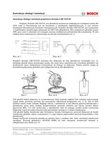 Instrukcja obsługi i instalacji Instrukcja obsługi i instalacji projektora dźwięku LBC3432/01 Projektor dźwięku LBC3432/01 jest głośnikiem poŜarowym spełniającym wymagania normy BS 5839 część 8. Przeznaczony jest do stosowania w instalacjach nagłośnieniowych, w tym równieŜ instalacjach Dźwiękowych Systemów Ostrzegawczych. Projektor dźwięku LBC3432/01 jest wyposaŜony w transformator umoŜliwiający dołączenie do 100V linii głośnikowej. Moc znamionowa głośnika wynosi 20W, przy czym w zaleŜności od wymagań, moŜemy zredukować ją dwukrotnie lub czterokrotnie. W celu redukcji mocy znamionowej wykorzystuje się odczepy transformatora (rys 1). Rys. 1 Rys. nr 1. Rys. nr 2. Projektor dźwięku LBC3432/01 powinien być dołączane do linii głośnikowej równolegle (rys. 2). Instalując głośnik naleŜy przestrzegać zasady, aby suma mocy znamionowych wszystkich głośników nie przekroczyła mocy znamionowej wzmacniacza, do którego są dołączone. NaleŜy zwrócić uwagę na prawidłową polaryzację głośników przy dołączaniu ich do linii głośnikowej. Rys 3. Rys. nr 4. Rys. nr 5. Jeśli głośnik będzie połączony ze wzmacniaczami, które kontrolę ciągłości linii realizują wykorzystując sygnał pilota, przewody powinny być prowadzone oddzielnymi przepustami (rys. 3, 4). Aby to było moŜliwe naleŜy wybić zaślepkę drugiego otworu i zamontować w nim dławicę gumową (dostarczana z głośnikiem), przez którą zostanie przeprowadzony przewód. MoŜliwe jest uŜycie równieŜ dławic gumowych BDe 13,5 (nie dostarczane z głośnikiem). Jeśli do jednego zacisku kostki ceramicznej dołączamy więcej niŜ jedną Ŝyłę przewodu powinniśmy zacisnąć je w tulejce instalacyjnej. Jeśli głośnik będzie instalowany jako Dźwiękowy System Ostrzegawczy, przewód dołączony do kostki ceramicznej głośnika, naleŜy wymontować a w jego miejsce poprowadzić przewód bezpośrednio z linii głośnikowej. Istnieje moŜliwość zwieszenia głośnika na stalowej lince, o średnicy min. 2mm, zaciśniętej metalowymi zaciskami. Przewód głośnikowy (HTKSH PH90) do linki mocujemy metalowymi taśmami w odległościach max 40mm (rys. 5). Robert Bosch Sp. z o.o. / Security Systems STPL | 11.23.2005 | © Robert Bosch GmbH reserves all rights even in the event of industrial property rights. We reserve all rights of disposal such as copying and passing on to third parties.