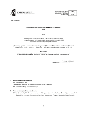 IGD.271.4.2013 SPECYFIKACJA ISTOTNYCH WARUNKÓW ZAMÓWIENIA SIWZ DLA POSTĘPOWANIA O UDZIELENIE ZAMÓWIENIA PUBLICZNEGO PROWADZONEGO W TRYBIE PRZETARGU NIEOGRANICZONEGO o wartości szacunkowej poniżej 200.000 euro ogłoszonego zgodnie z postanowieniami ustawy z dnia 29 stycznia 2004 r. Prawo zamówień publicznych (tekst jednolity Dz. U. z 2010 r. nr 113 poz. 759 z późn. zm.), zwanej w treści niniejszej SIWZ, PZP NA USŁUGĘ PROWADZENIE ZAJĘĆ W RAMACH PROJEKTU „Nasza przyszłość - nasza sprawa.” /-/ Paweł Kołakowski Zatwierdzam ………………….. 1. Nazwa i adres Zamawiającego 1.1. Zamawiającym jest: Gmina Krasne, siedziba: ul. Adama Mickiewicza 23, 06-408 Krasne 1.2. Adres internetowy: www.bip.krasne.pl 2. Finansowanie przedmiotu zamówieniu 2.1. Zamówienie będzie finansowane ze środków pochodzących z budżetu Zamawiającego oraz Unii Europejskiej w ramach Europejskiego Funduszu Społecznego (Program Operacyjny Kapitał Ludzki). 1 3. Tryb udzielenie zamówienia 3.1. Przetarg nieograniczony na podstawie art. 39 PZP oraz art. 5 ust. 1 PZP. 4. Opis przedmiotu zamówienia 4.1. Przedmiotem zamówienia są usługi obejmujące: 4.2. ZADANIE 1 – REALIZACJA ZAJ ĘĆ ROZWIJAJĄCYCH I WYRÓWNUJĄCYCH, w tym z: 4.2.1. matematyki dla 3 grup (19 uczniów) w wymiarze 60h/gr, w tym w roku szkolnym 2013/14 – 2 gr, a w roku szkolnym 2014/15-1gr 4.2.2. przyrody dla 3 grup (19 uczniów) w wymiarze 60h/gr, w tym w roku szkolnym 2013/14 – 2 gr, a w roku szkolnym 2014/15-1gr 4.2.3. języka polskiego dla 4 grup (27 uczniów) w wymiarze 60h/gr, w tym w roku szkolnym 2013/14 – 3 gr, a w roku szkolnym 2014/15-1gr 4.2.4. języka angielskiego dla 6 grup (43 uczniów) w wymiarze 90h/gr, w tym w roku szkolnym 2013/14 – 3 gr, a w roku szkolnym 2014/15-3gr. Zajęcia zakończone będą egzaminem wewnętrznym, a wykonawca zobowiązany jest do zrealizowania w ramach zajęć dodatkowego komponentu elearningowego udostępnionego uczniom w trybie online na platformie elearingowej w wymiarze co najmniej 10h indywidualnej pracy dla każdego uczestnika. 4.2.5. zajęć z języka angielskiego dla 4 grup uczniów (26 uczniów), w wymiarze 120h/grupę. W tym w roku szkolnym 2013/14 – 2 gr, a w roku szkolnym 2014/15 - 2gr. Zajęcia wzbogacone będą o komponent elearningowy udostępniony na platformie elearningowej online w wymiarze min. 15h/osobę, zakończone egzaminem TELC** (The European Language Certificates) na odpowiednim poziomie. W cenie zajęć należy skalkulować podręczniki na odowiednim poziomie i odpowiedniej liczbie dla wszystkich uczestników oraz słownik dla każdego uczestnika. 4.2.5.1. W ramach komponentu elearningowego zajęć opisanych w pkt. 4.2.4 - 4.2.5. wykonawca będzie dodatkowo zobowiązany do przygotowania i udostępnienia na platformie elearningowej online testów służących pomiarowi wiedzy słuchaczy (o długości ok. 30 minut). Testy te wykonywane będą min. 2- krotnie i służyć będą pomiarowi przyrostu wiedzy. 4.2.6. zajęć wyrównujących z matematyki dla 6 grup (42 uczniów), w wymiarze 30h/grupę, w tym w roku szkolnym 2013/14 – 3 gr, a w roku szkolnym 2014/15- 3 gr 4.2.7. zajęć wyrównujących z przyrody dla 2 grup (20 uczniów), w wymiarze 30h/grupę, w tym w roku szkolnym 2013/14 – 1 gr, a w roku szkolnym 2014/15- 1 gr 4.2.8. zajęć wyrównujących z języka polskiego dla 6 grup (50 uczniów), w wymiarze 30h/grupę, w tym w roku szkolnym 2013/14 – 3 gr, a w roku szkolnym 2014/15- 3 gr 4.2.8.1. celem zajęć opisanych w pkt. 4.2.7.-4.2.8. jest diagnoza tematycznych obszarów problemowych, przezwyciężenie problemów oraz uzupełnienie wiedzy w stosunku do wymagań programu. 4.2.9. warsztatowych zajęć wsparcia psychologicznego dla 2 grup (20 uczniów) w wymiarze 15h/gr, poświęconych technikom koncentracji na zadaniu oraz zastępowania agresji, w tym w roku szkolnym 2013/14 – 1 gr, a w roku szkolnym 2014/15- 1 gr 4.2.10. Indywidualnych zajęć doradztwa zawodowego, w wymiarze 3h/osobę dla 20 uczniów, w tym w roku szkolnym 2013/14 – 10 osób, a w roku szkolnym 2014/15- 10 osób 4.2.11. Indywidualnych zajęć doradztwa zawodowego, w wymiarze 2h/osobę dla 39 uczniów, w tym w roku szkolnym 2013/14 – 21 osób, a w roku szkolnym 2014/15- 18 osób 2 4.3 ZADANIE NR 2 – REALIZACJA ZAJ ĘĆ Z ZAKRESU TECHNIK KOMPUTEROWYCH dla: 4.3.1. czterech grup (28 uczniów) w wymiarze 120h/gr, w tym w roku szkolnym 2013/14 – 2 gr, a w roku szkolnym 2014/15- 2 gr. Zajęcia wzbogacone będą o komponent elearningowy udostępniony na platformie elearningowej online w wymiarze min. 5h/osobę, zakończone certyfikatem ECDL-Start***. W cenie zajęć należy skalkulować podręcznik do każdego modułu dla każdego uczestnika. 4.4. Nazwa i kod wg Wspólnego Słownika Zamówień (CPV): 80000000-4 - usługi edukacyjne i szkoleniowe 4.4.1. Dodatkowy przedmiot, CPV: 80580000-3 - oferowanie kursów językowych 80533200-1 - kursy komputerowe 4.5. Wykonawca w cenie szkoleń opisanych w pkt 4.2. i 4.3. powinien dodatkowo skalkulować : 4.5.1. Przeprowadzenie dla szkoleń opisanych w pkt. 4.2.5. egzaminu TELC** na różnych poziomach zaawansowania w ramach kursów*, bowiem zamawiający w dniu ogłaszania postępowania nie dysponuje informacją dotyczącą poziomu zaawansowania uczniów objętych kursami*, 4.5.2. Przeprowadzenie modułowego egzaminu w ramach Certyfikatu ECDL-Start*** z 4 wybranych przez Zamawiającego obszarów modułowych w ramach kursów* opisanych w pkt 4.3.1., 4.5.3. Koszt przygotowania i udostępnienia na platformie elearningowej online testów pomiaru wiedzy oraz przekazanie praw do tych testów zamawiającemu w ramach ceny usługi (dla zajęć opisanych w pkt. 4.2.4., 4.2.5. i 4.3.1.) 4.5.4. Fakt, że zamawiający rezerwuje sobie prawo do zażądania obecności wykładowców wykonawcy na spotkaniach informacyjnych dla rodziców w maksymalnym wymiarze 1h/tygodniowo dla każdej grupy (dla wszystkich zajęć w ramach Zadania 1 i Zadania 2)