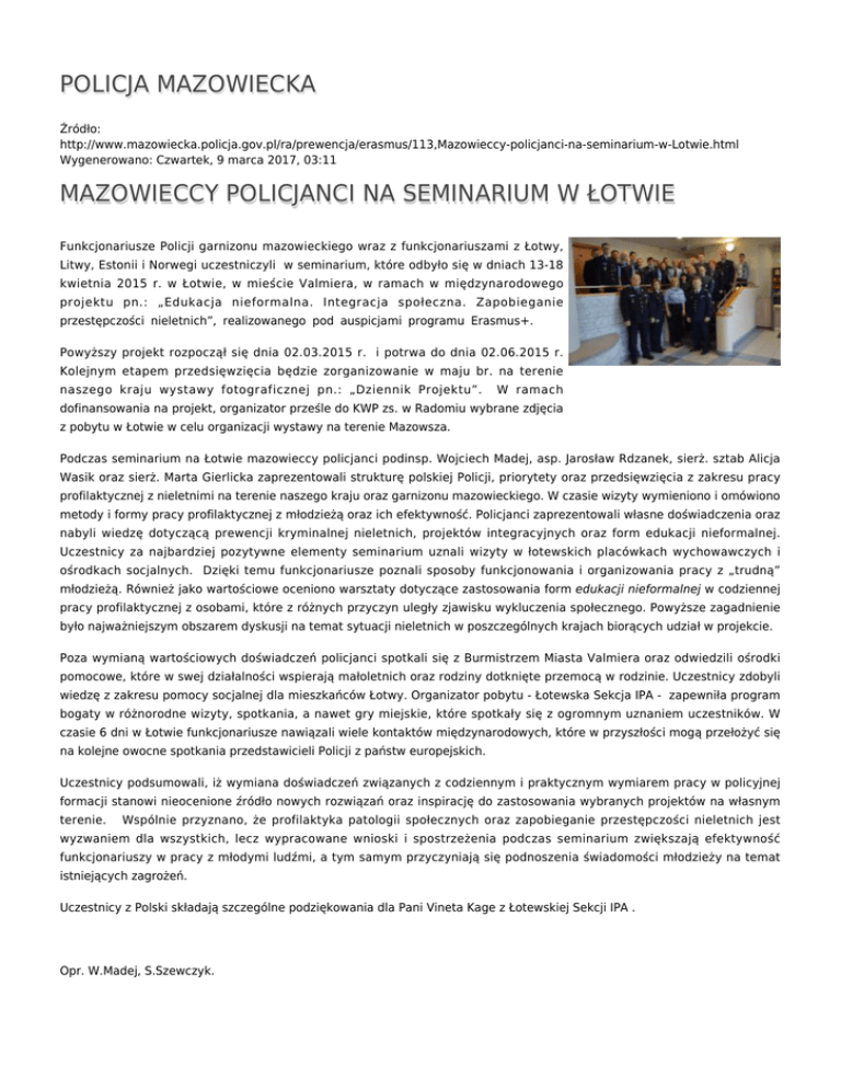 POLICJA MAZOWIECKA Źródło: http://www.mazowiecka.policja.gov.pl/ra/prewencja/erasmus/113,Mazowieccy-policjanci-na-seminarium-w-Lotwie.html Wygenerowano: Czwartek, 9 marca 2017, 03:11 MAZOWIECCY POLICJANCI NA SEMINARIUM W ŁOTWIE Funkcjonariusze Policji garnizonu mazowieckiego wraz z funkcjonariuszami z Łotwy, Litwy, Estonii i Norwegi uczestniczyli w seminarium, które odbyło się w dniach 13-18 kwietnia 2015 r. w Łotwie, w mieście Valmiera, w ramach w międzynarodowego projektu pn.: „Edukacja nieformalna. Integracja społeczna. Zapobieganie przestępczości nieletnich”, realizowanego pod auspicjami programu Erasmus+. Powyższy projekt rozpoczął się dnia 02.03.2015 r. i potrwa do dnia 02.06.2015 r. Kolejnym etapem przedsięwzięcia będzie zorganizowanie w maju br. na terenie naszego kraju wystawy fotograficznej pn.: „Dziennik Projektu”. W ramach dofinansowania na projekt, organizator prześle do KWP zs. w Radomiu wybrane zdjęcia z pobytu w Łotwie w celu organizacji wystawy na terenie Mazowsza. Podczas seminarium na Łotwie mazowieccy policjanci podinsp. Wojciech Madej, asp. Jarosław Rdzanek, sierż. sztab Alicja Wasik oraz sierż. Marta Gierlicka zaprezentowali strukturę polskiej Policji, priorytety oraz przedsięwzięcia z zakresu pracy profilaktycznej z nieletnimi na terenie naszego kraju oraz garnizonu mazowieckiego. W czasie wizyty wymieniono i omówiono metody i formy pracy profilaktycznej z młodzieżą oraz ich efektywność. Policjanci zaprezentowali własne doświadczenia oraz nabyli wiedzę dotyczącą prewencji kryminalnej nieletnich, projektów integracyjnych oraz form edukacji nieformalnej. Uczestnicy za najbardziej pozytywne elementy seminarium uznali wizyty w łotewskich placówkach wychowawczych i ośrodkach socjalnych. Dzięki temu funkcjonariusze poznali sposoby funkcjonowania i organizowania pracy z „trudną” młodzieżą. Również jako wartościowe oceniono warsztaty dotyczące zastosowania form edukacji nieformalnej w codziennej pracy profilaktycznej z osobami, które z różnych przyczyn uległy zjawisku wykluczenia społecznego. Powyższe zagadnienie było najważniejszym obszarem dyskusji na temat sytuacji nieletnich w poszczególnych krajach biorących udział w projekcie. Poza wymianą wartościowych doświadczeń policjanci spotkali się z Burmistrzem Miasta Valmiera oraz odwiedzili ośrodki pomocowe, które w swej działalności wspierają małoletnich oraz rodziny dotknięte przemocą w rodzinie. Uczestnicy zdobyli wiedzę z zakresu pomocy socjalnej dla mieszkańców Łotwy. Organizator pobytu - Łotewska Sekcja IPA - zapewniła program bogaty w różnorodne wizyty, spotkania, a nawet gry miejskie, które spotkały się z ogromnym uznaniem uczestników. W czasie 6 dni w Łotwie funkcjonariusze nawiązali wiele kontaktów międzynarodowych, które w przyszłości mogą przełożyć się na kolejne owocne spotkania przedstawicieli Policji z państw europejskich. Uczestnicy podsumowali, iż wymiana doświadczeń związanych z codziennym i praktycznym wymiarem pracy w policyjnej formacji stanowi nieocenione źródło nowych rozwiązań oraz inspirację do zastosowania wybranych projektów na własnym terenie. Wspólnie przyznano, że profilaktyka patologii społecznych oraz zapobieganie przestępczości nieletnich jest wyzwaniem dla wszystkich, lecz wypracowane wnioski i spostrzeżenia podczas seminarium zwiększają efektywność funkcjonariuszy w pracy z młodymi ludźmi, a tym samym przyczyniają się podnoszenia świadomości młodzieży na temat istniejących zagrożeń. Uczestnicy z Polski składają szczególne podziękowania dla Pani Vineta Kage z Łotewskiej Sekcji IPA . Opr. W.Madej, S.Szewczyk. Ocena: 0/5 (0) Tweetnij