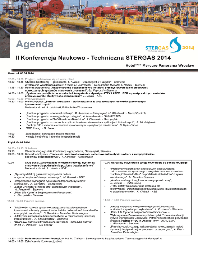 Czwartek 03.04.2014 12.00 - 13.30 Przyjazd, meldowanie się w Hotelu, obiad 13.30 - 13.45 Otwarcie Konferencji – gospodarze, L. Kuziela – Gazoprojekt, R. Wojniak – Siemens Wystąpienia współorganizatorów: Prezes M. Jastrzębski – Gazoprojekt, Dyrektor T. Haiduk – Siemens 13.45 - 14.30 Referat programowy: „Wszechstronne bezpieczeństwo instalacji przemysłowych dzięki stosowaniu nowoczesnych systemów sterowania procesami”, Sz. Paprocki – Siemens 14.30 - 15.00 „Systemowe podejście do wdrażania i korzystania z dyrektyw ATEX i ATEX USER w praktyce dużych zakładów przemysłowych i efektywność ekonomiczna", I. Rogala – ASE 15.00 - 15.30 Przerwa kawowa 15.30 - 18.00 Pierwszy panel: „Studium wdrożenia – doświadczenia ze zrealizowanych obiektów gazowniczych i petrochemicznych” Moderator: dr inż. A. Jabłoński, Politechnika Wrocławska 18.00 19.30 „Studium przypadku – terminal naftowy”, R. Swarbuła – Gazoprojekt, M. Wiśniewski – Merrid Controls „Studium przypadku – awaryjność gazociągów”, A. Nowakowski – GAZ-SYSTEM „Studium przypadku – PMG Kosakowo/Brzeźnica”, I. Filarowski – Gazoprojekt „Studium przypadku – znaczenie szybkości systemu sterowania w aplikacjach blokadowych”, P. Młodziejewski „Funkcje SIF z wieloma elementami wykonawczymi – przykłady i rozwiązania”, B. Ryś – Encon OMC Envag – D. Janasz Zakończenie pierwszego dnia Konferencji Kolacja koleżeńska i atrakcja (niespodzianka!) Piątek 04.04.2014 08.30 - 09.15 Śniadanie 09.30 Otwarcie drugiego dnia Konferencji – gospodarze, Gazoprojekt, Siemens 09.35 - 10.00 Referat tematyczny „Tendencje i możliwości rozwoju systemów automatyki i nadzoru z uwzględnieniem aspektów bezpieczeństwa”, T. Kamiński – Gazoprojekt 10.00 Drugi panel „Współczesne tendencje rozwoju systemów sterowania dla podniesienia poziomu bezpieczeństwa” Moderator: dr inż. A. Kozak – UDT „Systemy detekcji gazu oraz wykrywania pożaru w ujęciu bezpieczeństwa procesowego", M. Karolak – UDT „Współczesne wymagania rynku dla nadrzędnych systemów sterowania”, A. Zawadzki – Gazoprojekt „Loher Chemstar silniki do stref zagrożonych wybuchem”, A. Pozowski – Siemens „Plant Life Cycle” a Bezpieczeństwo Procesowe”, L. Błeszyński – Siemens 11.30 - 12.00 Przerwa kawowa "Możliwości rozwoju systemów zarządzania bezpieczeństwem i procesami w branży gazowniczej w świetle doświadczeń i standardów energetyki zawodowej”, D. Dziadek – Transition Technologies „Efektywne zarządzanie bezpieczeństwem w rozproszonej i złożonej infrastrukturze”, R. Szustakiewicz – Siemens "Bilansowy audyt efektywności energetycznej – metodyka audytu”, dr inż. P. Danielski – DB Energy 10.00 Warsztaty inżynierskie (sesje równoległe do panelu drugiego) "Problematyka pomiarów jakościowych gazu związana z dozowaniem do systemu gazowego biometanu oraz wodoru z aplikacji "Power-to-Gas" na podstawie doświadczeń z rynku niemieckiego", M. Masek – Siemens „Analiza wodnego i węglowodorowego punktu rosy”, D. Janasz – OMC Envag „Total Safety Comander jako platforma dla efektywnego wdrożenia systemu zarządzania bezpieczeństwem w przedsiębiorstwie”, K. Ciebień – ASE 11.30 - 12.00 Przerwa kawowa „Układy napędowe o regulowanej prędkości obrotowej w strefach zagrożonych wybuchem”, A. Pozowski – Siemens „Plant Life Cycle” a Bezpieczeństwo Procesowe – Wykorzystanie Zaawansowanych Narzędzi IT do minimalizacji ryzyka w projektach Gazowych i Petrochemicznych na przykładzie projektu „Pazflor FPSO in Angola” firmy TOTAL E&P, L. Błeszyński – Siemens „Przykłady praktycznego wykorzystania nowoczesnych metod symulacji i optymalizacji w procesach przesyłu gazu”, A. Piłat – Transition Technologies 13.30 - 14.00 Podsumowanie Konferencji, dr inż. M. Trajdos – Stowarzyszenie Bezpieczeństwa Technicznego Klub Paragraf 34 14.00 - 15.00 Zakończenie Konferencji, obiad