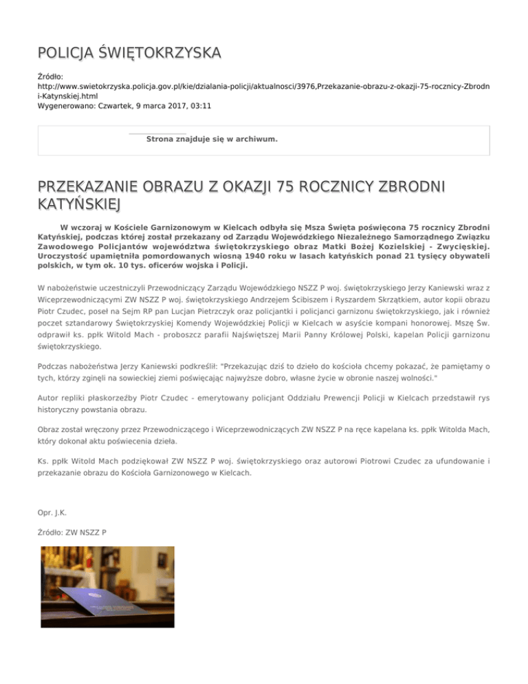 POLICJA ŚWIĘTOKRZYSKA Źródło: http://www.swietokrzyska.policja.gov.pl/kie/dzialania-policji/aktualnosci/3976,Przekazanie-obrazu-z-okazji-75-rocznicy-Zbrodn i-Katynskiej.html Wygenerowano: Czwartek, 9 marca 2017, 03:11 Strona znajduje się w archiwum. PRZEKAZANIE OBRAZU Z OKAZJI 75 ROCZNICY ZBRODNI KATYŃSKIEJ W wczoraj w Kościele Garnizonowym w Kielcach odbyła się Msza Święta poświęcona 75 rocznicy Zbrodni Katyńskiej, podczas której został przekazany od Zarządu Wojewódzkiego Niezależnego Samorządnego Związku Zawodowego Policjantów województwa świętokrzyskiego obraz Matki Bożej Kozielskiej - Zwycięskiej. Uroczystość upamiętniła pomordowanych wiosną 1940 roku w lasach katyńskich ponad 21 tysięcy obywateli polskich, w tym ok. 10 tys. oficerów wojska i Policji. W nabożeństwie uczestniczyli Przewodniczący Zarządu Wojewódzkiego NSZZ P woj. świętokrzyskiego Jerzy Kaniewski wraz z Wiceprzewodniczącymi ZW NSZZ P woj. świętokrzyskiego Andrzejem Ścibiszem i Ryszardem Skrzątkiem, autor kopii obrazu Piotr Czudec, poseł na Sejm RP pan Lucjan Pietrzczyk oraz policjantki i policjanci garnizonu świętokrzyskiego, jak i również poczet sztandarowy Świętokrzyskiej Komendy Wojewódzkiej Policji w Kielcach w asyście kompani honorowej. Mszę Św. odprawił ks. ppłk Witold Mach - proboszcz parafii Najświętszej Marii Panny Królowej Polski, kapelan Policji garnizonu świętokrzyskiego. Podczas nabożeństwa Jerzy Kaniewski podkreślił: "Przekazując dziś to dzieło do kościoła chcemy pokazać, że pamiętamy o tych, którzy zginęli na sowieckiej ziemi poświęcając najwyższe dobro, własne życie w obronie naszej wolności." Autor repliki płaskorzeźby Piotr Czudec - emerytowany policjant Oddziału Prewencji Policji w Kielcach przedstawił rys historyczny powstania obrazu. Obraz został wręczony przez Przewodniczącego i Wiceprzewodniczących ZW NSZZ P na ręce kapelana ks. ppłk Witolda Mach, który dokonał aktu poświecenia dzieła. Ks. ppłk Witold Mach podziękował ZW NSZZ P woj. świętokrzyskiego oraz autorowi Piotrowi Czudec za ufundowanie i przekazanie obrazu do Kościoła Garnizonowego w Kielcach. Opr. J.K. Źródło: ZW NSZZ P Zainstaluj wtyczkę Flash, aby zobaczyć odtwarzacz. pobierz film - 29.84 MB Ocena: 5/5 (1) Tweetnij