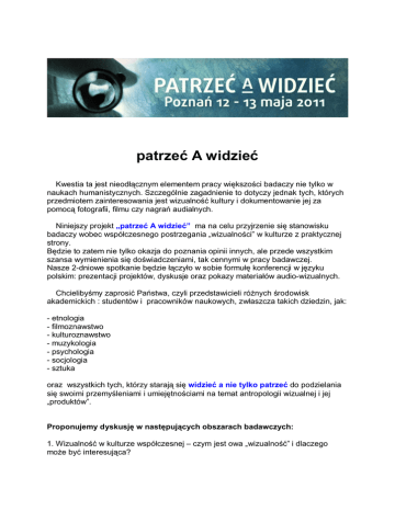 patrzeć A widzieć Kwestia ta jest nieodłącznym elementem pracy większości badaczy nie tylko w naukach humanistycznych. Szczególnie zagadnienie to dotyczy jednak tych, których przedmiotem zainteresowania jest wizualność kultury i dokumentowanie jej za pomocą fotografii, filmu czy nagrań audialnych. Niniejszy projekt „patrzeć A widzieć” ma na celu przyjrzenie się stanowisku badaczy wobec współczesnego postrzegania „wizualności” w kulturze z praktycznej strony. Będzie to zatem nie tylko okazja do poznania opinii innych, ale przede wszystkim szansa wymienienia się doświadczeniami, tak cennymi w pracy badawczej. Nasze 2-dniowe spotkanie będzie łączyło w sobie formułę konferencji w języku polskim: prezentacji projektów, dyskusje oraz pokazy materiałów audio-wizualnych. Chcielibyśmy zaprosić Państwa, czyli przedstawicieli różnych środowisk akademickich : studentów i pracowników naukowych, zwłaszcza takich dziedzin, jak: - etnologia - filmoznawstwo - kulturoznawstwo - muzykologia - psychologia - socjologia - sztuka oraz wszystkich tych, którzy starają się widzieć a nie tylko patrzeć do podzielania się swoimi przemyśleniami i umiejętnościami na temat antropologii wizualnej i jej „produktów”. Proponujemy dyskusję w następujących obszarach badawczych: 1. Wizualność w kulturze współczesnej – czym jest owa „wizualność” i dlaczego może być interesująca? 2.Przedmiot i zakres badań wizualności – co możemy badać i jakie ma to znaczenie? 3.Wykorzystywanie technik audio-wizualnych jako sposobu „pisania” i publikacji – tradycyjne notatki, czy nagrania ? Powyższe zagadnienia są jedynie propozycjami, nie stanowią ograniczenia w doborze tematu. Zapraszamy również do zgłaszania własnych nagrań wizualnych, których prezentacja będzie częścią konferencji. Zastrzegamy sobie prawo do wyboru referatów oraz nagrań. Nie ponosimy kosztów podróży i utrzymania podczas konferencji, udział ma charakter nieodpłatny. Wszystkich zainteresowanych prosimy o przesłanie abstraktów wystąpień i kart zgłoszeniowych do 15 marca na adres mailowy: Julia Stec, członkini sekcji antropologii wizualnej: [email protected]