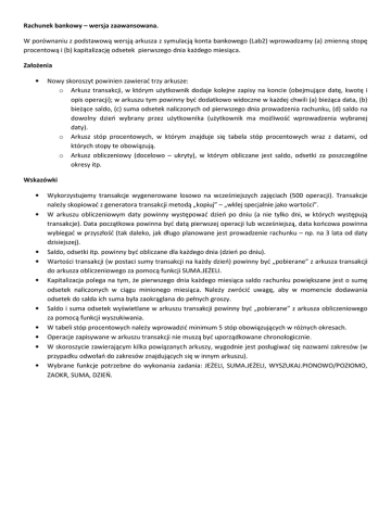 Rachunek bankowy – wersja zaawansowana. W porównaniu z podstawową wersją arkusza z symulacją konta bankowego (Lab2) wprowadzamy (a) zmienną stopę procentową i (b) kapitalizację odsetek pierwszego dnia każdego miesiąca. Założenia • Nowy skoroszyt powinien zawierać trzy arkusze: o Arkusz transakcji, w którym użytkownik dodaje kolejne zapisy na koncie (obejmujące datę, kwotę i opis operacji); w arkuszu tym powinny być dodatkowo widoczne w każdej chwili (a) bieżąca data, (b) bieżące saldo, (c) suma odsetek naliczonych od pierwszego dnia prowadzenia rachunku, (d) saldo na dowolny dzień wybrany przez użytkownika (użytkownik ma możliwość wprowadzenia wybranej daty). o Arkusz stóp procentowych, w którym znajduje się tabela stóp procentowych wraz z datami, od których stopy te obowiązują. o Arkusz obliczeniowy (docelowo – ukryty), w którym obliczane jest saldo, odsetki za poszczególne okresy itp. Wskazówki • • • • • • • • • • Wykorzystujemy transakcje wygenerowane losowo na wcześniejszych zajęciach (500 operacji). Transakcje należy skopiować z generatora transakcji metodą „kopiuj” – „wklej specjalnie jako wartości”. W arkuszu obliczeniowym daty powinny występować dzień po dniu (a nie tylko dni, w których występują transakcje). Data początkowa powinna być datą pierwszej operacji lub wcześniejszą, data końcowa powinna wybiegać w przyszłość (tak daleko, jak długo planowane jest prowadzenie rachunku – np. na 3 lata od daty dzisiejszej). Saldo, odsetki itp. powinny być obliczane dla każdego dnia (dzień po dniu). Wartości transakcji (w postaci sumy transakcji na każdy dzień) powinny być „pobierane” z arkusza transakcji do arkusza obliczeniowego za pomocą funkcji SUMA.JEŻELI. Kapitalizacja polega na tym, że pierwszego dnia każdego miesiąca saldo rachunku powiększane jest o sumę odsetek naliczonych w ciągu minionego miesiąca. Należy zwrócić uwagę, aby w momencie dodawania odsetek do salda ich suma była zaokrąglana do pełnych groszy. Saldo i suma odsetek wyświetlane w arkuszu transakcji powinny być „pobierane” z arkusza obliczeniowego za pomocą funkcji wyszukiwania. W tabeli stóp procentowych należy wprowadzić minimum 5 stóp obowiązujących w różnych okresach. Operacje zapisywane w arkuszu transakcji nie muszą być uporządkowane chronologicznie. W skoroszycie zawierającym kilka powiązanych arkuszy, wygodnie jest posługiwać się nazwami zakresów (w przypadku odwołań do zakresów znajdujących się w innym arkuszu). Wybrane funkcje potrzebne do wykonania zadania: JEŻELI, SUMA.JEŻELI, WYSZUKAJ.PIONOWO/POZIOMO, ZAOKR, SUMA, DZIEŃ.