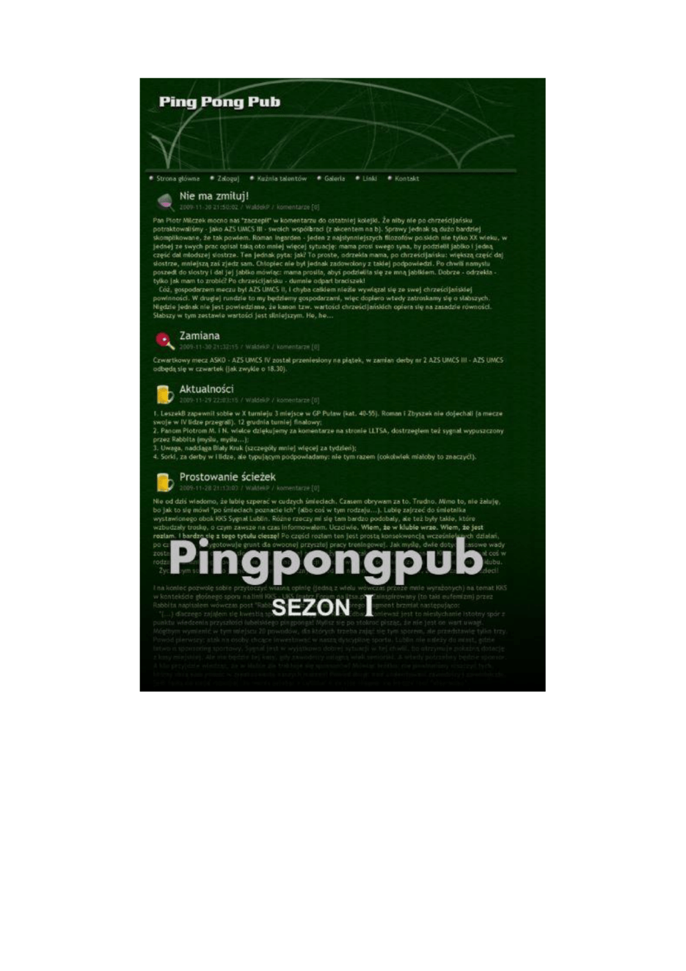 Waldemar Pycka (i inni) Pingpongpub. Sezon I - 2008/2009 www.pingpongpub.cba.pl Strona sympatyków tenisa stołowego w AZS UMCS Lublin Autor strony: Waldemar Pycka Projekt okładki Radosław Pycka Skład Waldemar Pycka Zdjęcia Waldemar Pycka © Waldemar Pycka ISBN 978-83-929628-1-6 Waldemar Pycka tel. 605 53 19 17 [email protected] Książkę pozwalam sobie zadedykować wszystkim paniom „uczestniczącym” w eksperymencie naukowym, o jakim mowa na stronie 71. Tekst niniejszej książki dostępny jest bezpłatnie na stronie www.pingpongpub.cba.pl oraz www.waldemar.pycka.com Protokół spotkania Rozgrzewka I Set pierwszy: Trenuję i gram, więc jestem i myślę 7 Wrzesień 2008 7 No to „pajechali”. Sympatycy AZS UMCS – łączcie się! Aktualny stan posiadania. Treningi. Linki, sznurki, powrozy i inne kołchozy. Nadia – GRATULACJE!!! Zebranie w LLTSA. Megaotwarcie sezonu w AZS UMCS. Treningi. Biedny ten nasz internet. Treningi. Dobra porażka. Kim jest Barman? Październik 2008 19 Sprzedam/kupię. Zaproszenie. Pingpongowa uczta w Rzeszowie. UKS Ruch I Edbar – KTS Bielsk Podlaski 10:1. Zaliczyliśmy mały zawał. Treningi. Listopad 2008 23 Trudne zadania przed naszymi drużynami. Nadciąga krach w pppubie. Ich już nie ma u nas. Nowi pubowicze. Treningi. Przełamana seria porażek. Grudzień 2008 27 Ważne zwycięstwo naszej „czwórki”. Remis ASZów tzn. AZSów. Kolejny udany czwartek. Klejenie w praktyce. Miłosierne huknięcie. Cieniutko, oj bardzo. Cały rok w łapkach świnki. Styczeń 2009 31 Dwóch na dwóch. Jest40! Aleks Pod 50 – AZS UMCS II 4:6. Luty 2009 32 Co się stało z moją rakietką??? Grały, grały. Puławy II. Z wizytą na MOSIR-ze. Marzec 2009 34 Dwóch i pół przeciwko trzem. Czas na dyskusję. Gala – AZS UMCS III 2:8. Jest awans do I ligi LLTSA! O kurde, znów powiedzą, że... Powalczyliśmy w Puławach. Po-Jedynek. Miłosierne huknięcie II. Kwiecień/Maj 2009 38 Poryczałem się jak bóbr... AZS UMCS IV zwycięża w IV lidze! Nieoczekiwany finał w II lidze. Występy Pubowiczów w Puławach. Podsumowanie sezonu AZS UMCS IV. 50 meczów AZS UMCS III w ligach LLTSA. Konieczna pomoc – potrzebna transfuzja! Dwie wygrane i blamaż. Jedynka – tak, trójka – nie. Zostaliśmy zaatakowani przez fanów. Zwycięski Konradzie! Dzisiaj zakończymy sezon w LLTSA. Big-(aj) Day! Pingpongpub zafalował!!! Wakacje 2009 46 Najbardziej lubelski z lubelskich. Wyróżnienie Pana Jarosława Maruszczaka. Wielki final sezonu przed nami! Polska – Serbia 1:1. Czeski film. Merci. Reklama dźwignią sportu. Kto czyta, nie błądzi. BMW wycofuje się z F1! Piotropulos Brodakis w Lublinie! Zaproszenie na Zakończenie. Prognoza pogody... Metaxa Cup. Zebranie w LLTSA. Apel do Zarządu LLTSA. Set drugi: Kuźnia talentów 53 Wspomnienia po Pustyni Lublin. Najbardziej lubelski z lubelskich. Konrad Kulpa – Etap lubelski. Konrad Kulpa – sezon 2008/09. Rozgrywki szkolne (2008/09) – wojewódzkie finały.IX LO najlepsze w Lublinie. I Memoriał Macieja Marczewskiego. Podsumowanie drugiej fazy OTK-ów. Sukces Sylwii Pawlak w MW Seniorek. Indywidualne Mistrzostwa Województwa. Mistrzostwa Polski Kadetek i Kadetów – Kazimierza Wielka. Medal w Mistrzostwach Polski Skrzatów. Mistrzostwa Polski. Piekne zakończenie sezonu. I WTK Seniorek i Seniorów. Konrad na Mistrzostwach Świata Juniorów! Set trzeci: Felietony i inne przynudy 63 Gorsi wyparli lepszych. Drogi Mistrzu. 100 powodów porażki. Nałęczów – turniej mizoginistów! Nałęczów – raz jeszcze. Lep „Kucharski”. Ksenofobia PZTS. Ciężko być kibicem pingponga. Gdzie się podziały złote jaja? Czeka nas świąteczna przerwa. Pochwała i … zachwyt? Pię(ś)ć refleksji. Sukces naukowy sekcji tenisa stołowego AZS UMCS. Kim jesteś pingpongnauto? W odpowiedzi na listy. Literatura przedmiotu. Pan Włodzimierz nie rozumie. Paradoks serwisu. Złote prawo natury. O dwóch takich, co wrócili z Hadesu. Brawa dla Radzynia Podlaskiego. Kim jest amator? Wojewódzki AZS przytajniaczył. Cześć Edmund! Awantura o miejsca w kadrze. Poczytaj mi...I. Poczytaj mi...Wstęp. Poczytaj mi... Antycypacja. Poczytaj mi... Czucie piłki. Poczytaj mi... Wprowadzenie. Poczytaj mi... Okładziny. Poczytaj mi... Gładka przeciwko czopom długim (1). Poczytaj mi...Gładka przeciwko czopom długim (2). Poczytaj mi...Gładka przeciwko czopom długim (3). Poczytaj mi... i potrzymaj paletkę. Lubelski koszmar. Fotki z naszej gablotki 89 I Rozgrzewka To był bardzo udany sezon dla naszych Pubowiczów.1 Drużyny AZS UMCS występujące w rozgrywkach lubelskiej ligi amatorów osiągnęły wszystko, co było w ich zasięgu. AZS UMCS IV po bardzo emocjonującej walce zwyciężył w rozgrywkach IV ligi; AZS UMCS III zdecydowanie wygrał II ligę; AZS UMCS II zdołał utrzymać się w I lidze LLTSA, natomiast naszej „Jedynce” przyszło to bez większych problemów. Stosowne dane znaleźć można na stronie www.lltsa.pl. Udział naszych drużyn w rozgrywkach pionu akademickiego zakończył się tam, gdzie powinien, zważając na poziom drużyn biorących udział w turnieju eliminacyjnym. 2 Z rozmów ze zwycięzcami turnieju eliminacyjnego w Lublinie – zawodnikami AZS Politechniki Rzeszowskiej, zdobywcami złotego medalu Mistrzostw Polski w turnieju finałowym, wnoszę, że ich wizyta w Lublinie bardzo przypadła im do gustu.3 Znakomicie wypadły też drużyny zaprzyjaźnione z naszym Pubem. W I lidze PZTS bardzo udanie wystąpił zespół księdza Andrzeja Łuszcza – UPKS Dawid Tarnogród, któremu niewiele brakowało, by zagrać w barażach o Ekstraklasę! W II lidze PZTS zagrały trzy zespoły: UKS Ruch Edbar Lublin, KKS Sygnał Lublin I oraz GLKS Felix Rossosz. Felix, mimo kłopotów zdrowotnych kapitana, pewnie utrzymał się w lidze, KKS Sygnał I – beniaminek przez wiele tygodni utrzymywał się w ścisłej czołówce, natomiast UKS Ruch Edbar – także beniaminek II ligi - zwyciężył rywalizację podlasko-lubelską, zdobywaj