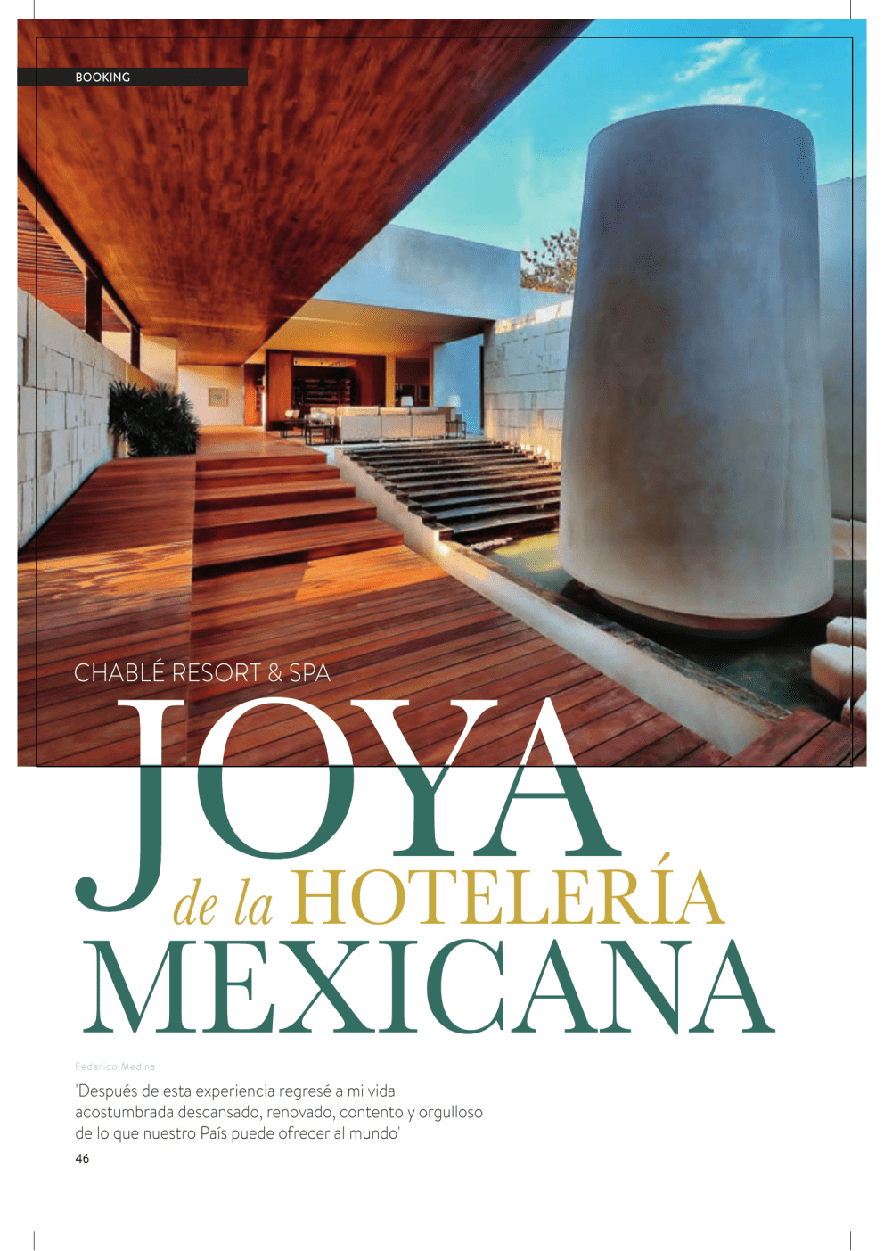 REALTY BOOKING CHABLÉ RESORT & SPA de la HOTELERÍA MEXICANA Federico Medin a 'Después de esta experiencia regresé a mi vida acostumbrada descansado, renovado, contento y orgulloso de lo que nuestro País puede ofrecer al mundo' 46 T uve la oportunidad, en compañía de mi esposa y una pareja de amigos, de conocer y disfrutar de unos días en el Chablé Resort & Spa localizado en las cercanías de Chocholá, población situada a unos 20 ó 30 minutos en automóvil desde Mérida, sobre la carretera a Campeche. Por mi esposa supe de la existencia del resort. Gracias a Facebook se enteró que cerca de Mérida había abierto sus puertas este paraíso de más de 300 hectáreas, al que catalogaban como el mejor y más bonito del mundo. PAISAJE ATRACTIVO A PLENITUD Después de pasar una semana en la playa de Cancún llegamos a Chablé tras cuatro horas y media en carretera. Sabemos que también puede tomarse un vuelo desde Monterrey a Mérida y que el hotel ofrece, a quien solicite, el traslado de la terminal aérea a sus instalaciones. El Resort se construyó en los terrenos de lo que fue una hacienda henequenera manteniendo y restaurando algunas de las edificaciones originales del Siglo XIX y desarrollando un paisaje muy atractivo, producto de un largo y meticuloso proceso de planeación. Es excepcional la conjunción de instalaciones que reflejan un pasado exitoso de la región aunado a las actuales, que conforman un presente moderno, cómodo y funcional junto con elementos naturales únicos. Otoño, invierno y primavera son estaciones adecuadas para disfrutar a plenitud. Fot o s: Co rt esí a C h abl é Re so r t & Spa CON VEGETACIÓN ABUNDANTE > Tres temas primordiales abarca el viaje terapéutico por el spa: Fuente de la juventud (Fluir), Árbol de la Vida (Balancear) y El cielo en la tierra (Inspirar) Llegamos poco después de mediodía. Nos identificamos en la caseta e inmediatamente nos dirigieron a una pequeña edificación donde hicimos el registro. Acto seguido, llegó una dama muy amable en un carrito de golf para conducirnos a uno de los restaurantes y así comer mientras ella llevaba nuestro equipaje a la villa privada que ocuparía cada pareja. Existen 38 villas privadas, 1 villa presidencial y 1 villa real. En unos cuantos minutos apreciamos la belleza de los jardines y los árboles imponentes que tapizaban el paisaje. Después de haber disfrutado de los platillos fuimos guiados a nuestros alojamientos a través de caminitos, unos pavimentados y otros empedrados, flanqueados por una vegetación tropical cerrada. TOTALMENTE EQUIPADA La arquitectura moderna nos causó una muy grata impresión. Cada villa cuenta en su exterior con alberca privada y un espacio semi-abierto, muy disfrutable, con piso de madera, amueblado informalmente, banca para exteriores, mesita con sillas y ventilador de techo. Al lado de la alberca, dos camastros y una hamaca. El interior comprende una recámara espaciosa, bien amueblada y decorada en forma sobria y elegante; closet suficiente, espacio cerrado y bien ventilado con su inodoro, tocador con dos lavabos y muro traslúcido hacia el exterior, que permite disfrutar de la vista de la abundante vegetación que rodea la casa. La ducha es tan diversa como lo desee el huésped. Desde bañarse bajo un techo de madera y puerta de cristal, hasta el contacto íntimo con la naturaleza dentro de una privacidad total, en el que la vegetación tan tupida impide toda posibilidad de ser observado. > Todos los días, entre las 7:00 y 8:00 horas, se puede disfrutar de un desayuno previo que dejan a los huéspedes en el área de su alberca 29 BOOKING > El spa cuenta con 14 salas de tratamientos, una sala de vapor, un sauna, una cabina de sal y un flotarium AMENIDADES PARA TODOS Debe visitarse el spa de estilo prehispánico y última generación, muy bien v equipado y situado al lado de un cenote que existe dentro de la propiedad. Además, hay gimnasio y salón de belleza con personal muy preparado que busca el relajamiento pleno en cada huésped. La oferta culinaria ha sido diseñada por el aclamado chef Jorge Vallejo. Además, el chef ejecutivo Luis Ronzón mejora la experiencia gastronómica en los restaurantes basándose en la cocina orgánica y de temporada, con los ingredientes más frescos para recrear los típicos platillos mayas. > La instalación tiene hidromasajes calientes y fríos, un circuito de agua con diferentes tipos de presión al ducharse, un área de relajación y una alberca 30