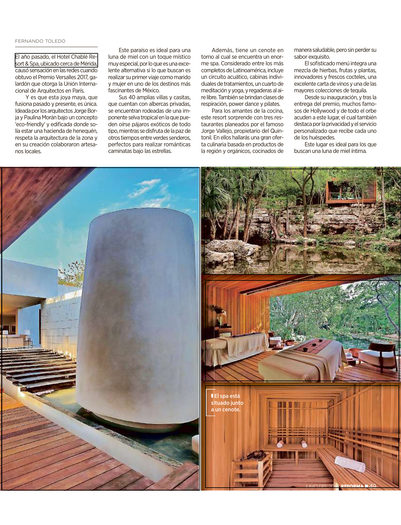 Fernando Toledo El año pasado, el Hotel Chablé Resort & Spa, ubicado cerca de Mérida, causó sensación en las redes cuando obtuvo el Premio Versalles 2017, galardón que otorga la Unión Internacional de Arquitectos en París. Y es que esta joya maya, que fusiona pasado y presente, es única. Ideada por los arquitectos Jorge Borja y Paulina Morán bajo un concepto 'eco-friendly' y edificada donde solía estar una hacienda de henequén, respeta la arquitectura de la zona y en su creación colaboraron artesanos locales. Este paraíso es ideal para una luna de miel con un toque místico muy especial, por lo que es una excelente alternativa si lo que buscan es realizar su primer viaje como marido y mujer en uno de los destinos más fascinantes de México. Sus 40 amplias villas y casitas, que cuentan con albercas privadas, se encuentran rodeadas de una imponente selva tropical en la que pueden oírse pájaros exóticos de todo tipo, mientras se disfruta de la paz de otros tiempos entre verdes senderos, perfectos para realizar románticas caminatas bajo las estrellas. Además, tiene un cenote en torno al cual se encuentra un enorme spa. Considerado entre los más completos de Latinoamérica, incluye un circuito acuático, cabinas individuales de tratamientos, un cuarto de meditación y yoga, y regaderas al aire libre. También se brindan clases de respiración, power dance y pilates. Para los amantes de la cocina, este resort sorprende con tres restaurantes planeados por el famoso Jorge Vallejo, propietario del Quintonil. En ellos hallarás una gran oferta culinaria basada en productos de la región y orgánicos, cocinados de manera saludable, pero sin perder su sabor exquisito. El sofisticado menú integra una mezcla de hierbas, frutas y plantas, innovadores y frescos cocteles, una excelente carta de vinos y una de las mayores colecciones de tequila. Desde su inauguración, y tras la entrega del premio, muchos famosos de Hollywood y de todo el orbe acuden a este lugar, el cual también destaca por la privacidad y el servicio personalizado que recibe cada uno de los huéspedes. Este lugar es ideal para los que buscan una luna de miel íntima. z El spa está situado junto a un cenote. junio del 2018 reforma ■ 49