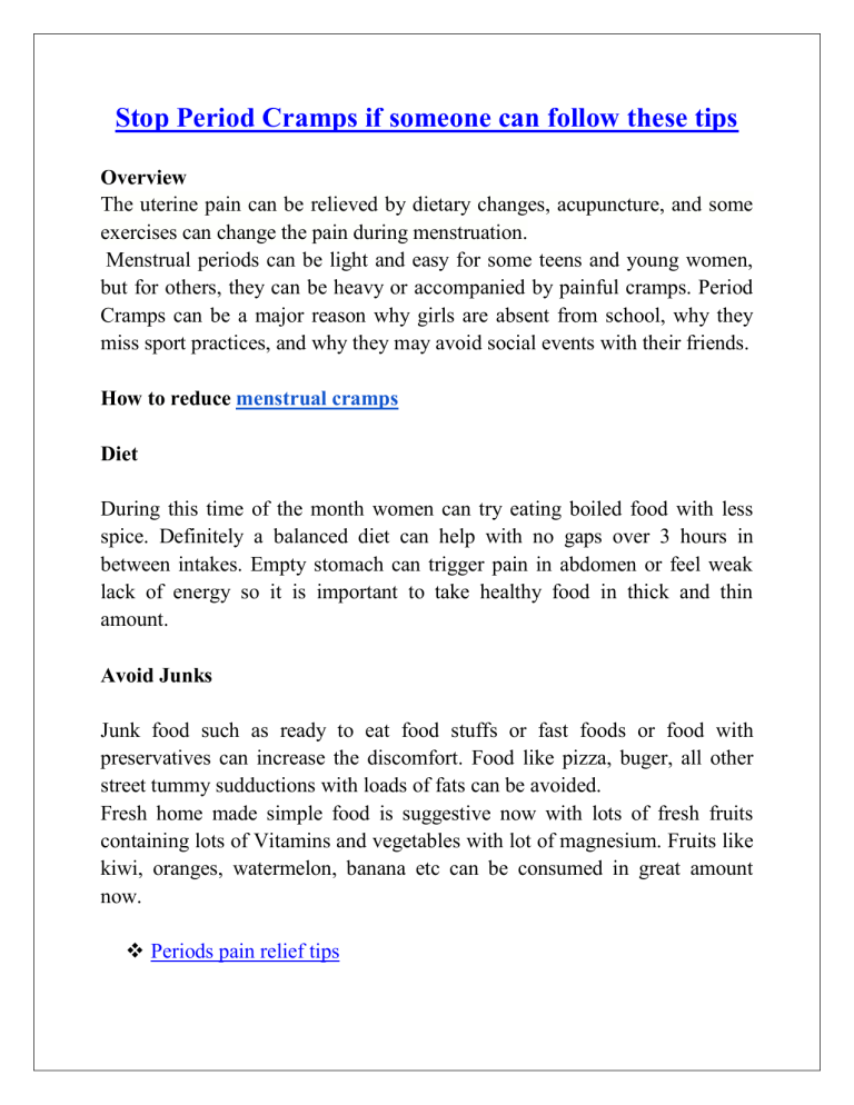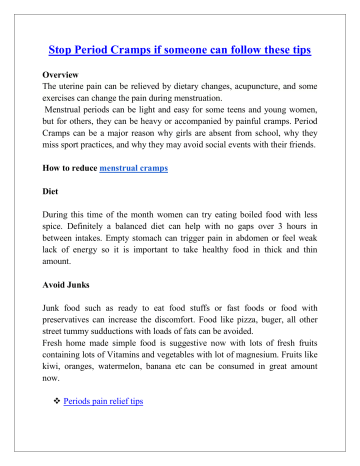 Stop Period Cramps if someone can follow these tips Overview The uterine pain can be relieved by dietary changes, acupuncture, and some exercises can change the pain during menstruation. Menstrual periods can be light and easy for some teens and young women, but for others, they can be heavy or accompanied by painful cramps. Period Cramps can be a major reason why girls are absent from school, why they miss sport practices, and why they may avoid social events with their friends. How to reduce menstrual cramps Diet During this time of the month women can try eating boiled food with less spice. Definitely a balanced diet can help with no gaps over 3 hours in between intakes. Empty stomach can trigger pain in abdomen or feel weak lack of energy so it is important to take healthy food in thick and thin amount. Avoid Junks Junk food such as ready to eat food stuffs or fast foods or food with preservatives can increase the discomfort. Food like pizza, buger, all other street tummy sudductions with loads of fats can be avoided. Fresh home made simple food is suggestive now with lots of fresh fruits containing lots of Vitamins and vegetables with lot of magnesium. Fruits like kiwi, oranges, watermelon, banana etc can be consumed in great amount now. Periods pain relief tips Dark chocolates Dark chocolates are the rich sources of magnesium, which not only tempers moods swings, but it also helps regulate serotonin—the happy hormone. To get the required amount of serotonin, stick with chocolate that's 60% cacao or higher. What other symptoms do girls have during their periods and during menstrual cramps? Girls may have other symptoms, such as: ● ● ● Nausea (feeling like you want to throw up) Vomiting (throwing up) Loose bowel movements/diarrhea ● ● ● ● Constipation Bloating in your belly area Headaches Lightheadedness (feeling faint) Sorting out the diet is a great way to reduce PMS symptoms, but sometimes it just isn’t enough. If it needs a helping hand to manage symptoms, and want to stick to natural remedies, it is always welcomed to stick to the natural remedies. This herbal remedy has always been safe for use in relieving PMS symptoms, including cramps, breast tenderness, bloating, irritability, and mood swings. Author Author is professional gynecologist from Mumbai, India. She create a sense of awareness against painful periods amongst young & adolescent girls, spreading the message - periods are normal, period pain is not.