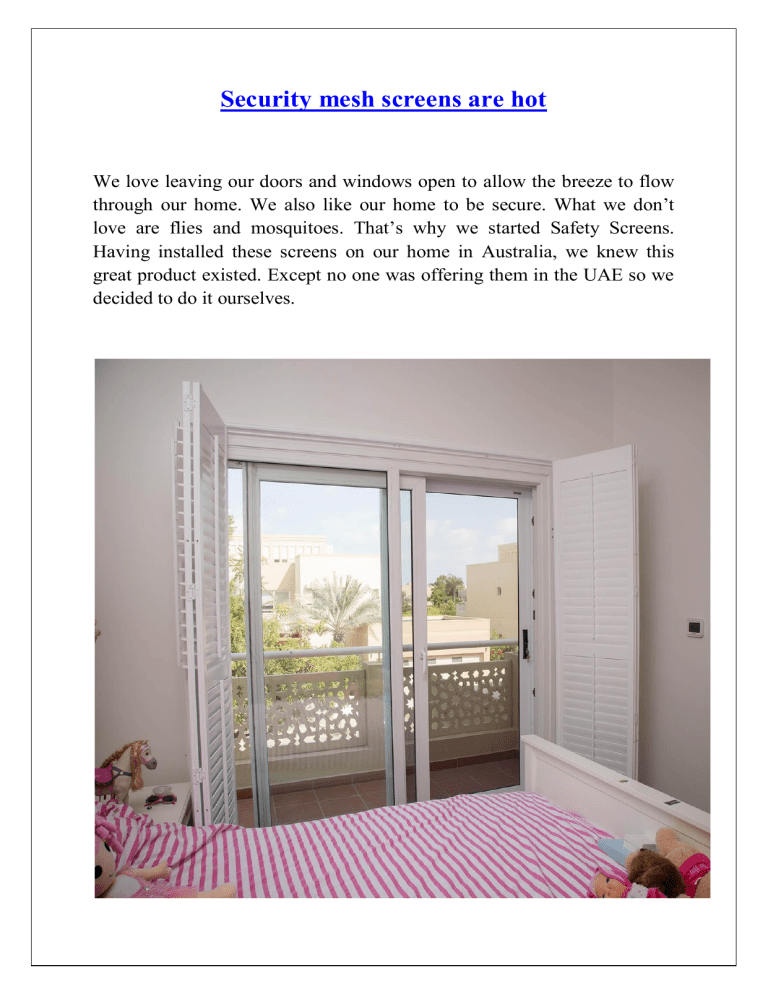 Security mesh screens are hot We love leaving our doors and windows open to allow the breeze to flow through our home. We also like our home to be secure. What we don’t love are flies and mosquitoes. That’s why we started Safety Screens. Having installed these screens on our home in Australia, we knew this great product existed. Except no one was offering them in the UAE so we decided to do it ourselves. We come to work each day to fabricate premium grade woven stainless steel mesh screens. We are still the only ones currently offering these screens in the UAE. We’re not trying to conquer the world so there’s nothing to distract us. We have a team of experienced craftsman and engineers who take pride in every screen they build. Each screen is custom made to measure so we can’t afford mistakes. The team cut them with an experienced eye, and tape measure, to the match the size of the individual door or window. Much of the work that goes into a screen is unseen. The woven steel mesh is secured with a patented technique within an aluminium frame. Skilled hands and careful fixing are required to secure the mesh in place. It’s this underground work that ensures the screens offer the highest levels of security and robustness. It’s what gives our screens the edge. We use the finest quality materials and let our metalsmiths do the rest. It’s a dance between the metalsmith, his tools and the steel. It’s mesmerizing to watch. We also love how long the screens last. You don’t have to be in Dubai long to see the state of the cheap fiberglass fly screens found on most villas. The other common type of screen in the region is the roll up insect screen. These screens also don’t last the test of time. Their roller mechanisms are prone to fail along with the small plastic clips that hold the screen in place. Our screens are made from steel and aluminium so we know they will last. The metals are powder coated so they won’t rust and can be colour matched to your existing door and window frames. We are so confident of their durability that they come with a ten year warranty. fly screen door fly screen mesh mosquito net fly screen repair While security isn’t a big concern for many residents in the UAE, the screens are so robust that they pass the Australian security standards for mesh screens. This means that you can leave your glass doors and windows open and have your villas secured with a security rated screen. The screens come with a triple locking mechanism and are deep counter sunk into the existing wall structure for added security. We like to sleep with our doors and windows open during the cooler months and with the security rating offered by the screens you can sleep soundly at night without worrying about intruders. Please contact for more information :- https://safetyscreens.ae/ We are passionate about insect screens. Our mission is to make these premium stainless steel screens available to everyone in Dubai, Abu Dhabi and across the UAE.