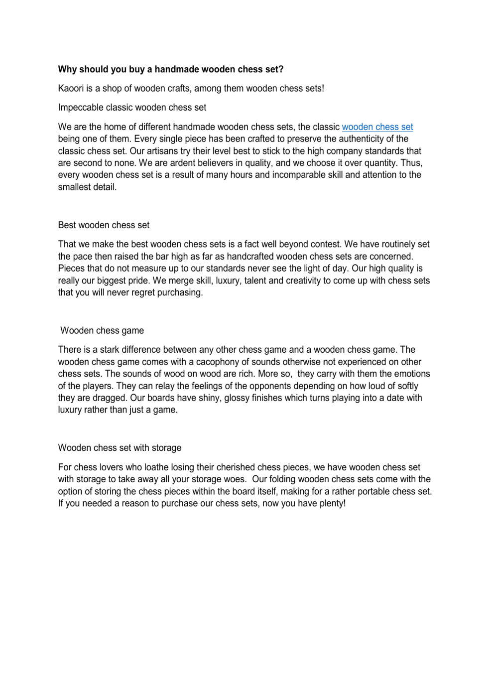 Why should you buy a handmade wooden chess set? Kaoori is a shop of wooden crafts, among them wooden chess sets! Impeccable classic wooden chess set We are the home of different handmade wooden chess sets, the classic wooden chess set being one of them. Every single piece has been crafted to preserve the authenticity of the classic chess set. Our artisans try their level best to stick to the high company standards that are second to none. We are ardent believers in quality, and we choose it over quantity. Thus, every wooden chess set is a result of many hours and incomparable skill and attention to the smallest detail. Best wooden chess set That we make the best wooden chess sets is a fact well beyond contest. We have routinely set the pace then raised the bar high as far as handcrafted wooden chess sets are concerned. Pieces that do not measure up to our standards never see the light of day. Our high quality is really our biggest pride. We merge skill, luxury, talent and creativity to come up with chess sets that you will never regret purchasing. Wooden chess game There is a stark difference between any other chess game and a wooden chess game. The wooden chess game comes with a cacophony of sounds otherwise not experienced on other chess sets. The sounds of wood on wood are rich. More so, they carry with them the emotions of the players. They can relay the feelings of the opponents depending on how loud of softly they are dragged. Our boards have shiny, glossy finishes which turns playing into a date with luxury rather than just a game. Wooden chess set with storage For chess lovers who loathe losing their cherished chess pieces, we have wooden chess set with storage to take away all your storage woes. Our folding wooden chess sets come with the option of storing the chess pieces within the board itself, making for a rather portable chess set. If you needed a reason to purchase our chess sets, now you have plenty!