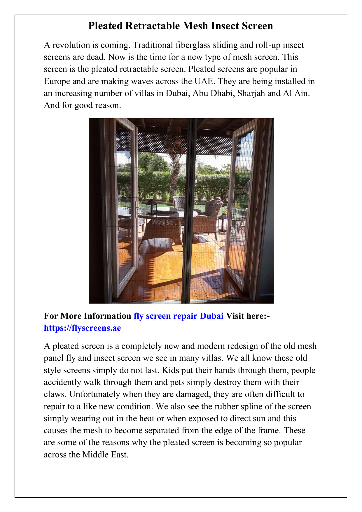 Pleated Retractable Mesh Insect Screen A revolution is coming. Traditional fiberglass sliding and roll-up insect screens are dead. Now is the time for a new type of mesh screen. This screen is the pleated retractable screen. Pleated screens are popular in Europe and are making waves across the UAE. They are being installed in an increasing number of villas in Dubai, Abu Dhabi, Sharjah and Al Ain. And for good reason. For More Information fly screen repair Dubai Visit here:https://flyscreens.ae A pleated screen is a completely new and modern redesign of the old mesh panel fly and insect screen we see in many villas. We all know these old style screens simply do not last. Kids put their hands through them, people accidently walk through them and pets simply destroy them with their claws. Unfortunately when they are damaged, they are often difficult to repair to a like new condition. We also see the rubber spline of the screen simply wearing out in the heat or when exposed to direct sun and this causes the mesh to become separated from the edge of the frame. These are some of the reasons why the pleated screen is becoming so popular across the Middle East. Sliding screen doors fly screen mesh The pleated screen is designed with no mechanical parts. If you have experience with the commonly found roll-up screen you will know the mechanical system often breaks, along with the edges of the screen working their way out of the guide rails. With the pleated system you manually slide the screen in place and it is secured with a magnet. That’s it. Nothing fancy and nothing to go wrong with the design. They are also easy to repair if they do get damaged. We can slide the old mesh out and slide a new replacement mesh screen in. A new mesh costs about half the price of the original screen system. The frame is constructed from a powder coated aluminium frame meaning it won’t rust and often comes with a generous warranty period. A five year warranty is typical with these screen frames. Additionally, as the frame is powder coated, it can be custom colour matched to your existing frame colours. Retractable screens Mesh screen window The other innovation currently becoming available in the UAE is the trackless pleated screen. These screens use a unique design feature to remove the bottom rail system. This allows the trackless screen to be fitted to doors with a low, or no bottom track. They are perfect for French doors and hinged doors that have a flat threshold. A unobtrusive 5mm high guide is placed along the floor which provides a track for the feet of the trackless screen. The screens can also be joined together to so they can cover wide openings of up to 5m. Wide opening have traditionally been difficult and expensive to cover with a mesh screen. Some companies offer roll out screens but these can be prone to failure in our environment. The trackless system however, now allows doors such as wide bi-folds to have a simple, cost effective insect barrier across the full opening. If you would like to discuss your screen requirements and view examples of these modern insect screens please contact www.flyscreens.ae who are a market leader in Dubai for their pleated screens, safety screens and of course the new trackless screens.