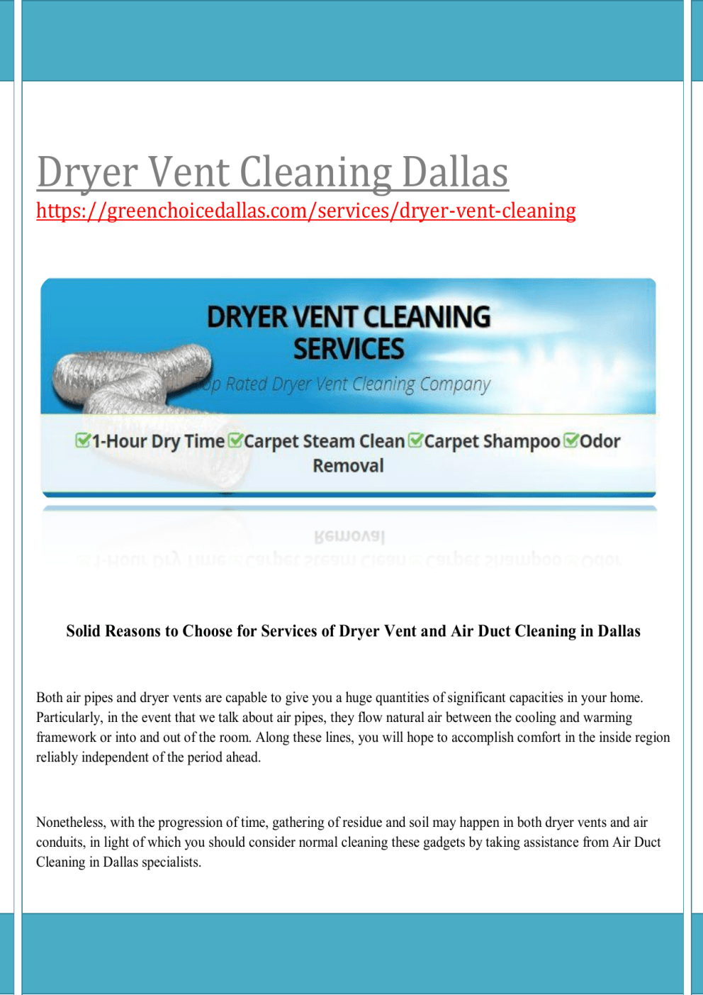 Dryer Vent Cleaning Dallas https://greenchoicedallas.com/services/dryer-vent-cleaning Solid Reasons to Choose for Services of Dryer Vent and Air Duct Cleaning in Dallas Both air pipes and dryer vents are capable to give you a huge quantities of significant capacities in your home. Particularly, in the event that we talk about air pipes, they flow natural air between the cooling and warming framework or into and out of the room. Along these lines, you will hope to accomplish comfort in the inside region reliably independent of the period ahead. Nonetheless, with the progression of time, gathering of residue and soil may happen in both dryer vents and air conduits, in light of which you should consider normal cleaning these gadgets by taking assistance from Air Duct Cleaning in Dallas specialists. Air channel cleaning includes the evacuation of different contaminants, including the residue and flotsam and jetsam inside any ventilation work. These incorporate the arrival and supply air channels in blend with the diffusers and registers present in each room. Amazing vacuums assume a fundamental job to whist away flotsam and jetsam and residue to keep it from the re-dissemination through the home. On the opposite side, dryer vents introduced in homes may stop up at whatever point a lot of build up amasses inside the framework to make a blockage. In this circumstance, you ought to likewise approach for experts related with giving you Dryer Vent Cleaning Dallas administrations. How Cleaning Services are Beneficial :Your Dryer Not Drying? Visit here - https://greenchoicedallas.com/services/dryer-vent-cleaning Up to this point, mortgage holders have gotten pool of advantages by drawing nearer for both dryer vent and Air Duct Cleaning in Dallas administrations. These are as per the following- Makes a Clean Environment When you select proficient cleaning of air conduits and dryer vents, you will hope to decrease the residue and earth, which generally may flow in your property, particularly in the living space, your floors, your beds, furniture things in your home and in pretty much every space in your home. On the opposite side, proficient air channel cleaning administrations lessen the degree of inside tidying and cleaning required holding the cleanliness of a property. Expulsion of Unpleasant Odors and Smells Paint exhaust, family cleaning specialists, pets, form, tobacco use and planning of sustenance, etc result in stale scents in air channels. Each time you work the forced air system or heater, these scents stream in a rehashed manner into your property. Indeed, even the amassing of soil and residue for a long time causes smelly fragrance originating from the pipe. In any case, itemized and expert cleaning of dryer vents and air pipes by the experts of Dryer Vent in Dallas expel pretty much every kind of scent catching particles and along these lines, lead to crisp smelling property. Diminishes the Entry of Allergens and Other Irritants Alongside residue particles, air pipes as often as possible accompany assortments of hurtful contaminants just as microorganisms. These incorporate microbes, pet dander, dust, form spores, buildup and some other sort of harmful item. Particularly on the off chance that you frequently endure asthma, hypersensitivities and related respiratory issues, you are touchy to any of the airborne particles. In this circumstance, you ought to settle on occasional air channel cleaning to advance solid condition inside the property, generally filthy air in the property will re-flow in your home more than once.