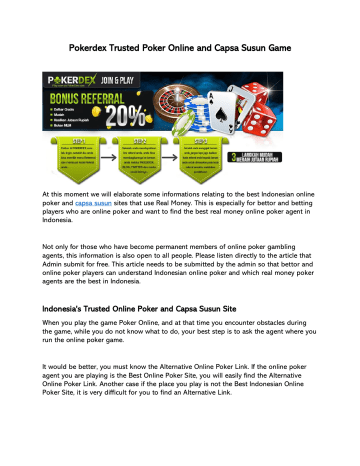 Pokerdex Trusted Poker Online and Capsa Susun Game At this moment we will elaborate some informations relating to the best Indonesian online poker and capsa susun sites that use Real Money. This is especially for bettor and betting players who are online poker and want to find the best real money online poker agent in Indonesia. Not only for those who have become permanent members of online poker gambling agents, this information is also open to all people. Please listen directly to the article that Admin submit for free. This article needs to be submitted by the admin so that bettor and online poker players can understand Indonesian online poker and which real money poker agents are the best in Indonesia. Indonesia's Trusted Online Poker and Capsa Susun Site When you play the game Poker Online, and at that time you encounter obstacles during the game, while you do not know what to do, your best step is to ask the agent where you run the online poker game. It would be better, you must know the Alternative Online Poker Link. If the online poker agent you are playing is the Best Online Poker Site, you will easily find the Alternative Online Poker Link. Another case if the place you play is not the Best Indonesian Online Poker Site, it is very difficult for you to find an Alternative Link. At the end of the Admin article will write about the alternative link Pokerdex - Indonesia's Best Online Poker and Trusted Genuine Money. So for those of you lovers and fans of the Indonesian Online Poker Real Money game, please continue to listen to the information that the admin conveys. The Best Online Poker & Capsa Susun Site In addition to the alternative links for the best Indonesian Online Poker, the Pokerdex Online Poker site also has a very light and fast web speed and page loading, so you can access from various types of browsers and devices. This of course will make it easier for the bettor and visitors when accessing it so that it can be accessed comfortably. The Pokerdex website supports various types of your favorite browsers, including: Mozilla Firefox, Internet Explorer, Google Chrome, Opera or Opera Mini, UC Browser, CM Browser, Torch and various other browser types. With the convenience that Pokerdex provides, you players will be able to comfortably and comfortably access the Best Indonesian Online Poker Site. The convenience of accessing the Online Poker Agent site will be an important factor for players and bettor to be able to increase their chances of winning while playing. So it is not wrong, if you join Pokerdex - the Indonesian Online Poker site. Pokerdex is one of the online poker gambling game sites that has long been involved and is very experienced in organizing Online Poker Game Sites. With the trust of the thousands of members that Pokerdex already has, this has become a precedent and a reference for prospective new members to not hesitate to join the Best Online Poker Site Agent Indonesia Pokerdex. Pokerdex Real Online Poker Agent When it became a provider of online poker gambling sites a few years ago, Pokerdex was immediately greeted with great enthusiasm by fans and connoisseurs of the Indonesian Online Poker game. This then makes us always improve services, especially in customer service and improving the quality of the Website. So since its inception, Pokerdex is always ready with CS Online 24 hours non-stop. Whenever players and visitors need CS services, we are ready 24 hours ready to help you answer the needs and or questions related to this Best Indonesian Online Poker service. No exception for players and beginner bettor who want to play the Indonesian Online Poker game for the first time, do not hesitate and feel free to contact our Customer Service or livechat that we provide on this Website. Hopefully this Admin article will be useful information both for bettors and online Poker players and for beginners who want to get to know the best Indonesian Online Poker site. And then if you want to join Pokerdex, you can go to the Registration Link. To contact CS, you can click the Contact Page. Then you can always stay tuned on our Website. Wait for more detailed and complete articles about online gambling and online poker. For further information, please click http://pokerdexlogin.com