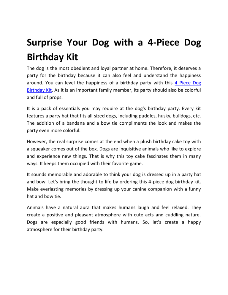 Surprise Your Dog with a 4-Piece Dog Birthday Kit The dog is the most obedient and loyal partner at home. Therefore, it deserves a party for the birthday because it can also feel and understand the happiness around. You can level the happiness of a birthday party with this 4 Piece Dog Birthday Kit. As it is an important family member, its party should also be colorful and full of props. It is a pack of essentials you may require at the dog's birthday party. Every kit features a party hat that fits all-sized dogs, including puddles, husky, bulldogs, etc. The addition of a bandana and a bow tie compliments the look and makes the party even more colorful. However, the real surprise comes at the end when a plush birthday cake toy with a squeaker comes out of the box. Dogs are inquisitive animals who like to explore and experience new things. That is why this toy cake fascinates them in many ways. It keeps them occupied with their favorite game. It sounds memorable and adorable to think your dog is dressed up in a party hat and bow. Let's bring the thought to life by ordering this 4-piece dog birthday kit. Make everlasting memories by dressing up your canine companion with a funny hat and bow tie. Animals have a natural aura that makes humans laugh and feel relaxed. They create a positive and pleasant atmosphere with cute acts and cuddling nature. Dogs are especially good friends with humans. So, let's create a happy atmosphere for their birthday party.