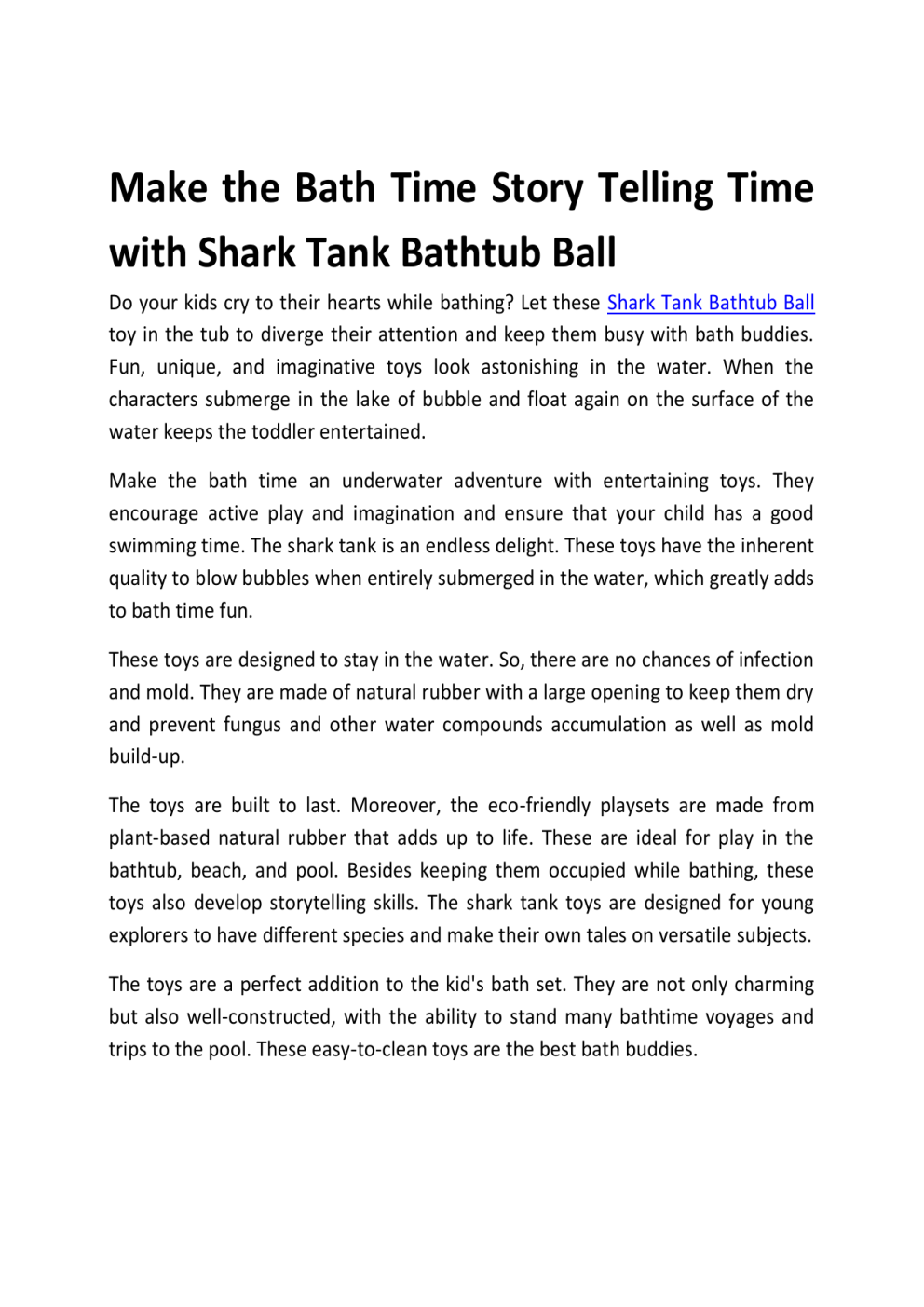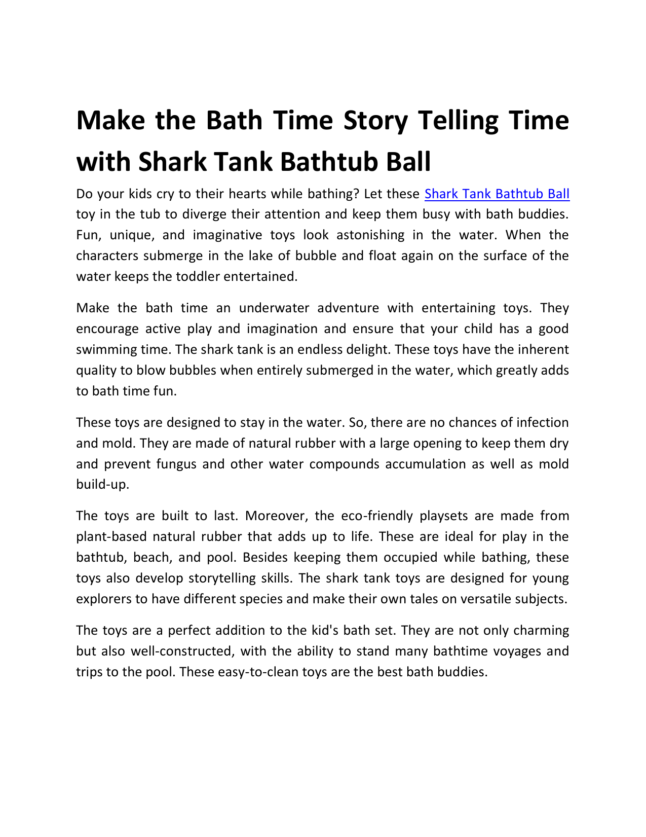 Make the Bath Time Story Telling Time with Shark Tank Bathtub Ball Do your kids cry to their hearts while bathing? Let these Shark Tank Bathtub Ball toy in the tub to diverge their attention and keep them busy with bath buddies. Fun, unique, and imaginative toys look astonishing in the water. When the characters submerge in the lake of bubble and float again on the surface of the water keeps the toddler entertained. Make the bath time an underwater adventure with entertaining toys. They encourage active play and imagination and ensure that your child has a good swimming time. The shark tank is an endless delight. These toys have the inherent quality to blow bubbles when entirely submerged in the water, which greatly adds to bath time fun. These toys are designed to stay in the water. So, there are no chances of infection and mold. They are made of natural rubber with a large opening to keep them dry and prevent fungus and other water compounds accumulation as well as mold build-up. The toys are built to last. Moreover, the eco-friendly playsets are made from plant-based natural rubber that adds up to life. These are ideal for play in the bathtub, beach, and pool. Besides keeping them occupied while bathing, these toys also develop storytelling skills. The shark tank toys are designed for young explorers to have different species and make their own tales on versatile subjects. The toys are a perfect addition to the kid's bath set. They are not only charming but also well-constructed, with the ability to stand many bathtime voyages and trips to the pool. These easy-to-clean toys are the best bath buddies.