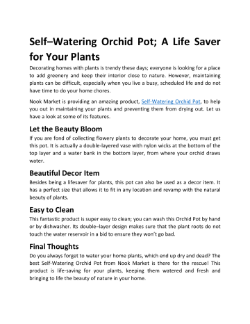 Self–Watering Orchid Pot; A Life Saver for Your Plants Decorating homes with plants is trendy these days; everyone is looking for a place to add greenery and keep their interior close to nature. However, maintaining plants can be difficult, especially when you live a busy, scheduled life and do not have time to do your home chores. Nook Market is providing an amazing product, Self-Watering Orchid Pot, to help you out in maintaining your plants and preventing them from drying out. Let us have a look at some of its features. Let the Beauty Bloom If you are fond of collecting flowery plants to decorate your home, you must get this pot. It is actually a double-layered vase with nylon wicks at the bottom of the top layer and a water bank in the bottom layer, from where your orchid draws water. Beautiful Decor Item Besides being a lifesaver for plants, this pot can also be used as a decor item. It has a perfect size that allows it to fit in any location and revamp with the natural beauty of plants. Easy to Clean This fantastic product is super easy to clean; you can wash this Orchid Pot by hand or by dishwasher. Its double–layer design makes sure that the plant roots do not touch the water reservoir in a bid to ensure they won’t go bad. Final Thoughts Do you always forget to water your home plants, which end up dry and dead? The best Self-Watering Orchid Pot from Nook Market is there for the rescue! This product is life-saving for your plants, keeping them watered and fresh and bringing to life the beauty of nature in your home.