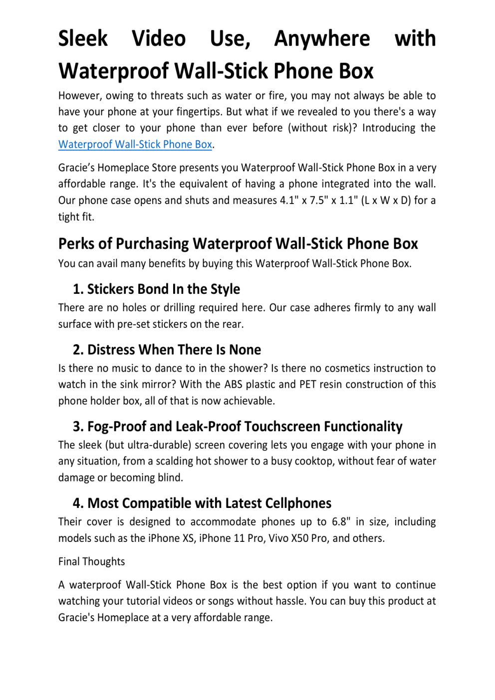 Sleek Video Use, Anywhere with Waterproof Wall-Stick Phone Box However, owing to threats such as water or fire, you may not always be able to have your phone at your fingertips. But what if we revealed to you there's a way to get closer to your phone than ever before (without risk)? Introducing the Waterproof Wall-Stick Phone Box. Gracie’s Homeplace Store presents you Waterproof Wall-Stick Phone Box in a very affordable range. It's the equivalent of having a phone integrated into the wall. Our phone case opens and shuts and measures 4.1" x 7.5" x 1.1" (L x W x D) for a tight fit. Perks of Purchasing Waterproof Wall-Stick Phone Box You can avail many benefits by buying this Waterproof Wall-Stick Phone Box. 1. Stickers Bond In the Style There are no holes or drilling required here. Our case adheres firmly to any wall surface with pre-set stickers on the rear. 2. Distress When There Is None Is there no music to dance to in the shower? Is there no cosmetics instruction to watch in the sink mirror? With the ABS plastic and PET resin construction of this phone holder box, all of that is now achievable. 3. Fog-Proof and Leak-Proof Touchscreen Functionality The sleek (but ultra-durable) screen covering lets you engage with your phone in any situation, from a scalding hot shower to a busy cooktop, without fear of water damage or becoming blind. 4. Most Compatible with Latest Cellphones Their cover is designed to accommodate phones up to 6.8" in size, including models such as the iPhone XS, iPhone 11 Pro, Vivo X50 Pro, and others. Final Thoughts A waterproof Wall-Stick Phone Box is the best option if you want to continue watching your tutorial videos or songs without hassle. You can buy this product at Gracie's Homeplace at a very affordable range.