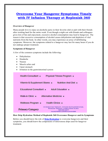 Overcome Your Hangover Symptoms Timely with IV Infusion Therapy at Replenish 360 Overview of Hangover Many people love to enjoy an alcoholic party in their favorite club or pub with their friends after working hard for the entire week. Even though a night out with friends and colleagues gives lots of fun and enjoyment, excessive alcohol consumption may lead to hangovers. The reason is that excessive consumption of alcohol causes dehydration and depletion of vital nutrients from the body. In other words, you may experience an array of debilitating symptoms. Moreover, the symptoms related to a hangover may last for many hours if you do not undergo proper treatment. Symptoms of Hangover A few of the common symptoms include the following Dehydration Headache Nausea Muscle aches and Upset stomach Irritation in the gastrointestinal system How Drip Hydration Method of Replenish 360 Overcomes Hangover and its Symptoms Before you should know the role of Drip Hydration to overcome hangovers and their symptoms, you should know the components of intravenous drips used for hangover treatment. Components of Intravenous Fluids to Recover from Hangovers Fluids given during IV infusion therapy rehydrate the body of hangover victims so that they can easily recover from underlying symptoms. Intravenous hydration also detoxifies the build-up of many harmful toxins caused by the consumption of alcoholic beverages for the whole night. Many IV clinics include special components in their intravenous fluids to restore vitamins, minerals, and other vital nutrients lost by your body from drinking alcohol. Combat Hangover Symptom in Only Half an Hour IV Therapy treatment by Replenish 360 is an effective method to combat tons of hangover symptoms quickly and even within only half an hour. The treatment rehydrates the victim’s body and helps in flushing out many harmful toxins. Simultaneously, intravenous vitamins and hydration treatment restore lost nutrients during a night of heavy alcoholic drinking. Other than water, electrolytes, and saline, theintravenous drip formulafor hangover treatment contains anti-inflammatory and anti-nausea medications to overcome your symptoms immediately. Effective Alternative to Oral Medications Whether you choose over-the-counter medications or prescribed medicines, treatment of your hangover-related pain and discomfort with medications may often cause further irritation. The situation becomes more complicated in the case of a sensitive stomach. On the other hand, intravenous therapy offered by Replenish 360 acts as an effective natural alternative to overcome headaches, muscle pain, and other types of aches accompanying the condition of dehydration. Once the drip procedure completes, the heart of a patient returns to its normal condition. Moreover, the patient receives relief from physical pain and calms his mental state. Conclusion Hangovers from excessive consumption of alcohol on a night out make your next morning uncomfortable. Therefore, you should undergo IV infusion treatment to overcome your painful hangover experiences and get instant relief from your symptoms. The best thing is that the intravenous drip procedure requires spending only an hour in a relaxing environment. Depending on your choice, you may even bring your family member or friend to get support. If this is not enough, patients undergoing intravenous treatment may get a Wi-Fi facility and other facilities to get a comfortable feeling during the complete session of the day. Replenish 360 A Division of Palm Desert Resuscitation Education, LLC "Renew the body, refresh the mind, and restore performance" 73700 Dinah Shore Drive, Suite 107, Palm Desert, CA 92211 760-422-3114 www.YourCPRMD.com/Replenish360 [email protected]