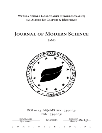 Wyższa Szkoła Gospodarki Euroregionalnej im. Alcide De Gasperi w Józefowie Journal of Modern Science JoMS DOI 10.13166/JoMS.issn.1734-2031 ISSN 1734-2031 Kwartalnik Quarterly j o m s 1/16/2013 . w s g e . e January March 2013 d . p | 1l WSGE u Zespół redakcyjny / Editorial team dr hab. Magdalena Sitek, prof. WSGE Redaktor naczelna / Editor-in-Chief Wyższa Szkoła Gospodarki Euroregionalnej im. Alcide De Gasperi w Józefowie, Polska / Alcide De Gasperi University of Euroregional Economy in Józefów, Poland dr Wacław Brzęk I Zastępca redaktora naczelnego / Assistant Editor Wyższa Szkoła Gospodarki Euroregionalnej im. Alcide De Gasperi w Józefowie, Polska / Alcide De Gasperi University of Euroregional Economy in Józefów, Poland mgr Sylwia Ćmiel II Zastępca redaktora naczelnego / Assistant Editor Wyższa Szkoła Gospodarki Euroregionalnej im. Alcide De Gasperi w Józefowie, Polska / Alcide De Gasperi University of Euroregional Economy in Józefów, Poland dr Krzysztof Dziurzyński redaktor statystyczny / Statistical Editor Wyższa Szkoła Gospodarki Euroregionalnej im. Alcide De Gasperi w Józefowie, Polska/ Alcide De Gasperi University of Euroregional Economy in Józefów, Poland mgr Aurelia Łuczyńska redaktor językowy (język angielski) / English language editor Wyższa Szkoła Gospodarki Euroregionalnej im. Alcide De Gasperi w Józefowie, Polska/ Alcide De Gasperi University of Euroregional Economy in Józefów, Poland mgr Elżbieta Jamróz redaktor językowy (język włoski) / Italian language editor Wyższa Szkoła Gospodarki Euroregionalnej im. Alcide De Gasperi w Józefowie, Polska/ Alcide De Gasperi University of Euroregional Economy in Józefów, Poland mgr Aleksandra Ukleja Sekretarz Redakcji / Managing Editor Wyższa Szkoła Gospodarki Euroregionalnej im. Alcide De Gasperi w Józefowie, Polska/ Alcide De Gasperi University of Euroregional Economy in Józefów, Poland redaktor tematyczny /Subject Editor Wyższa Szkoła Gospodarki Euroregionalnej im. Alcide dr hab. inż. Jerzy Zawisza, Prof. WSGE De Gasperi w Józefowie, Polska/ Alcide De Gasperi University of Euroregional Economy in Józefów, Poland Adres / Address prof. zw. dr hab. Bronisław Sitek redaktor tematyczny /Subject Editor Wyższa Szkoła Gospodarki Euroregionalnej im. Alcide De Gasperi w Józefowie, Polska/ Alcide De Gasperi University of Euroregional Economy in Józefów, Poland Adres redakcji / Editorial Office Wydawnictwo Wyższej Szkoły Gospodarki Euroregionalnej im. Alcide De Gasperi w Józefowie 05-410 Józefów, ul. Sienkiewicza 2 tel./fax +48 022 789 19 03 [email protected] www.joms.wsge.edu.pl Adres do przesyłania artykułów / Address for Submission Wyższa Szkoła Gospodarki Euroregionalnej im. Alcide De Gasperi w Józefowie, ul. Sienkiewicza 2, 05-140 Józefów, Polska / Alcide De Gasperi University of Euroregional Economy, ul. Sienkiewicza 2, 05-410 Józefów, Poland Aleksandra Ukleja tel.: (+48) 22 789 19 03 int. 12 e-m@il: [email protected] j2 | WSGE o m s . w s g e . e d u . p l j o m s . w s g e . e d u . p | l3 WSGE Rada Naukowa / Scientific Committee Prof. dr hab. Bronisław Sitek [Przewodniczący / Chairman] University of Warmia and Mazury in Olsztyn, Poland Prof. dr hab. Peter Terem [Zastępca Przewodniczącego/Deputy Chairman] Matej Bel University Banská Bystrica, Slovakia Prof. dr hab. Edward Erazmus Alcide De Gasperi University of Euroregional Economy in Józefów, Poland Dr hab. Piotr Majer, prof. UWM University of Warmia and Mazury in Olsztyn, Poland Prof. dr hab. Stanisław Mraz Matej Bel University Banská Bystrica, Slovakia Prof. dr hab. Witold Pokruszyński Alcide De Gasperi University of Euroregional Economy in Józefów, Poland Prof. Paulo Aldo Rossi University of Genoa, Italy Prof. Silvestre Bello Rodriguez University of Las Palmas de Gran Canaria, Spain Prof. dr hab. Ligita Simanskiene Klaipėda University, Lithuania Prof. dr hab. Jan Widacki Andrzej Frycz Modrzewski Krakow University, Poland Prof. dr hab. Zdzisław Majkut Alcide De Gasperi University of Euroregional Economy in Józefów, Poland Prof. Laura Tafaro University of Bari “Aldo Moro”, Italy Prof. dr hab. Svetlana Zapara Sumy State University, Ukraine Prof. Jaime Bonnet University of Valencia, Spain Prof. Cristina Hermida del Llano King Juan Carlos University in Madrid, Spain Assoc. Prof. PhD. Ioan Ganfalean “1 Decembrie 1918” University in Alba Iulia, Romania Dr hab. inż. Jerzy Zawisza, Prof. WSGE Alcide De Gasperi University of Euroregional Economy in Józefów, Poland Prof. Ksenofon Krisafi University of Tirana, Albania Prof. Dr. Sabri Gökmen Karamanoğlu Mehmetbey University, Turkey Lect. PhD. Miruna Mihaela Tudorascu “1 Decembrie 1918” University in Alba Iulia, Romania dr Wiesław Breński University of Warmia and Mazury in Olsztyn, Poland dr Lucyna Sikorska Polish Border Guard Training Centre in Kętrzyn, Poland dr Andrzej Wawrzusiszyn Polish Border Guard Training Centre in Kętrzyn, Poland Korekta / Proofreading - mgr Sławomir Koźlak Skład, łamanie, projekt okładki / Typesetting, type-matter, cover - mgr Miłosz Ukleja i mgr Aleksandra Ukleja Za wersję pierwotną niniejszego czasopisma uznaje się wersję wydaną drukiem. Elektroniczna wersja czasopisma stanowi kopię egzemplarzy wydanych drukiem i jest dostępna pod adresem. The printed version of Journal of Modern Science is the original one. The electronic version of the journal is available as a copy of the original printed version. http://www.wsge.edu.pl/pl/journal-of-modern-science-wydania.html Nakład / Circulation - 150 egzemplarzy / copies Druk i oprawa / Printing and binding P.H.U Multikram Krystyna Tuchalska, ul. Mławska 20 D, 87-500 Rypin tel/fax (+48) 054 280 22 06, [email protected] – Krystyna Tuchalska Wydawca / Publisher Wyższa Szkoła Gospodarki Euroregionalnej im. Alcide De Gasperi w Józefowie 05-410 Józefów, ul. Sienkiewicza 2 Aleksandra Ukleja tel./fax +48 022 789 19 03 [email protected] www.wsge.ed