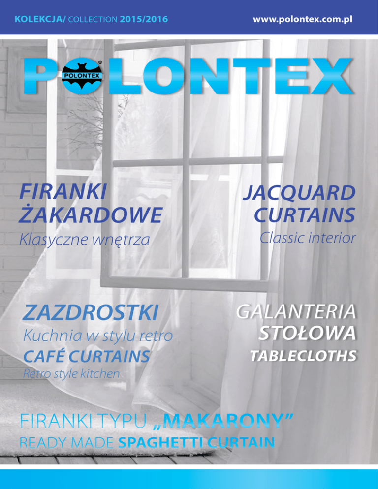 KOLEKCJA/ COLLECTION 2015/2016 FIRANKI ŻAKARDOWE Klasyczne wnętrza ZAZDROSTKI Kuchnia w stylu retro CAFÉ CURTAINS www.polontex.com.pl JACQUARD CURTAINS Classic interior GALANTERIA STOŁOWA TABLECLOTHS Retro style kitchen FIRANKI TYPU „MAKARONY” READY MADE SPAGHETTI CURTAIN FIRANKI ŻAKARDOWE / JACQUARD CURTAINS www.polontex.com.pl FIRANKI ŻAKARDOWE OFERTA METRAŻOWA JACQUARD CURTAINS NET CURTAINS SOLD BY THE METRE* * Minimum order quantity - one roll approx.20-25 m 2 3 www.polontex.com.pl Oferta metrażowa / Net curtains sold by the metre 4 FIRANKI ŻAKARDOWE / JACQUARD CURTAINS 5 www.polontex.com.pl Oferta metrażowa / Net curtains sold by the metre 6 FIRANKI ŻAKARDOWE / JACQUARD CURTAINS 7 www.polontex.com.pl Oferta metrażowa / Net curtains sold by the metre 8 FIRANKI ŻAKARDOWE / JACQUARD CURTAINS 9 www.polontex.com.pl Oferta metrażowa / Net curtains sold by the metre 10 FIRANKI ŻAKARDOWE / JACQUARD CURTAINS 11 www.polontex.com.pl Oferta metrażowa / Net curtains sold by the metre 12 FIRANKI ŻAKARDOWE / JACQUARD CURTAINS 13 www.polontex.com.pl Oferta metrażowa / Net curtains sold by the metre 14 FIRANKI ŻAKARDOWE / JACQUARD CURTAINS 15 www.polontex.com.pl Oferta metrażowa / Net curtains sold by the metre 16 FIRANKI ŻAKARDOWE / JACQUARD CURTAINS 17 www.polontex.com.pl Oferta metrażowa / Net curtains sold by the metre 18 FIRANKI ŻAKARDOWE / JACQUARD CURTAINS 19 www.polontex.com.pl Oferta metrażowa / Net curtains sold by the metre 20 FIRANKI ŻAKARDOWE / JACQUARD CURTAINS 21 www.polontex.com.pl Oferta metrażowa / Net curtains sold by the metre 22 FIRANKI ŻAKARDOWE / JACQUARD CURTAINS 23 www.polontex.com.pl Oferta metrażowa / Net curtains sold by the metre 24 FIRANKI ŻAKARDOWE / JACQUARD CURTAINS 25 www.polontex.com.pl Oferta metrażowa / Net curtains sold by the metre 26 FIRANKI ŻAKARDOWE / JACQUARD CURTAINS 27 www.polontex.com.pl Oferta metrażowa / Net curtains sold by the metre 28 FIRANKI ŻAKARDOWE / JACQUARD CURTAINS 29 www.polontex.com.pl Oferta metrażowa / Net curtains sold by the metre 30 FIRANKI ŻAKARDOWE / JACQUARD CURTAINS 31 www.polontex.com.pl Oferta metrażowa / Net curtains sold by the metre 32 FIRANKI ŻAKARDOWE / JACQUARD CURTAINS 33 www.polontex.com.pl Oferta metrażowa / Net curtains sold by the metre 34 FIRANKI ŻAKARDOWE / JACQUARD CURTAINS 35 www.polontex.com.pl Oferta metrażowa / Net curtains sold by the metre 36 FIRANKI ŻAKARDOWE / JACQUARD CURTAINS 37 www.polontex.com.pl Oferta metrażowa / Net curtains sold by the metre 38 FIRANKI ŻAKARDOWE / JACQUARD CURTAINS 39 www.polontex.com.pl Oferta metrażowa / Net curtains sold by the metre 40 FIRANKI ŻAKARDOWE / JACQUARD CURTAINS 41 www.polontex.com.pl Oferta metrażowa / Net curtains sold by the metre 42 FIRANKI ŻAKARDOWE / JACQUARD CURTAINS 43 www.polontex.com.pl Oferta metrażowa / Net curtains sold by the metre 44 FIRANKI ŻAKARDOWE / JACQUARD CURTAINS 45 FIRANKI ŻAKARDOWE / JACQUARD CURTAINS www.polontex.com.pl FIRANKI ŻAKARDOWE OFERTA SZTUKOWA JACQUARD CURTAINS READY MADE CURTAINS 46 47 www.polontex.com.pl Oferta sztukowa / Ready made curtains 48 FIRANKI ŻAKARDOWE / JACQUARD CURTAINS 49 www.polontex.com.pl Oferta sztukowa / Ready made curtains 50 FIRANKI ŻAKARDOWE / JACQUARD CURTAINS 51 www.polontex.com.pl Oferta sztukowa / Ready made curtains 52 FIRANKI ŻAKARDOWE / JACQUARD CURTAINS 53 FIRANKI TYPU „MAKARONY” / READY MADE SPAGHETTI CURTAIN www.polontex.com.pl FIRANKI TYPU „MAKARONY” OFERTA SZTUKOWA READY MADE SPAGHETTI CURTAIN READY MADE CURTAINS 54 55 www.polontex.com.pl Oferta sztukowa / Ready made curtains 56 FIRANKI TYPU „MAKARONY” / READY MADE SPAGHETTI CURTAIN 57 www.polontex.com.pl Oferta sztukowa / Ready made curtains 58 FIRANKI TYPU „MAKARONY” / READY MADE SPAGHETTI CURTAIN 59 www.polontex.com.pl Oferta sztukowa / Ready made curtains 60 FIRANKI TYPU „MAKARONY” / READY MADE SPAGHETTI CURTAIN 61 ZAZDROSTKI / CAFÉ CURTAINS www.polontex.com.pl ZAZDROSTKI OFERTA METRAŻOWA CAFÉ CURTAINS NET CURTAINS SOLD BY THE METRE* * Minimum order quantity - one roll approx.20-25 m 62 63 www.polontex.com.pl Oferta metrażowa / Net curtains sold by the metre 64 ZAZDROSTKI / CAFÉ CURTAINS 65 www.polontex.com.pl Oferta metrażowa / Net curtains sold by the metre 66 ZAZDROSTKI / CAFÉ CURTAINS 67 www.polontex.com.pl Oferta metrażowa / Net curtains sold by the metre 68 ZAZDROSTKI / CAFÉ CURTAINS 69 GALANTERIA STOŁOWA/ TABLECLOTHS www.polontex.com.pl GALANTERIA STOŁOWA W STYLU RETRO TABLECLOTHS RETRO STYLE 70 71 GALANTERIA STOŁOWA/ TABLECLOTHS www.polontex.com.pl 72 73 GALANTERIA STOŁOWA/ TABLECLOTHS www.polontex.com.pl 74 75 POLONTEX S.A. ul. Rejtana 25/35, 42-200 Częstochowa DZIAŁ SPRZEDAŻY I MARKETINGU tel.: +48/ 34 369 20 30-31 +48/ 34 369 20 34 +48/ 34 369 20 36-37 +48/ 34 369 21 74 fax: +48/ 34 369 23 77 e-mail: [email protected] www.polontex.com.pl GALTEX S.A. ul. 3 Maja 128, 42-360 Poraj ODDZIAŁ W CZĘSTOCHOWIE ul. Rejtana 25/35, 42-200 Częstochowa tel. 34 369 25 00, fax 34 369 25 90 e-mail: [email protected] www.galtex.pl Zdjęcia w folderze mogą nieznacznie odbiegać od wizerunku produktu znajdującego się w sprzedaży. Polontex S.A. nie odpowiada za błędy w druku. Oferta ważna do wyczerpania asortymentu. Tha actual product may differ slightly from the image contained inthe folder.Polontex S.A. is not responsible for printing errors, offer valid until stocks last. www.polontex.com.pl