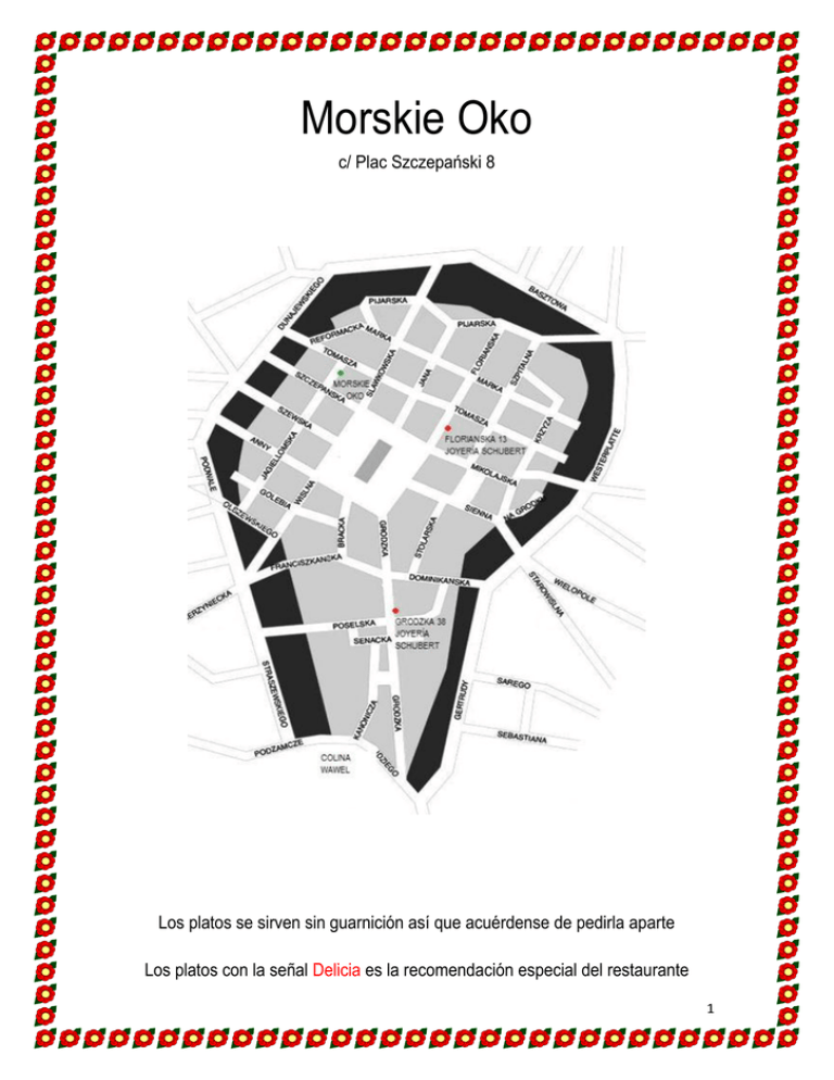 Morskie Oko c/ Plac Szczepański 8 Los platos se sirven sin guarnición así que acuérdense de pedirla aparte Los platos con la señal Delicia es la recomendación especial del restaurante 1 Przystawki na początek / Entrantes Oscypek smażony z żurawiną Delicia Queso de oveja, ahumado, servido con mermelada de arándanos 10 pln Smalec, ogórki kiszone, pieczywo Manteca, pepinillo, pan 10 pln Moskole góralskie z masełkiem czosnkowym Delicia Tortitas de masa de patatas cocidas con mantequilla con ajo 12 pln Zapiekane śliwki suszone zawijane z boczkiem Ciruelas deshidratadas envueltas en bacon, al horno 9 pln Kaszanka według naszej receptury przyrządzona, pieczywo Morcilla de la casa, pan 11 pln Kiełbasa z grilla z cebulką, pieczywo Típica salchicha polaca con cebollita frita, pan 12 pln Kiełbaski jagnięce z grilla, pieczywo Salchichas de cordero, a la parilla, pan 15 pln Bigos z grzybami, mięsem i innymi pysznościami, pieczywo Plato típico polaco: cocido de col con trozos de setas y carne, pan 11 pln Tradycyjne placki ziemniaczane Tortitas de patatas ralladas tradicionales Solo / solos 9 pln Z kwaśną śmietaną / con nata ácida 10 pln Z sosem grzybowym / con salsa de setas 12 pln Deska serów przynajmniej dla dwojga Tabla de quesos 35 pln 2 Zupy / Sopas Kwaśnica góralska z żeberkiem, pieczywo Delicia Sopa regional de col ácida, se sirve una costilla, pan 10 pln Żur polski z jajkiem, ziemniakami i kiełbasą, pieczywo Sopa tradicional polaca de harina de centeno, con huevo duro, patatas y salchicha, pan 9 pln Barszcz czerwony z krokietem Sopa de remolacha servida con un crep relleno, empanado y frito 10 pln Złocisty rosół wiejski z makaronem Caldo con pasta (tallarines o fideos etc) 7 pln Zupa ze swieżych pomidorów z makaronem lub ryżem Sopa de tomate fresco con pasta o arroz 7 pln Wiosenny barszcz z botwinki z ziemniakami Sopa de remolacha jóven con patatas 7 pln Strogonow, zupa gulaszowa z wołowiną, pieczarkami i papryką, pieczywo Delicia Strogonow: sopa con ternera, champiñones y pimiento, pan 10 pln Kociołek góralski (Beef Strogonow dla dwóch osób), pieczywo Strogonow para dos, pan 19 pln Na gorące dni – chłodnik szczawiowy Sopa fría de acedera 9 pln 3 Szczególnie polecamy / Nuestras especialidades Delicia Placek po zbójnicku (placek ziemniaczany z gulaszem wołowym i oscypkiem) Tortita ”de los bandoleros” (tortita de patatas ralladas, con estofado de ternera, adornado queso de oveja ahumado rallado) 20 pln Pedir para compartir, llena un montón :D Schab z dzika w sosie rydzowym Carne de jabalí en salsa de nízcalos 40 pln Udziec jagniecy w sosie własnym Pernil de cordero en su salsa 36 pln W naszej kuchni ulepione Pierogi: Empanadillas de pasta cocidas, rellenas – plato típico Pierogi ruskie okraszane skwarkami Empanadillas con masa de patatas cocidas y requesón, servidas con daditos de tocino 12 pln Pierogi z mięsem okraszane skwarkami Empanadillas rellenas de carne, servidas con daditos de tocino 13 pln Pierogi z bobem okraszane cebulką Delicia Empanadillas rellenas de habas, servidas con cebollita frita 13 pln Pierogi z owocami i osłodzoną kwaśną śmietaną Empanadillas rellenas de fruta, servidas con nata ácida y azúcar 12 pln Pierogi z serem i osłodzoną kwaśną śmietaną Delicia Empanadillas rellenas de requesón dulce, servidas con nata ácida y azúcar 12 pln Naleśniki z serem i owocami Creps con requesón y frutas 12 pln 4 Salaty / Ensaladas Sałata z grilowanym oscypkiem, pomidorami, ogórkami i żurawiną z grzanką podana Ensalada con queso de oveja ahumado hecho a la plancha, tomate, pepino, mermelada de arándanos, pan tostado 18 pln Sałata z grilowanym kurczakiem i sosem vinaigrette z grzanką podane Ensalada con pollo a la parrilla y salsa vinagreta, pan tostado 19 pln Sałata góralska z bryndza, boczkiem i pomidorami z sosem czosnkowym z grzanka podana Ensalada con queso de oveja salado, becon, tomate, salsa de ajo y pan tostado 19 pln Ryby / Pescado Pstrag smażony saute lub panierowany z masełkiem i chrzanem Trucha frita, sola o empanada, con mantequilla y rábano picante 22 pln Sandacz smażony na maśle w sosie śmietanowo – winnnym z warzywami na parze Zander frito en mantequilla, en salsa con base de nata y vino, servido con verduras al vapor 25 pln Wieprzowina / Carne de Cerdo Marynowane golonko rumiane z chrzanem i musztarda Delicia Codillo marinado, con rábano picante y mostaza 34 pln Żeberka duszone w kapuście Delicia Costillas estofadas con col ácida 20 pln Kotlet zakopiański – schab zawijany z pieczarkamii, papryką i oscypkiem Rollo de carne relleno de champiñones, pimiento y queso de oveja ahumado 22 pln 5 Tradycyjny kotlet schabowy panierowany Tradicional filete de cerdo empanado 17 pln (la guarnición típica serían patatas cocidas (gotowane ziemniaki) y col ácida sofrita (zasmażana kapusta) que se piden aparte) Stek z grilla z masełkiem czosnkowym Filete de cerdo a la parrilla con mantequilla con ajo 17 pln Polędwiczki wieprzowe w sosie z borowików Solomillos de cerdo con salsa de boletus 25 pln Półmis pełen mięs rozmaitych i góralskich przysmaków przynajmniej dla dwojga. Bandeja de carnes variadas y especialidades regionales montañesas, suficiente para dos por lo menos 56 pln Wołowina / Carne de Res Polędwica wołowa wysmażana według uznania Solomillo de ternera hecho a tu gusto 35 pln Polędwica wołowa w sosie z zielonego pieprzu, wysmażona według uznania Solomillo de ternera en salsa de pimiento verde, hecho a tu gusto 37 pln Dania z drobiu / Aves Pierś z kaczki z sosem z czerwonych porzeczek, żurawina Delicia Pechuga de pato con salsa de grosellas y arándanos 28 pln Filet z kurczaka panierowany lub saute Pechuga de pollo empanada o sola 15 pln Filet z indyka w sosie z borowików Pechuga de pavo con salsa de boletus 18 pln 6 Cielęcina / Ternera Pieczeń cielęca w sosie własnym, duszona z zielonym groszkiem Delicia Ternera en su salsa, guisada 