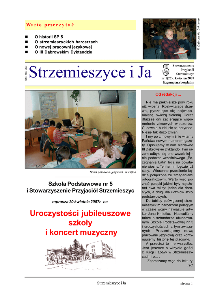 III Dąbrowskie Dyktando Wa r t o p r ze c z y t a ć ISSN 1507-2533 O historii SP 5 O strzemieszyckich harcerzach O nowej pracowni jezykowej O III Dąbrowskim Dyktandzie Strzemieszyce i Ja Stowarzyszenie Przyjaciół Strzemieszyc nr 1(27), kwiecień 2007 Ezgemplarz bezpłatny Od redakcji ... Nowa pracownia językowa w Piątce Szkoła Podstawowa nr 5 i Stowarzyszenie Przyjaciół Strzemieszyc zaprasza 20 kwietnia 2007r. na Uroczystości jubileuszowe szkoły i koncert muzyczny Nie ma piękniejsze pory roku niż wiosna. Rozkwitające drzewa, pyszniące się najwspanialszą, świeżą zielenią. Coraz dłuższe dni zacierające wspomnienie zimowych wieczorów. Cudownie budzi się ta przyroda. Niesie tak dużo zmian. I my po zimowym śnie witamy Państwa nowym numerem gazety. Opisujemy w nim niedawne III Dąbrowskie Dyktando. Tym razem odbyło się ono wcześniej – nie podczas wrześniowego „Pożegnania Lata” lecz na powitanie wiosny. Ten termin będzie już stały. Wiosenne przesilenie będzie połączone ze zmaganiami ortograficznym. Warto więc poznać pułapki jakimi były najeżonet dwa teksy: jeden dla dorosłych, a drugi dla uczniów szkół podstawowych. Do tablicy poświęconej strzemieszyckim harcerzom poległym w czasie wojny nawiązuje artykuł Jana Kmiotka. Napisaliśmy także o sztandarze ufundowanym Szkole Podstawowej nr 5 i uroczystościach z tym związanych. Prezentujemy nową pracownię językową oraz kontynuujemy historię tej placówki. A przecież to nie wszystko. Jest jeszcze o wizycie gości z Turcji i Łotwy w Strzemieszycach i o... . Zapraszamy więc do lektury. red. Strzemieszyce i Ja strona 1 Tekst III Dąbrowskiego Dyktanda (dla dzieci) Wkrótce obydwaj myśliwi podążali przez leśny gąszcz. Była to najbardziej ożywiona pora w tropikalnej puszczy. Nocne zwierzęta i ptaki śpieszyły do kryjówekna odpoczynek, natomiast dzienne wyruszały na poranny żer. Toteż dżungla rozbrzmiewała różnymi krzykami, pomrukami i szelestami. W koronach owocowych drzew trzepotały się bajecznie kolorowe, olbrzymie ary czerwone i błękitne oraz mniejsze od nich ary czerwonoczelne. Potężnymi zakrzywionymi w dół dziobami miażdżyły z łatwością twarde jak kamień owoce różnych palm i skorupy ulubionych orzechów. Jeszcze więcej wrzawy czyniły zielone papugi jara o czołach i kantarkach jasnoniebieskich, żółtych gardzielachi czerwonych w zgięciach skrzydłach. Przelatywały z głośnym trzepotem i z wrzaskiem opadały na drzewa obwieszone owocami. Obydwaj myśliwi doskonale znali tajniki tropikalnej puszczy, toteż niewiele zwracali uwagi na rozgwar panujący wokół nich. Szli szybko, lecz rozważnie wybierali oparcie dla swych stóp. Puszcza błyszcząca poranną rosą jeżyła się wokół niewidocznymi na pierwszy rzut oka zasadzkami: wnętrze butwiejącego, kruchego pnia zwalonego drzewa zazwyczaj zamieszkiwały tysiące niebezpiecznych owadów, z niechcący potrąconej ramieniem gałęzi można było spodziewać się ataków kąśliwych os lub pasożytniczych kleszczy, często wielkości zaledwie łebka szpilki,a liana swobodnie zwisająca z konaru drzewa mogła okazać się czyhającym na łup jadowitym wężem. Alfred Szklarski „Tomek u źródeł Amazonki” strona 2 Wiosenne zmagania z ortografią Ewa Pietranek-Kroplewska 23 marca 2007 w Szkole Podstawowej nr 5 odbyło się III Dąbrowskie Dyktando, w którym w szranki z zasadami polskiej ortografii stanęło około 140 uczestników. „Szanse powinny być dla wszystkich równe - zapowiedział gospodarz całej imprezy, Maciej Szaniawski, dyrektor szkoły - gdyż w tegorocznej edycji po raz pierwszy wprowadzono podział na dwie grupy.” Dla dorosłych tekst dyktanda pt.: ”Do odważnych świat należy” ponownie przygotowała dr Ewa Biłas-Pleszak z Uniwersytetu Śląskiego. Natomiast grupa młodsza zmierzyła się z fragmentem książki Alfreda Szklarskiego pt.: „Tomek u źródeł Amazonki” pełnym opisów flory i fauny. W tym roku uroczystość zainaugurował Prezydent Miasta Zbigniew Podraza. Obecna była również Wiceprezydent Miasta Iwona Krupa, a komisji przewodniczył dr Jerzy Cabała. W dyktandzie dla starszych najmniej błędów popełnił Łukasz Podlejski, który stał się posiadaczem laptopa. Kolejne miejsca zajęli: Wanda Ziemba- II msc., Magdalena Ostrowska- III msc., Piotr Szot- IV msc., Małgorzata Piwowarczyk i Strzemieszyce i Ja Paweł Sołtys- V msc. ex., Monika Stradomska- VI msc., Dawid Bazanek i Agnieszka Zander- VII msc. ex., Zbigniew Maj i Monika SołtysVIII msc. ex., Olga Kacprzyk- IX msc. oraz Karol Świtała i Jakub Matuszek X msc. ex. W grupie młodszych uczestników najlepiej poradził sobie z tekstem Wiktor Piwowarczyk uczeń SP 5, który w nagrodę otrzymał odtwarzacz MP3. W pierwszej dziesiątce znaleźli się: Karolina Cieślik-II msc., Jakub Höhn- III msc., Ewelina Pieńkosz i Weronika Pless-IV msc. ex., Bartosz Pleski i Łukasz Nawaro- V msc. ex., Piotr Zaporowski- VI msc., Szymon Szudlich i Mateusz Morys- VII msc. ex., Martyna Żak- VIII msc., Kamil Walotek i Anna Malinowska- IX msc. ex., oraz: Angelika Guz, Natalia Kubiczek, Paulina Kubiczek, Iga Pawłowska, Monika Koczergo, Paula Sidor, Klaudia Markocka- X msc. ex. Dąbrowskie dyktando cieszy się bardzo dużym zainteresowaniem i z roku na rok przybywa coraz więcej chętnych, którzy chcą sprawdzić swoją znajomość ortografii. Ewa Pietranek-Kroplewska Tekst III Dąbrowskiego Dyktanda Wielka uroczystość! W ramach obchodów jubileuszowych 200-lecia szkoły dnia 20 kwietnia 2007r. organizowana jest doniosła uroczystość, na której po raz kolejny spotkają się absolwenci i obecni uczniowie, dziadkowie i ich wnukowie, i wszyscy ci, którym bliskie są wspomnienia szkolnych lat. Program obejmuje wiele momentów kontynuujących chlubne tradycje tej szkoły m.in. przekazanie sztandaru społeczności szkolnej. Historii szkoły towarzyszy ciągła rozbudowa obiektu: - w 1993r. dobudowana zosta