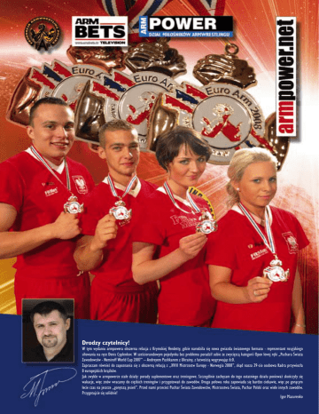 Drodzy czytelnicy! W tym wydaniu armpowera obszerna relacja z Krymskiej Vendetty, gdzie narodziła się nowa gwiazda światowego formatu - reprezentant rosyjskiego siłowania na ręce Denis Cyplenkov. W sześciorundowym pojedynku bez problemu poradził sobie ze zwycięzcą kategorii Open lewej ręki „Pucharu Świata Zawodowców - Nemiroff World Cup 2007” – Andreyem Pushkarem z Ukrainy, z łatwością wygrywając 6:0. Zapraszam również do zapoznania się z obszerną relacją z „XVIII Mistrzostw Europy - Norwegia 2008”, skąd nasza 29-cio osobowa Kadra przywiozła 8 europejskich krążków. Jak zwykle w armpowerze stałe działy: porady suplementowe oraz treningowe. Szczególnie zachęcam do tego ostatniego działu ponieważ skończyły się wakacje, więc znów wracamy do ciężkich treningów i przygotowań do zawodów. Druga połowa roku zapowiada się bardzo ciekawie, więc po gorącym lecie czas na jeszcze „gorętszą jesień”. Przed nami przecież Puchar Świata Zawodowców, Mistrzostwa Świata, Puchar Polski oraz wiele innych zawodów. Przygotujcie się solidnie! Igor Mazurenko 131 23 – 30.06.2008 r. Sarsporg, Norwegia Euro Arm 2008 Mistrzostwa Europy co roku cieszą się ogromnym zainteresowaniem świata armwrestlingu. Każdy z zawodników w swoim kraju dąży do tego, aby po sukcesie na arenie krajowej i zdobyciu tytułu mistrzowskiego, odnieść taki sam sukces na arenie międzynarodowej. W tym roku w Norweskim mieście Sarpsborg gościliśmy ponad 400 zawodników głodnych tego typu sukcesu i wyróżnienia. Do walki przy armwrestlingowym stole tą sporą grupę oddelegowały 24 kraje z całej Europy. Trzeba przyznać, że jest to jeden z lepszych rezultatów ostatnich lat europejskiej rywalizacji. Organizacja Mistrzostw Organizatorem tegorocznych „XVIII Mistrzostw Europy” była Norweska Federacja Armwrestlingu. Wiele dni przygotowań do tej arcyważnej imprezy zaowocowały dobrym przygotowaniem zawodów. Widać było na każdym kroku, iż organizatorzy dążyli do perfekcji. Niestety nie we wszystkich elementach organizacji udało się tego dokonać. Z jednej strony słowa uznania należą się za umiejscowienie zawodów (hotel wysokiej klasy), bardzo ładne medale i nagrody za wywalczenie 1 miejsca w Europie. Bardzo sprawna procedura rejestracji, ważenia oraz przebiegu zawodów. Perfekcyjna obsługa telewizyjna, czy też sprawny obieg. Jednak z drugiej strony patrząc – sala w których odbywały się Mistrzostwa nie była przystosowana do tego typu widowiska (niestety dla 400 osób nie było odpowiedniej ilości miejsc z dobrą widocznością). Sposób wypuszczania zawodników do walk także budził wiele zastrzeżeń. Zawodnicy oczekiwali na swoje walki w pomieszczeniu, w którym znajdowało się kilkanaście dużych agregatów chłodniczych, które podczas pracy generują ogromne ilości ciepła. Zawodnicy czekali do wyjścia w miejscu, gdzie temperatura często przekraczała 30 stopni ciepła. Gdy do tego wszystkiego dołożymy ceremonię nagrodzenia krajów w klasyfikacji drużynowej, podczas której sala została praktycznie opróżniona i ekipy sprzątające zabrały krzesła – pozostaje lekki niedosyt. W nieoficjalnych walkach przy stole treningowym można było to zaobserwować wielokrotnie podczas tych Mistrzostw Europy. Niestety dla naszego kraju w tym roku (jak zresztą w latach poprzednich) najsilniejszą drużyną w kategorii juniorskich była Rosja. Widać było ich przewagę praktycznie w każdej walce, w której występował zawodnik ze wschodu. W ten sposób m.in. miejsca na podium po efektownych walkach nie znalazł Natan Kajdas (miejsce 4 w kategorii juniorów 80 kg prawa ręka) czy też Jolanta Szuster (miejsce 4 w kategorii juniorek 45 kg lewa ręka). Mimo tak ogromnej przewagi Rosjan – Nasza Kadra wywalczyła podczas pierwszych dwóch dni zawodów aż 7 brązowych medali. Największą niespodzianką tegorocznych Mistrzostw został Karol Piotrzkowski z Starogardu Gdańskiego. Ten młody i sympatyczny zawodnik zdobył 2 brązowe medale w kategorii juniorów do 60 kg – jeden na prawą i jeden na lewą rękę. Biorąc pod uwagę stosunkowo krótki staż treningowy tego zawodnika możemy liczyć w przyszłości na stałe miejsce na podium. Wśród kobiet na wyróżnienie za zdobycie medali zasłużyła Michalina Romańska (2 medale w kategorii do 50 kg juniorek) oraz Daria Kowanda (brązowy medal na prawą rękę w kategorii juniorek do 55 kg). Debiutanci z kategorii juniorskich, którzy zajęli odległe miejsca w ostatecznej klasyfikacji obiecali, że najbliższe 12 miesięcy spędzą na solidnych treningach, aby w przyszłym roku w Bułgarii zdobyć chociaż jedno miejsce na podium. W ich słowach słychać było zapał do ciężkich treningów. Oby nie słomiany! na kontuzje obu rąk zabrakło w kadrze Andrzeja Głąbały. Wszyscy nasi mastersi pokazali wolę walki przy armwrestlingowym stole. Jednak niestety w tej grupie zawodników nie doczekaliśmy się medali. Najbliżej upragnionego celu znalazł się Andrzej Skóra (6 miejsce w kategorii 90 kg masters prawa ręka) oraz Konstanty Królik (7 miejsce na obie ręce w kategorii powyżej 100 kg masters). Jednak patrząc na sposób walki, determinację zawodników oraz ich poziom przygotowania muszę powiedzieć, że nie jeden młody zawodnik mógłby się od nich wiele nauczyć. W kategorii powyżej 50 roku życia (grand masters) do walki na prawą rękę Polska reprezentacja wystawiła 3 zawodników. Tym razem znów najbliżej miejsca na podium znalazł się Konstanty Królik (4 miejsce w kategorii grand masters powyżej 90 kg). Pozostali dwaj zawodnicy – Janusz Piechowski z Gdyni oraz Andrzej Hymer z Koszalina zajęli odpowiednio piąte i siódme miejsce. Tym razem muszę osobiście przyznać, że w tej kategorii zawodników tylko Konstanty Królik pokazał wysoki poziom przygotowania. Może dlatego, że w tym roku Mistrzostwa Europy były na maksymalnie wysokim poziomie. J