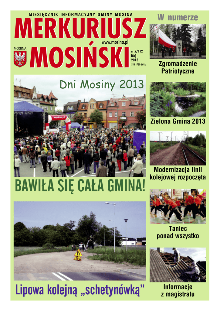 MERKURIUSZ MOSIÑSKI MIESIĘCZNIK INFORMACYJNY GMINY MOSINA MOSINA W numerze www.mosina.pl nr 5/112 Maj 2013 ISSN 1730-668x Dni Mosiny 2013 Zgromadzenie Patriotyczne Zielona Gmina 2013 BAWIŁA SIĘ CAŁA GMINA! Modernizacja linii kolejowej rozpoczęta Taniec ponad wszystko Lipowa kolejną „schetynówką” Informacje z magistratu AKTUALNOŒCI Uroczystości Święta Narodowego uchwalenia Konstytucji 3 Maja We wtorek 30 kwietnia 2013 roku odbyły się w Mosinie uroczystości Święta Narodowego 222. Rocznicy Uchwalenia Konstytucji 3 Maja. W godzinach przedpołudniowych władze samorządowe Gminy Mosina w imieniu mieszkańców złożyły wiązanki kwiatów na miejscu ostatniego spoczynku prezydenta Edwarda Raczyńskiego w krypcie kościoła w Rogalinie oraz w miejscach pamięci na cmentarzu mosińskim. Popołudniu na placu przy pomniku Tadeusza Kościuszki odbyło się zgromadzenie patriotyczne, w którym wzięły udział władze samorządowe, przedstawiciele organizacji pozarządowych, oświaty, instytucji i jednostek pomocniczych z Gminy Mosina oraz mieszkańcy. Najmłodsi otrzymali małe biało-czerwone chorągiewki. Spotkanie rozpoczęło się od wystrzału z armaty Mosińsko-Puszczykowskiego Kurkowego Bractwa Strzeleckiego im. dr Tadeusza Adama Jakubiaka, po czym nastąpiło odśpiewanie hymnu państwowego i przemówienie okolicznościowe Burmistrza Gminy Mosina – Zofii Springer. Zgromadzeni złożyli wiązanki kwiatów i znicze pod pomnikiem, a następnie w korowodzie z biało-czerwonymi flagami wszyscy uczestnicy uroczystości przeszli do Kościoła p.w. Św. Mikołaja w Mosinie, gdzie została odprawiona msza święta w intencji Ojczyzny. Podniosły charakter Zgromadzenia zapewnił przejazd członków Mosińskiego Towarzystwa Motocyklowego, którzy z flagami uroczyście przejechali ulicami miasta oraz oprawa muzyczna w wykonaniu Stowarzyszenia Muzycznego Orkiestra Dęta im. hm. Antoniego Jerzaka oraz Mosińskiego Chóru Kościelnego p.w. Św. Cecylii w Mosinie. Dziękujemy wszystkim za aktywne uczestnictwo. Red 68. rocznica zakończenia II Wojny Światowej Złożeniem wiązanek kwiatów oraz zniczy uczczono w Mosinie 68. rocznica zakończenia II Wojny Światowej. Tradycyjnie uroczystość odbyła się 8 maja pod Pomnikiem na Placu 20 Października w Mosinie. Wiązanki kwiatów i znicze złożyli przedstawiciele władz samorządowych Gminy Mosina, Rady Powiatu Poznańskiego, organizacji kombatanckich i pozarządowych, Wojska Polskiego, duchowieństwa oraz przedstawiciele jednostek pomocniczych. Podczas uroczystości wartę honorową zaciągnęły poczty sztandarowe Związku Emerytów i Rencistów oraz Związku Kombatantów i Byłych Więźniów Politycznych. Red 2 www.mosina.pl MERKURIUSZ MOSIÑSKI BEZPIECZEŃSTWO Gminny Dzień Strażaka W piątek 3 maja 2013 roku w Radzewicach spotkali się strażacy z gminnych jednostek Ochotniczych Straży Pożarnych oraz zaproszeni goście, aby wspólnie obchodzić święto – Gminny Dzień Strażaka. Uroczystą mszę świętą odprawił proboszcz parafii w Rogalinie, ks. Wojciech Kaźmierczak oraz proboszcz parafii w Mosinie, ks. Kanonik Edward Majka. Dalsza część uroczystości odbyła się przed remizą OSP w Radzewicach. Po złożeniu meldunku przez Roberta Kopacza, Naczelnika OSP Radzewice, odśpiewano hymn państwowy i hymn strażacki. Po przemówieniu prezesa Zarządu Gminnego Związku Ochotniczych Straży Pożarnych RP w Mosinie, druhny Małgorzaty Piechockiej, wręczono medali i odznaczenia zasłużonym strażakom. • Odznaka „Strażak wzorowy”: – Janusz Hołysz, OSP Radzewice • Odznaka honorowa „Zasłużony Strażak Gminy Mosina”: – Kazimierz Maślak, Mosina, – Dariusz Piechocki, Mosina – Przemysław Gawron, Nowinki – Jacek Walkowiak, Nowinki – Zdzisław Gierek, Pecna – Wiesław Cieleński, Pecna – Jan Mandecki, Radzewice – Andrzej Kropacz, Radzewice – Tadeusz Matecki, Żabinko – Tadeusz Kaptur, Żabinko • Za wysługę lat odznaczenia otrzymali: – Robert Kropacz – 30 lat – Grzegorz Frąckowiak – 25 lat – Marcin Dudek – 15 lat – Damian Kukowiecki – 15 lat – Beata Tomczak – 5 lat – Rafał Mika – 5 lat – Piotr Gramza – 5 lat • Odznaki Młodzieżowej Drużyny Pożarniczej trafiły do: – Kacpra Kopacza – złota – Roberta Kaisera – brązowa Uroczystość zakończyły przemówienia gości: Burmistrza Gminy Mosina – Zofii Springer, Prezesa Oddziału Powiatowego ZOSP RP – Dariusza Piechockiego oraz Leśniczego Nadleśnictwa Babki – Łukasza Werfla. Jak mówiła Wiceprezes OSP w Radzewicach Beata Tomczak „Kiedyś praca strażaków polegała prawie wyłącznie na gaszeniu pożarów. Dziś samochody strażackie wyjeżdżają nie tylko do pożarów, ale także do wypadków drogowych, powodzi, katastrof kolejowych, budowlanych i wielu innych. Praca na rzecz całego społeczeństwa, ratowanie życia, zdrowia i mienia ludzkiego oraz gotowość niesienia pomocy tym, którzy jej potrzebują, to działania wpisane w codzienną strażacką służbę, zgodnie z mottem – Bogu na chwałę, ludziom na ratunek”. Red Działania Straży Miejskiej – kwiecień 2013 Funkcjonariusze Straży Miejskiej w kwietniu 2013 roku podejmowali działania wynikające z obowiązków ustawowych oraz oczekiwań Mieszkańców: • interwencje porządkowe – 162 • kontrola fotoradarowa – 266 • osoby legitymowane – 164 • osoby pouczone – 109 • osoby nietrzeźwe – 12 • wspólne patrole z Policją (od 18.00 do 02.00) – 6 • odłowione zwierzęta – 9 • kontrola sklepów i targowiska miejskiego – 87 • kontrola posesji – 22 • nadzór nad ukaranymi – 15 • liczba godzin przepracowanych przez ukaranych – 109 • zabezpieczenie imprez i uroczystości – 5 Prowadzone kontrole prędkości z użyciem fotoradaru w dalszym ciągu wykazują na systematyczne zmniejszanie prędkości przez kierowców, niemniej jednak zdarzają się przypadki znacznych przekroczeń. W S