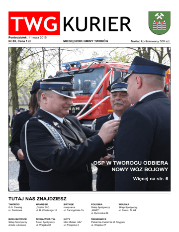 TWG KURIER Poniedziałek, 11 maja 2015 Nr 83, Cena 1 zł MIESIĘCZNIK GMINY TWORÓG Nakład kontrolowany 500 szt. OSP W TWOROGU ODBIERA NOWY WÓZ BOJOWY Więcej na str. 6 TUTAJ NAS ZNAJDZIESZ TWORÓG G.S. Tworóg ul. Zamkowa HANUSEK „Dżelfa” S.C. ul. B. Chrobrego 16 BRYNEK Husqvarna ul. Tarnogórska 7a POŁOMIA Sklep Spożywczy „MART” ul. Bytomska 64 WOJSKA Sklep Spożywczy ul. Powst. Śl. 64 BORUSZOWICE Sklep Spożywczy Aniela Lukoszek NOWA WIEŚ TW. Sklep Spożywczy ul. Wiejska 61 KOTY Mini Market „Mix” ul. Potępska 2 ŚWINIOWICE Piekarnia-Cukiernia M. Szyguła ul. Wiejska 27 TWG KURIER TABLICA PODZIĘKOWANIA ŁOD MAMULKI FAJER Kożdgo roku, już wczas rano Dziękujemy z całego serca wszystkim, którzy wsparli finansowo Fundację „Słoneczko”, której podopieczną jest nasza córka Milena Łysik. Dzięki Waszej pomocy nasza córka jest poddawana dalszej rehabilitacji, która daje nadzieję na rozwój i szansę na większą samodzielność w przyszłości. Dlo Ciebie Mamulko kochano W dziyń fajeru twojygo Prosto ze łogrodka mojygo Srogi buket kwiotkow przynoszam Wdzięczni rodzice Weź je łodymie, Cię proszam ODSZUKALIŚMY WIOSNĘ! Niych te kwiotki, bydom Ci woniały Ło twojym fajerze spominały W zorganizowanym w SP w Tworogu wiosennym konkursie fotograficznym „Poszukajmy razem wiosny" wyróżniono prace dziewięciorga autorów: Nikoli Gawlik, Julii Czaja, Mileny Dramskiej, Kingi Kowoll, Magdaleny Dombek (kl. I a), Michała Godlewskiego (I b), Jana Caus (I c), Natalii Włodarczyk i Wiktora Mrozińskiego (kl. II b). Wszystkim tropicielom wiosny, którzy nadesłali prace na nasz konkurs dziękujemy, a autorom wyróżnionych prac serdecznie gratulujemy! Nagrody wręczono zwycięzcom podczas Powiatowego Przeglądu Filmów Ekologicznych. Zapraszamy do obejrzenia zdjęć w naszej galerii na profilu szkoły na Facebooku. Koordynatorem projektu była p. Małgorzata Weber. R E K L A M Gwiozdki niych dlo Ciebie świycom Wszystkiego najlepszego – wszyscy życzom Niych Ci szczyńście sypie sie gościami Żebyś boła zdrowo, zawsze z nami Irena Jonecko A R E K L A M A RESTAURACJA & CATERING Hubertus Zaprasza na niedzielne obiady na miejscu i na wynos Zestawy obiadowe już od 15 zł! Polecamy catering! Koty, ul. Potępska 2 tel. 506447375 tel. 605046326 www.resthubertus.home.pl [email protected] 2 TWG KURIER WSTĘPNIAK OD REDAKCJI SPIS TREŚCI DRODZY MIESZKAŃCY, TABLICA………………………………………………….str.2 SESJA…………………………………………………….str.4 – Słuchać serca czy rozumu? POD LUPĄ ……………………………………………...str.5 – Bezpiecznie z Akademią Jazdy Lanette – Beny rusza do boju! HOBBYSTA …………………………………………….str.7 – Dieta dla seniora – Mieszkanka gminy w gronie najlepszych – Niezwykłe lekcje przyrodnicze w Wojsce – Z poradnika młodego zielarza KULTURALNIE………………………………….…..…str.9 – Przyłapane na gorącym uczynku – GOK rozszerza działalność – Święto lasu – Brynek 2015 – Przyjaciel wolontariatu – „Ladies” na wielkiej scenie – Mali projektanci i znawcy ojczyzny – Tworożanie w trasie – Wybieram bibliotekę! – Biblioteka przyjazna uczniowi NA BIEŻĄCO………………………………….……….str.12 – Koszykarskie zmagania w Brynku – Jest złoto! – Pierwsze kroki w przedszkolu – Tworóg umajony – Sukcesy sportowe i matematyczne – Akcja – szczepienie przeciwko wściekliźnie pogoda coraz częściej nas rozpieszcza. Jak wykorzystać ten czas? W dziale „Kulturalnie” podpowiadamy. Znajdziecie tam kilka weekendowych propozycji nie do odrzucenia. Kim jest Beny? O nowym „druhu” w szeregach tworoskiej Ochotniczej Straży Pożarnej piszemy na str. 6. W dziale „Hobbysta” dowiecie się także co to takiego pasywny system bezpieczeństwa i jakie nowinki motoryzacyjne szykują dla nas konstruktorzy. Wszystkich właścicieli psów i kotów zachęcamy do akcji szczepienia przeciwko wściekliźnie. Więcej informacji na ten temat znajdziecie na str. 15. A co słychać w radzie gminy? W kwietniu samorządowcy głowili się jak rozwiązać problem zabezpieczenia miejsc w tworoskiej podstawówce dzieciom 6-letnim. O możliwościach i podjętych decyzjach przeczytacie w dziale „Sesja”. Zapraszamy do lektury! www.twg-kurier.pl [email protected] REDAKTOR NACZELNA Marta Kobędza-Krain KREACJA Łukasz Krain MECENAT Grażyna Chmiel – dyrektor Gminnego Ośrodka Kultury GOŚCINNIE Hanna Blacha, Irena Jonecko, Zbigniew Łacisz, Hanna Pawełczyk, Elżbieta Zawartka WYDAWCA Gminny Ośrodek Kultury w Tworogu, ul. Zamkowa 1, 42-690 Tworóg, tel. (32) 285 74 92 DRUK Foto&druk www.fotoidruk.pl Redakcja zastrzega sobie prawo do redagowania i skracania tekstów przesyłanych do druku. 3 TWG KURIER SESJA liczbowe. Tylko wówczas możliwe jest planowanie i racjonalne rozwiązanie problemu – powiedział wójt, Eugeniusz Gwóźdź. Ostatnią omawianą propozycją była rozbudowa SP w Tworogu. Wzięto pod uwagę dwie jej wersje. Pierwszą jest dobudowa pomieszczeń na sale lekcyjne, drugą – adaptacja pomieszczeń na strychu na biura dyrektora oraz sekretariat i przystosowanie aktualnych pomieszczeń na klasę dla pierwszaków. Kosztorys inwestorski pierwszej wersji obecnie opiewa na kwotę ok. 500 tys. zł. Skąd jednak wziąć taką sumę? Władze gminy zaznaczają, że oświata pochłania ogromną część budżetu. Rocznie gminne szkoły kosztują ok. 8mln zł (ponad 6 mln – subwencja, 2 mln – gmina). Przedszkola natomiast jako zadanie własne gminy są finansowane ze środków własnych gminy przy dofinansowaniu z budżetu państwa. Łącznie to ok. 2 mln 200 tys. zł (ok. 250 tys. dotacji, resztę pokrywa gmina). Daje to sumę ok. 4mln. zł na oświatę rocznie z budżetu gminy. – Większego ciężaru nie jesteśmy w stanie udźwignąć – mówi zdecydowanie skarbnik gmin