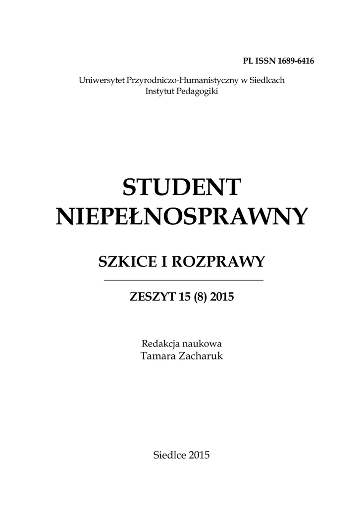 PL ISSN 1689-6416 Uniwersytet Przyrodniczo-Humanistyczny w Siedlcach Instytut Pedagogiki STUDENT NIEPEŁNOSPRAWNY SZKICE I ROZPRAWY ZESZYT 15 (8) 2015 Redakcja naukowa Tamara Zacharuk Siedlce 2015 Recenzenci: prof. dr hab. Irena Pospiszyl, Wszechnica Świętokrzyska w Kielcach dr hab. Bernadeta Szczupał, prof. APS, Akademia Pedagogiki Specjalnej w Warszawie Rada Naukowa: prof. Inna Fedotenko, prof. Dora Levterowa, prof. Leszek Ploch, prof. Lesław Pytka, prof. Emilia Rangelova, prof. Sławomir Sobczak, dr Beata Akimiak, dr Beata Bocian-Waszkiewicz, dr Bożidara Kriviradeva Redakcja naukowa: dr hab. Tamara Zacharuk, prof. UPH Redakor statystyczny: prof. zw. dr hab. Antoni Bombik Redakor językowy (jęz. ros.): prof. Elena Dmitrevna Meleszko Komitet Wydawniczy: Andrzej Bałandynowicz, Andrzej Barczak, Tadeusz Boruta, Janusz Chruściel, Beata Gałek, Leszek Kania, Jarosław Stanisław Kardas, Rafał Kozak, Krzysztof Lewandowski, Violetta Machnicka (przewodnicząca), Robert Piętek, Janina Skrzyczyńska, Stanisław Socha, Andrzej Walendziak, Paweł Żarkowski © Copyright by Uniwersytet Przyrodniczo-Humanistyczny w Siedlcach, Siedlce 2015 Żaden fragment tej publikacji nie może być reprodukowany, umieszczany w systemach przechowywania informacji lub przekazywany w jakiejkolwiek formie – elektronicznej, mechanicznej, fotokopii czy innych reprodukcji – bez zgody posiadacza praw autorskich. PL ISSN 1689-6416 Wydawnictwo Uniwersytetu Przyrodniczo-Humanistycznego w Siedlcach 08-110 Siedlce, ul. Żytnia 17/19, tel. 25 643 15 20 www.wydawnictwo.uph.edu.pl Format A-5. Ark. wyd. 17.5. Ark. druk. 16.5. Druk i oprawa : Elpil, Siedlce Nr 15 (8) STUDENT NIEPEŁNOSPRAWNY Szkice i Rozprawy 2015 Spis treści Wstęp 7 I. Z teorii pedagogiki integracyjnej Tamara Zacharuk Kształcenie studentów niepełnosprawnych w Uniwersytecie Przyrodniczo-Humanistycznym w Siedlcach Janina Florczykiewicz Interdyscyplinarność arteterapii − sztuka jako przestrzeń działania arteterapeutycznego Laura Izabela Jurga Nauczanie włączające szansą na edukację dzieci z niepełnosprawnością Eugeniusz Józefowski, Janina Florczykiewicz Warsztat twórczy jako obszar poszerzania samowiedzy – metodyczne aspekty pedagogiki inkluzyjnej Hanna Żuraw O nowy humanizm w edukacji Beata Bocian-Waszkiewicz Uczeń ze specjalnymi potrzebami edukacyjnymi w szkole masowej – przygotowanie i zadania nauczyciela Marek Mudant Przeciwdziałanie wykluczeniu społecznemu − policja w systemie zapobiegania przemocy w rodzinie Katarzyna Skalska Wsparcie społeczne a satysfakcja z życia studentów z niepełnosprawnością Katarzyna Marciniak-Paprocka Ewaluacja kształcenia osób niepełnosprawnych w Polsce 13 25 43 53 65 85 99 119 137 II. Doświadczenia w zakresie edukacji integracyjnej w Europie i na świecie Beata Gulati Międzynarodowe doświadczenie w nauczaniu studentów niesłyszących i niedosłyszących na poziomie szkoły wyższej − krótka charakterystyka 151 III. Z praktyki inkluzyjnej: terapia, gra, zabawa Mariusz Dobijański Rozwój potencjału osób niedostosowanych społecznie. System diagnozy efektów procesu resocjalizacyjnego wychowanków młodzieżowego ośrodka wychowawczego Oksana Kotormus, Marzena Lisowska Integracja to nie tylko szkoła integracyjna Lesya Smerechak Профессиональные ожидания студентов с функциональными ограничениями (за результатами исследования студентов Дрогобычского Государственного Педагогического Университета имени Ивана Франко) Małgorzata Bednarczyk Hipoterapia jako forma rehabilitacji i wsparcia włączania społecznego osób niepełnosprawnych 159 173 187 207 IV. Scenariusze zajęć integracyjnych Aleksandra Wikieł-Dudała Scenariusz warsztatu arteterapeutycznego „Stawanie się – autoportret symboliczny” dotyczący kształtowania osobowości Beata Bocian-Waszkiewicz Scenariusz zajęć wychowawczych – komunikacja interpersonalna (cz. 2) 221 227 V. Recenzje i sprawozdania Monika Wojtkowiak Recenzja książki: Anna Kieszkowska, Inkluzyjno-katalaktyczny model reintegracji społecznej skazanych. Konteksty resocjalizacyjne, Kraków 2012 Leszek Ploch Jubileusz 30-lecia działalności artystycznej Integracyjnego Zespołu Pieśni i Tańca „Mazowiacy” Beata Gulati Motyle i Lodołamacze, czyli jak działa system wsparcia dla studentów z niepełnosprawnościami na Uniwersytecie Przyrodniczo-Humanistycznym w Siedlcach Ewa Nasiłowska II Międzynarodowy Kongres Inkluzji Społecznej 237 245 249 257 Nr 15 (8) STUDENT NIEPEŁNOSPRAWNY Szkice i Rozprawy 2015 Contents Introduction 9 I. The theory of integration pedagogics Tamara Zacharuk The education of students with disabilities at the University of Natural Sciences and Humanities in Siedlce 13 Janina Florczykiewicz Interdisciplinarity of art therapy – art as an area of activity for art therapy 25 Laura Izabela Jurga Inclusive education − the change for the education the children with disability 43 Eugeniusz Józefowski, Janina Florczykiewicz Creative workshop as an area of self-knowledge development − methodical aspects of inclusive education 53 Hanna Żuraw The new humanism in education 65 Beata Bocian-Waszkiewicz A student with special educational needs in regular schools – tasks and preparing teachers 85 Marek Mudant Preventing social exclusion − the police system to counter domestic violence 99 Katarzyna Skalska Social support and life satisfaction of students with disabilities 119 Katarzyna Marciniak-Paprocka Evaluation of education of people with disabilities in Poland 137 II. Experiences at the field of integration education in Europe and in the world Beata Gulati International experience of teaching deaf and hard of hearing students at university level − a short review 151 III. Integration experience – therapy, game, play Mariusz Dobijański The capabi