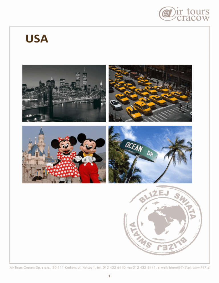 USA 1 Ramowy program: 1 dzień Wylot z Polski. Przylot do Nowego Jorku, czas lokalny. Przelot z co najmniej jedną przesiadką. Transfer do hotelu. Zakwaterowanie. 2 dzień Po śniadaniu całodniowe zwiedzanie miasta – przejazd metrem pod Empire State Building, wyjazd na 86 piętro, wizyta w Memorial 9/11, zwiedzanie Dolnego Manhattanu – Wall Street, Chinatown, Giełda Nowojorska, lunch w okolicach Chinatown. Po południu wycieczka spacer przez most brooklyński, punkt widokowy, Sea Port. Wieczorem możliwy przejazd na lot helikopterem wokół Manhattanu (dodatkowa opłata). Powrót do hotelu czas wolny. 3 dzień Ponownie dzień pełen wrażeń i dosyć napięty plan. Poranny rejs na Ellis Island i Statuę Wolności, następnie zwiedzanie miasta – Środkowy i Górny Manhattan, wizyta na Times Square, katedra św. Patryka, Rockefeller Center, rezerwacja stolika na lunch w Rockefeller Center. Po południu wizyta w teatrze broadwayowskim na przedstawienie/musical Lion King. Przejazd do teatru komunikacją miejską z przewodnikiem. Powrót do hotelu we własnym zakresie. 4 dzień Po śniadaniu czas wolny. Wieczorem kolacja na statku płynącym dookola Manhattan’u. 2 5 dzień Dzień przeznaczony na realizację własnego planu zwiedzania. 6 dzień Wykwaterowanie z hotelu. Transfer na lotnisko. Wylot do Orlando. Przylot do Orlando. Transfer do hotelu niedaleko Parku Disneya. Zakwaterowanie. 7-8 dzień Dwa dni na zabawę w Parkach Disneya. Zapewnimy 3-dniowe karnety w wersji “hooper”, czyli pozwalające na dowolne przemieszczanie się w obrębie parków Disney’a (Magic Kingdom Park, Epcot, Disney's Hollywood Studios i Disney's Animal Kingdom Theme Park) PLUS parki wodne i dodatkowe atrakcje (Disney's Blizzard Beach Water Park, Disney's Typhoon Lagoon Water Park, DisneyQuest Indoor Interactive Theme Park, Disney's Oak Trail Golf Course, ESPN Wide World of Sports Complex, Disney's Fantasia Gardens Miniature Golf Course). 9 dzień Wykwaterowanie z hotelu. Przejazd wygodnym samochodem z Orlando do Miami. Po drodze przystanek w Cape Canaveral i wizyta w Kennedy Space Center. Po przyjeździe do Miami zakwaterowanie w hotelu przy plaży. 10-13 dzień Pobyt wypoczynkowy w Miami. Podczas pobytu w Miami zostanie zrealizowana wycieczka do Parku Everglades. Park został utworzony 6 grudnia 1947 roku. Jego obecna powierzchnia wynosi 6105 km². Jest to największy obszar dzikiej przyrody subtropikalnej, zachowany w Stanach Zjednoczonych. 3 Jest trzecim co do wielkości parkiem narodowym w kontynentalnej części USA. Park Narodowy Everglades został stworzony w celu ochrony delikatnego ekosystemu lasów namorzynowych. Stanowi największy las namorzynowy na północnej półkuli i jest jednym z najważniejszych miejsc rozrodu tropikalnych ptaków brodzących. 14 dzień Wykwaterowanie z hotelu. Transfer na lotnisko. Wylot do Polski 15 dzień Przylot do Polski, czas lokalny. Przelot z co najmniej jedną przesiadką. 4 Cena wycieczki Cena uzależniona jest od terminu oraz ilości osób wyjeżdżających i podawana jest na życzenie klienta. W przypadku zainteresowania prosimy o kontakt. ([email protected]) Cena zawiera : Przelot główny z Polski do Nowego Jorku i z Miami do Polski w klasie ekonomicznej. Linia lotnicza, trasa i harmonogram lotów są na potwierdzenie; Przelot wewnętrzny z Nowego Jorku do Orlando; W sumie 12 noclegów w hotelach 4*: Zwiedzanie Nowego Jorku zgodne z programem + bilety wstępu do wszystkich atrakcji; Bilety wstępu do Disneylandu i Kennedy Space Centre; Transfery lotniskowe + pozostałe przejazdy zgodne z programem; Karnety "metro card" na caly okres pobytu NYC; Rejs statkiem wokół Manhattan'u połączony z kolacją; Pakiet ubezpieczeniowy (koszty leczenia, następstwa nieszczęśliwych wypadków, choroby przewlekłe, turystyka kwalifikowana, bagaż podróżny) podczas pobytu za granicą w TU Signal Iduna; Asystę wykwalifikowanych przewodników w języku angielskim; Cena nie zawiera : Zwyczajowych napiwków dla bagażowych i przewodników lokalnych; Ubezpieczenia od kosztów rezygnacji: 2,8 % łącznej wartości umowy; Przelotu helikopterem nad Nowym Jorkiem; Wyżywienia; Wiz do USA – biuro Air Tours Cracow nie pośredniczy w formalnościach związanych z uzyskaniem wiz. Uwaga: Aktualne przepisy dotyczące wymagań paszportowych i zdrowotnych znajdują się na stronach www.msz.gov.pl; 5