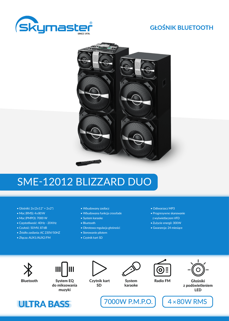 GŁOŚNIK BLUETOOTH SME-12012 BLIZZARD DUO • Głośniki: 2x (2x12'' + 2x2'') • Wbudowany zasilacz • Odtwarzacz MP3 • Moc (RMS): 4x 80 W • Wbudowana funkcja crossfade • Progresywne skanowanie • Moc (PMPO): 7000 W • System karaoke • Częstotliwość: 40 Hz - 20 KHz • Bluetooth • Zużycie energii: 300W • Czułość: 50 MV, 87 dB • Obrotowa regulacja głośności • Gwarancja: 24 miesiące • Źródło zasilania: AC 230V/50HZ • Sterowanie pilotem • Złącza: AUX1/AUX2/FM • Czytnik kart SD Bluetooth System EQ do miksowania muzyki ULTRA BASS z wyświetlaczem VFD Czytnik kart SD System karaoke 7000W P.M.P.O. Radio FM Głośniki z podświetleniem LED 4 × 80W RMS SKYMASTER SME-12012 BLIZZARD DUO Urządzenie pozwala na odtwarzanie muzyki w dowolnym miejscu. Dwa głośniki o łącznej mocy PMPO 7000 W i mocy RMS 4 x 80 W zapewniają czysty, wysokiej jakości dźwięk, który może być odtwarzany poprzez podłączenie dowolnego urządzenia USB lub wbudowane radio FM. Dodatkowym atutem głośnika jest możliwość bezprzewodowego odtwarzania dźwięku z dowolnego urządzenia poprzez bluetooth. Głośnik posiada również funkcję karaoke wzbogaconą, dzięki oświetleniu LED, o wysokiej jakości efekty świetlne. Wygodna rączka zapewnia sprawne przenoszenie urządzenia z miejsca na miejsce bez konieczności podnoszenia. Wymiary głośniki: Waga netto wzmacniacz: Waga netto głośniki: Dostępny od: GŁOŚNIK BLUETOOTH SME-12012 BLIZZARD DUO Pilot i Baterie AAA załączone do zestawu Seria: Model: EAN-Nr.: Ilość sztuk w kartonie: 4000953600056 głośnik prawy: 1, głośnik lewy:1 39 ×40 ×105,5 L: 28,5 kg P: 20,3 kg 2016-09 skymaster.de