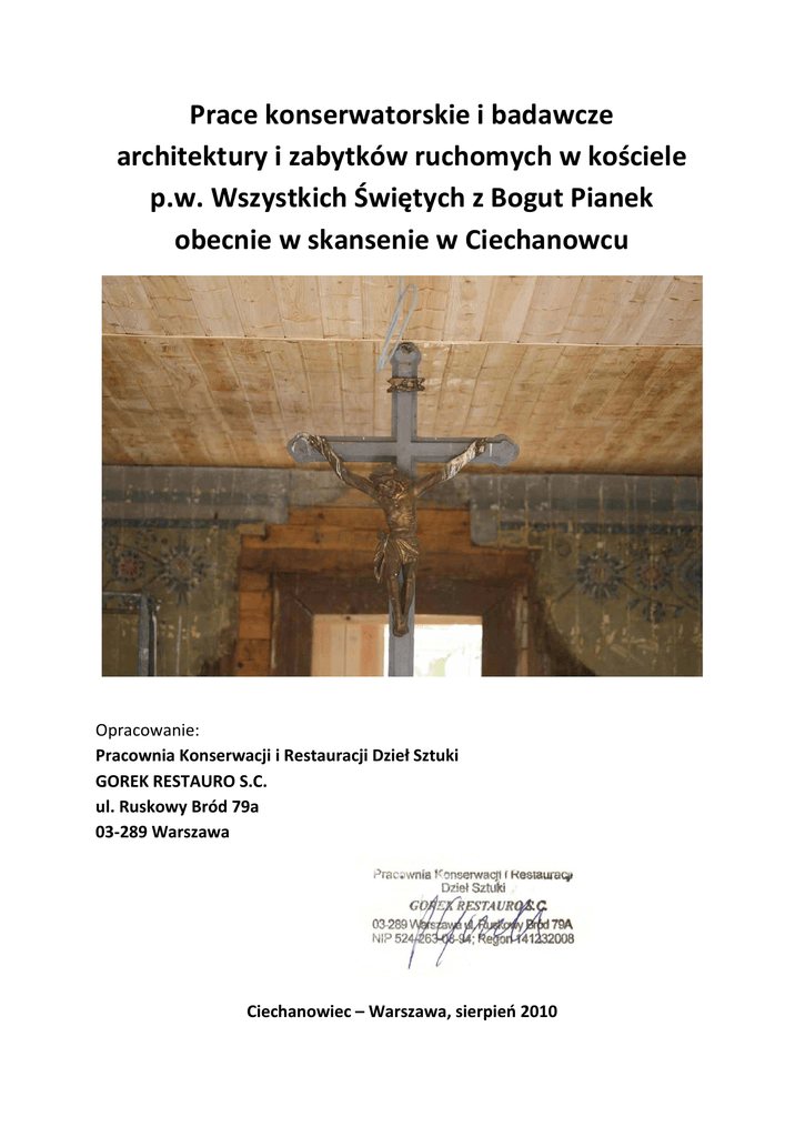 Prace konserwatorskie i badawcze architektury i zabytków ruchomych w kościele p.w. Wszystkich Świętych z Bogut Pianek obecnie w skansenie w Ciechanowcu Opracowanie: Pracownia Konserwacji i Restauracji Dzieł Sztuki GOREK RESTAURO S.C. ul. Ruskowy Bród 79a 03-289 Warszawa Ciechanowiec – Warszawa, sierpień 2010 Spis treści: 1. Opis projektu. 2. Kalendarium historii obiektu. 3. Założenia konserwatorskie. 4. Stan zachowania detalu architektonicznego i zabytków ruchomych. 5. Program konserwatorski. 6. Kosztorys i harmonogram prac. 7. Projekty koncepcyjne polichromii stropu, ławek i oświetlenia wnętrza. Zleceniodawca: Muzeum Rolnictwa im. Ks. Krzysztofa Kluka ul. Pałacowa 5 18-230 Ciechanowiec Autorzy opracowania: • mgr Przemysław Gorek – dyplomowany konserwator malarstwa i rzeźby polichromowanej (dyplom ASP Warszawa 5946), • mgr Sylwia Pawełkowicz, • Karolina Zalewska, • Damian Kwiecień. Założenia projektowe Pierwotnie kościół wraz z dzwonnicą znajdował się w północnej części wsi Boguty Pianki. Orientowaną świątynię zlokalizowano w centrum cmentarza przykościelnego po wschodniej stronie drogi prowadzącej do Dąbrowy Wielkiej. W pierwszym półroczu 2010 r. dokonano rozbiórki obiektu, a następnie jego złożenia na terenie skansenu Muzeum Rolnictwa w Ciechanowcu. Wraz z obiektem architektonicznym przeniesiono większość ruchomego wyposażenia świątyni, w tym ołtarze (główny i dwa boczne), tabernakulum, ambonę, chrzcielnicę, feretrony i belkę tęczową. Do momentu translokacji, świątynia uznawana była za obiekt pochodzący z II poł. XIX w. Świadczyć miały o tym przede wszystkim powściągliwe wzmianki w materiałach archiwalnych. Zgodnie z powtarzanymi w wizytacjach kościelnych informacjami, w 1864 spalił się drewniany kościół w Bogutach Piankach, a na jego miejscu z funduszy parafii wzniesiono nowy. W trakcie demontażu obiektu w odsłonięto relikty późnobarokowej polichromii iluzjonistycznej. Jej cechy stylistyczne kazały przesunąć datowanie świątyni o około sto lat wstecz. Oznacza to, że pożar, który wybuchł w czasie Powstania Styczniowego, uszkodził jedynie fragment drewnianej budowli. Być może zniszczenia obejmowały południową część świątyni, gdyż na tej ścianie nie występowały relikty malowanych barokowych zacheuszków. Podczas rozbiórki kościoła w 2010 r. pod szalunkiem znaleziono także fragmenty polichromii o ludowym charakterze, powstałej zapewne w XIX w. Partie te odsłonięto nadając im charakter tzw. „świadków”. W świetle najnowszych odkryć należy zrewidować dotychczasowe poglądy na temat zabytku oraz ponownie przeanalizować materiał archiwalny. Konserwacja wystroju kościoła pozwoli na przeprowadzenie badań z zakresu historii architektury i historii sztuki. W zakres projektu konserwatorskiego włączono badania dendrologiczne i dendrochronologiczne. Ich celem będzie precyzyjne ustalenie czasu powstania budowli i chronologii zmian architektonicznych w niej zachodzących. Równolegle przeprowadzona będzie analiza spoiw i pigmentów warstw malarskich. Wyniki tych badań uzupełnią stan dzisiejszej wiedzy o przemiany dekoracji malarskich we wnętrzu kościoła w Bogutach Piankach. Począwszy od wzniesienia świątyni do momentu jej zamknięcia – w związku z budową we wsi nowego murowanego kościoła – obiekt ulegał ciągłym przemianom architektonicznym. Wielokrotnie zmieniano jego wystrój malarski oraz wyposażenie. Świadczyć mogą o tym chociażby lakoniczne wzmianki w inwentarzach sporządzanych podczas wizytacji kościelnych. Historyczne wymalowania zniknęły ostatecznie pod warstwami wtórnych dekoracji i elementów architektonicznych (lisice, szalunek). Zachowane do dziś ołtarze, ambona i chrzcielnica ufundowane zostały zapewne po Powstaniu Styczniowym. Znaczną zmianę w wyglądzie wnętrza budowli spowodowały prace przeprowadzone na przełomie lat 20-tych i 30-tych XX w. Pierwotna dekoracja malarska szalunku, powstała do roku 1933, ukryta została następnie pod warstwami wtórnych wymalowań. Obecny wystrój malarski wnętrza budowli oraz elementów ruchomego wyposażenia powstał podczas prac remontowych w 1971 r. Działania wówczas przeprowadzone, podobnie jak wcześniejsze, odbyły się bez nadzoru właściwych służb konserwatorskich. Całość wnętrza i wyposażenia została przemalowana farbami olejnymi. Szalunek pokryto szarozieloną monochromią, którą wzbogacono w górnej partii ścian wielobarwnym ornamentalnym szlakiem. Ościeża okien i obramienia przeźroczy galerii kolatorskich ozdobiono stylizowanymi kwiatami. Balustradę chóru pokrywa dekoracja o motywach muzycznych. Polichromie te nie posiadają wartości historycznej i artystycznej. W ramach projektu planuje się przywrócenie pierwotnej polichromii szalunku oraz pozostałych elementów dekoracji malarskiej wnętrza. Odsłonięte polichromie zostaną zakonserwowane, a w miejscach ubytków zrekonstruowane. Pracami konserwatorskimi objęte zostaną także wszystkie wcześniejsze dekoracje ścienne zachowane jako „świadki”. W efekcie wielokrotnego odnawiania pierwotny wyraz estetyczny utraciły wszystkie elementy ruchomego wyposażenia. Niefachowo przeprowadzane prace malarskie doprowadziły do zniekształcenia detalu snycerskiego. Farba nakładana była nieprecyzyjnie, miejscami tworząc zacieki lub gromadząc się w zagłębieniach. Pozłocone detale rzeźbiarskie „odświeżane” były za pomocą brązy lub farb o zbliżonej kolorystyce, a czasami całkowicie zamalowywane. Planowane prace konserwatorskie przywrócą wyposażeniu spójny wyraz estetyczny, zgodny z pierwotną koncepcja wystroju świątyni. Odsłonięte historyczne polichromie i złocenia zostaną poddane konserwacji oraz rekonstrukcji w miejscach ubytków. W przypadku drewnianych elementów architektonicznych zrekonstruowane będą miejscowe ubytki formy snycerskiej, a miejsca uzupełnień sca