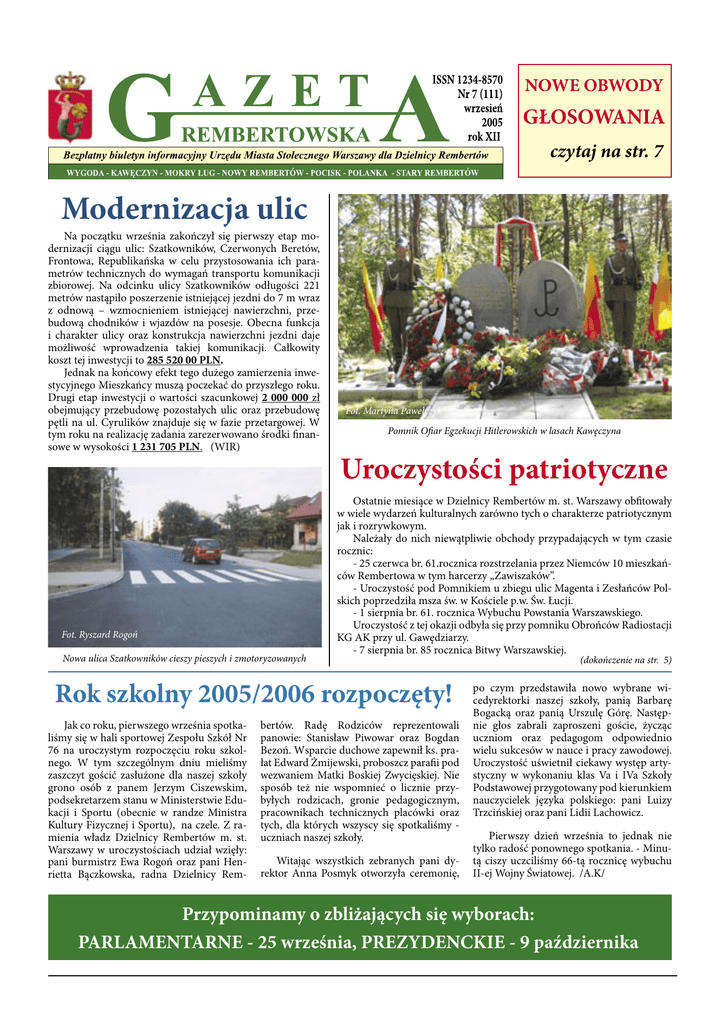 NOWE OBWODY GŁOSOWANIA czytaj na str. 7 Modernizacja ulic Na początku września zakończył się pierwszy etap modernizacji ciągu ulic: Szatkowników, Czerwonych Beretów, Frontowa, Republikańska w celu przystosowania ich parametrów technicznych do wymagań transportu komunikacji zbiorowej. Na odcinku ulicy Szatkowników odługości 221 metrów nastąpiło poszerzenie istniejącej jezdni do 7 m wraz z odnową – wzmocnieniem istniejącej nawierzchni, przebudową chodników i wjazdów na posesje. Obecna funkcja i charakter ulicy oraz konstrukcja nawierzchni jezdni daje możliwość wprowadzenia takiej komunikacji. Całkowity koszt tej inwestycji to 285 520 00 PLN. Jednak na końcowy efekt tego dużego zamierzenia inwestycyjnego Mieszkańcy muszą poczekać do przyszłego roku. Drugi etap inwestycji o wartości szacunkowej 2 000 000 zł obejmujący przebudowę pozostałych ulic oraz przebudowę pętli na ul. Cyrulików znajduje się w fazie przetargowej. W tym roku na realizację zadania zarezerwowano środki finansowe w wysokości 1 231 705 PLN. (WIR) Fot. Ryszard Rogoń Nowa ulica Szatkowników cieszy pieszych i zmotoryzowanych Fot. Martyna Pawełczyk Pomnik Ofiar Egzekucji Hitlerowskich w lasach Kawęczyna Uroczystości patriotyczne Ostatnie miesiące w Dzielnicy Rembertów m. st. Warszawy obfitowały w wiele wydarzeń kulturalnych zarówno tych o charakterze patriotycznym jak i rozrywkowym. Należały do nich niewątpliwie obchody przypadających w tym czasie rocznic: - 25 czerwca br. 61.rocznica rozstrzelania przez Niemców 10 mieszkańców Rembertowa w tym harcerzy „Zawiszaków”. - Uroczystość pod Pomnikiem u zbiegu ulic Magenta i Zesłańców Polskich poprzedziła msza św. w Kościele p.w. Św. Łucji. - 1 sierpnia br. 61. rocznica Wybuchu Powstania Warszawskiego. Uroczystość z tej okazji odbyła się przy pomniku Obrońców Radiostacji KG AK przy ul. Gawędziarzy. - 7 sierpnia br. 85 rocznica Bitwy Warszawskiej. Rok szkolny 2005/2006 rozpoczęty! Jak co roku, pierwszego września spotkaliśmy się w hali sportowej Zespołu Szkół Nr 76 na uroczystym rozpoczęciu roku szkolnego. W tym szczególnym dniu mieliśmy zaszczyt gościć zasłużone dla naszej szkoły grono osób z panem Jerzym Ciszewskim, podsekretarzem stanu w Ministerstwie Edukacji i Sportu (obecnie w randze Ministra Kultury Fizycznej i Sportu), na czele. Z ramienia władz Dzielnicy Rembertów m. st. Warszawy w uroczystościach udział wzięły: pani burmistrz Ewa Rogoń oraz pani Henrietta Bączkowska, radna Dzielnicy Rem- bertów. Radę Rodziców reprezentowali panowie: Stanisław Piwowar oraz Bogdan Bezoń. Wsparcie duchowe zapewnił ks. prałat Edward Żmijewski, proboszcz parafii pod wezwaniem Matki Boskiej Zwycięskiej. Nie sposób też nie wspomnieć o licznie przybyłych rodzicach, gronie pedagogicznym, pracownikach technicznych placówki oraz tych, dla których wszyscy się spotkaliśmy uczniach naszej szkoły. Witając wszystkich zebranych pani dyrektor Anna Posmyk otworzyła ceremonię, (dokończenie na str. 5) po czym przedstawiła nowo wybrane wicedyrektorki naszej szkoły, panią Barbarę Bogacką oraz panią Urszulę Górę. Następnie głos zabrali zaproszeni goście, życząc uczniom oraz pedagogom odpowiednio wielu sukcesów w nauce i pracy zawodowej. Uroczystość uświetnił ciekawy występ artystyczny w wykonaniu klas Va i IVa Szkoły Podstawowej przygotowany pod kierunkiem nauczycielek języka polskiego: pani Luizy Trzcińskiej oraz pani Lidii Lachowicz. Pierwszy dzień września to jednak nie tylko radość ponownego spotkania. - Minutą ciszy uczciliśmy 66-tą rocznicę wybuchu II-ej Wojny Światowej. /A.K/ Przypominamy o zbliżających się wyborach: PARLAMENTARNE - 25 września, PREZYDENCKIE - 9 października www.rembertow.waw.pl Zwiększone nakłady Przedstawiony w moim artykule na początku roku program inwestycyjny jest realizowany w swoich głównych założeniach. Życie jednak dopisało zmiany, które dla jednych mieszkańców są korzystne, dla innych oddalają poprawę warunków życia. Z zadań inwestycyjnych planowanych na 2005 rok zdjęto budowę budynku socjalnego przy ul. Cyrulików, który miał być budowany w cyklu trzyletnim. Dzielnica nie może roz- doprowadziły do wycofania protestu. W tym miejscu serdecznie dziękuję mieszkańcom wspólnoty Frontowa 7 za zrozumienie potrzeb ogółu mieszkańców i wolę porozumienia, co w konsekwencji pozwoli realizować inwestycję, z której korzystać będzie sześciotysięczne osiedle. Przy sprzyjających warunkach inwestycję można zakończyć do grudnia. W inwestycjach drogowych podjęto decyzję o realizacji dodatkowo ulicy Instruktorskiej i Pilarzy gdyż posiadały przygotowaną dokumentację oraz zezwolenia Inwestycje na półmetku począć budowy ze względu na zaskarżanie przez właściciela sąsiedniej działki. Przeciwna tej budowie jest także Rada Osiedla Stary Rembertów – Kolonia. Dotychczasowe rozmowy były niepomyślne dla tej inwestycji, co skutkuje zdjęciem jej z zadań. Kolejne inwestycje, których realizację trzeba było odłożyć w czasie to ulica Szeroka (I etap) oraz ul. Szafarzy. Ulica Szeroka, z uwagi na nieuregulowane granice z rezerwatem „Olszynka Grochowska” oraz prowadzone w najbliższym czasie inwestycje wodne, nie otrzymała pozwolenia budowlanego, a i rozsądek nakazuje przesunąć jej realizację na dalszy okres. W ulicy Szafarzy nie dokończono (z uwagi na zmianę przepisów prawnych) budowy kanałów ściekowych przez co inwestycje przesunięto na 2006 rok. Dwie największe inwestycje drogowe, tj. ulica Płatnerska i ciąg ulic Republikańska, Frontowa, Czerwonych Beretów i pętla dla autobusów przy ulicy Cyrulików, realizowane w cyklu dwuletnim, mają szansę być zrealizowane, a być może ulica Płatnerska nawet w krótszym czasie. Zadania te wzmocniono finansowo. Na ulicę Płatnerską jest już podpisana umowa z wykonawcą, a ciąg ulic (przygotowany pod kursowanie au