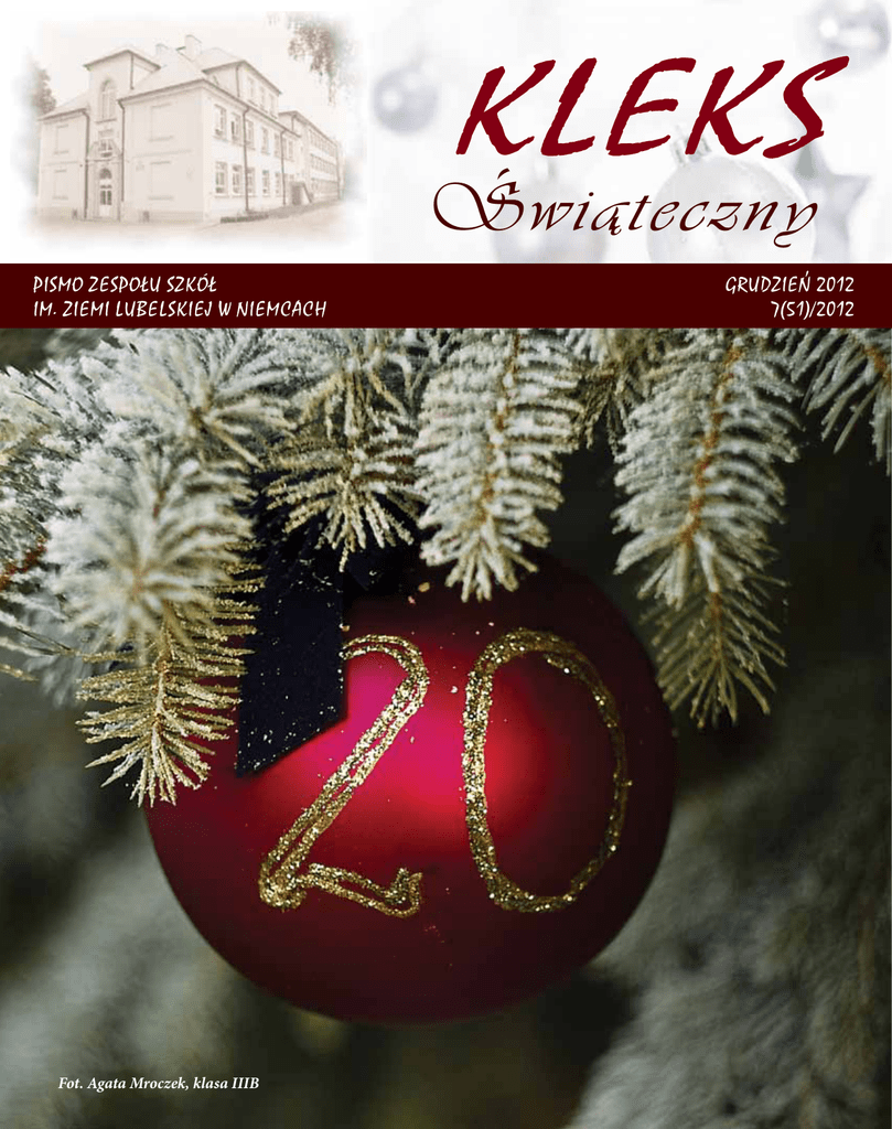 KLEKS Świąteczny PISMO ZESPOŁU SZKÓŁ IM. ZIEMI LUBELSKIEJ W NIEMCACH Fot. Agata Mroczek, klasa IIIB , GRUDZIEN 2012 7(51)/2012 Od redakcji Jak to z Kleksem było… Agnieszka Boguta obecny opiekun redakcji Fot. Krzysztof Boguta N KLEKS ŚWIĄTECZNY 7(51)/2012 PISMO ZESPOŁU SZKÓŁ IM. ZIEMI LUBELSKIEJ W NIEMCACH Redakcja: Aleksandra Flis, Agata Mroczek, Daria Kostyła, Kinga Kozieł, Magdalena Sawka, Aleksandra Dziuba, Michalina Bijak, Anna Macech, Natalia Brzozowska, Natalia Boguta, Sandra Kądziela. Współpraca: p. Marek Gruda, p. Małgorzata Mytyk, p. Bożena Malinowska, p. Izabela Maćkowska, p. Lilianna Dudzikowska, p. Małgorzata Nowak, p. Karolina Szubiela, p. Ewa Korzeniowska, p. Alicja Lesic, p. Jolanta Nowak-Urbaś, p. Barbara Józefacka, p. Tadeusz Nowak, Ewelina Mroczek, Paulina Styś, Agnieszka Porzak, Iwona Włodarczyk, Paulina Nowak, Łukasz Poprawa, Daniel Brzozowski. Opiekunowie: Agnieszka Boguta, Marzena Włodarczyk. Skład komputerowy i oprawa graficzna: Katarzyna Iwańczuk Druk: Drukarnia „Perfekta” Lublin Adres redakcji: Zespół Szkół w Niemcach, ul. Szkolna 23, 21-025 Niemce [email protected] arodził się 20 lat temu, a dokładnie 14 października 1992 roku. Nie miał ojca, za to aż dwie matki. Jedna zajmowała się duszą (pani Małgorzata Nowak), a druga ciałem (pani Ewa Korzeniowska). Był chudy, blady i troszeczkę niepewny, ale od początku istnienia interesowało go wszystko, co związane ze szkołą. Rósł powoli, ale… systematycznie. Nabierał kolorów, znacznie przytył, poszerzył się krąg jego zainteresowań. W 8 roku życia spostrzegł, że na świecie istnieją inne kobiety, niż matki. W tłumie nauczycielek szkoły w Niemcach wypatrzył panią Marzenę Włodarczyk (albo było to odwrotnie) i … zostali parą na kolejne 10 lat. Po drodze dołączył do nich pan Marek Gruda i ich życie od tego momentu stało się niezwykle barwne. A co teraz??? Od 2 lat jest pełnoletni, „wypasiony”, obrósł w piórka, ale ciągle budzi emocje. Wiedzie życie celebryty, uganiają się za nim śliczne gimnazjalistki. Rozmawiają o nim po nocach nauczycielki (pani Agnieszka Boguta i pani Katarzyna Iwańczuk). Doczekał się również synka „Kleksika”. No i teraz już wiecie, że bohaterem tej mini-historyjki jest nasze szkolne pisemko „Kleks”. Z okazji 20. urodzin redakcja zrobiła mu prezent – podarowała nowe „ubranko”. Jest ciekawe, stylowe, szyte na miarę i bardzo trendy. Mam nadzieję, że nasz Jubilat wygląda teraz znacznie młodziej i atrakcyjniej. Nowy format, nowy układ, zmieniona szata graficzna. Liczę na to, że naszym Czytelnikom ta zmiana się spodoba. Tematyka „Kleksa Świątecznego” jest … świąteczna. Bo Święta Bożego Narodzenia tuż tuż… i dwudzieste urodziny gazetki, to też święto. Mam nadzieję, że Czytelnicy, którzy spodziewali się znaleźć w tym numerze relacje ze szkolnych wydarzeń, wybaczą nam ich brak. Wszak 20. urodziny są raz w życiu, a Boże Narodzenie – raz w roku. Zainteresowanych bieżącą tematyką już dziś zachęcam do lektury „Kleksa Semestralnego”, który ukaże się w lutym 2013 roku. A teraz zapraszam do lektury „Kleksa Świątecznego” i czekam na Wasze opinie. 2 Kłopot prasy polega na tym, że nic co normalne, nie jest interesujące. ~ Saul Bellow w numerze Spis Treści • Strona 2 / Jak to z „Kleksem” było… A. Boguta • Strona 5 / Chwila prawdy • Strona 8 / W oczekiwaniu na Nagrodę Pulitzera • Strona 9 / Audaces Deus iuvat! - Mężnym Bóg pomaga! • Strona 10 / Czas na porównanie - Kleks 1992 a Kleks 2012 • Strona 12 / Wspomnienia K. Szubiela, A. Warowny • Strona 13 / Po co nam to było? wspomnienia „Kleksówek” • Strona 16 / Refleksje wiernych czytelniczek. p. A. Lesic i p. A. Sieńczk • Strona 17 / To był Kleks w zupełnie starym stylu. E. Korzeniowska • Strona 18 / O tym jak szkolna dziennikarka została szkolnym psychologiem. L. Dudzikowska • Strona 19 / Jak wspominam powstanie Kleksa? A. Gruda • Strona 20 / Lubię, gdy gazeta tętni życiem. A. Studzińska • Strona 21/ Pierwsze kroki stawiałam w „Kleksie”. K. Pikuła • Strona 22 / Szkolne imperium prasowe. M. Piekarczyk, K. Szłapa, M. Włodarczyk • Strona 24 / Relacja z wizyty w „Dzienniku Wschodnim” • Strona 25 / Relacja z wizyty w drukarni „Perfekta” • Strona 27 / Świąteczne życzenia • Strona 28 / Bombkowa wycieczka. A. Domin, M. Mokusiński, P. Tkaczyk • Strona 30 / Czym są dla mnie Święta Bożego Narodzenia? • Strona 31 / Refleksje na koniec roku. M. Sawka • Strona 32 / Wigilie z dawnych lat – wspomnienia babć i dziadziów • Strona 36 / Wigilia w czasach komuny. J. Macech • Strona 37 / Jak się to robi w... Zwyczaje świąteczne w różnych miejscach na świecie - relacje. • Strona 41 / Bardzo smaczna krzyżówka z dodatkiem Ukrainy • Strona 42 / Święta w górach i na Mazurach. T. Nowak, J. Nowak-Urbaś • Strona 44 / Pod patronatem Akcji Katolickiej. B. Józefacka • Strona 45 / Pomóż, jeśli możesz. T. Nowak • Strona 46 / Wyślij życzenia na Święta Bożego Narodzenia • Strona 47 / Ach! Co to był za prezent!!! KLEKS 7(51)/2012 10 lat z życia wziętych Strona 4 Pani Marzena Włodarczyk, która przez 12 lat była opiekunem redakcji, opowiada o blaskach i cieniach sprawowania tej funkcji. Kalendarium „Kleksa” 1992-2012 Strona 6 Próba podsumowania 20 lat istnienia szkolnej gazetki. Subiektywny wybór opiekunki zespołu redakcyjnego p. Agnieszki Boguty. Dookoła szkoły… z „Kleksem” Strona 10 Szkolna gazetka to kawał szkolnej historii – dokumenty, zdjęcia, nazwiska, liczby. Jak wyglądała szkoła 20 lat temu i dziś – porównanie. Co w „Kleksie” piszczy? Strona 14 Czym żyła szkoła w 1992 roku? O gwiazdach i gwiazdorach tamtych lat – materiał wspomnieniowy M. Mytyka i A. Małyski. Królowa angielska na łamach „Kleksa” Strona 26 Opowieść pani Ewy Korzeniowskiej - p