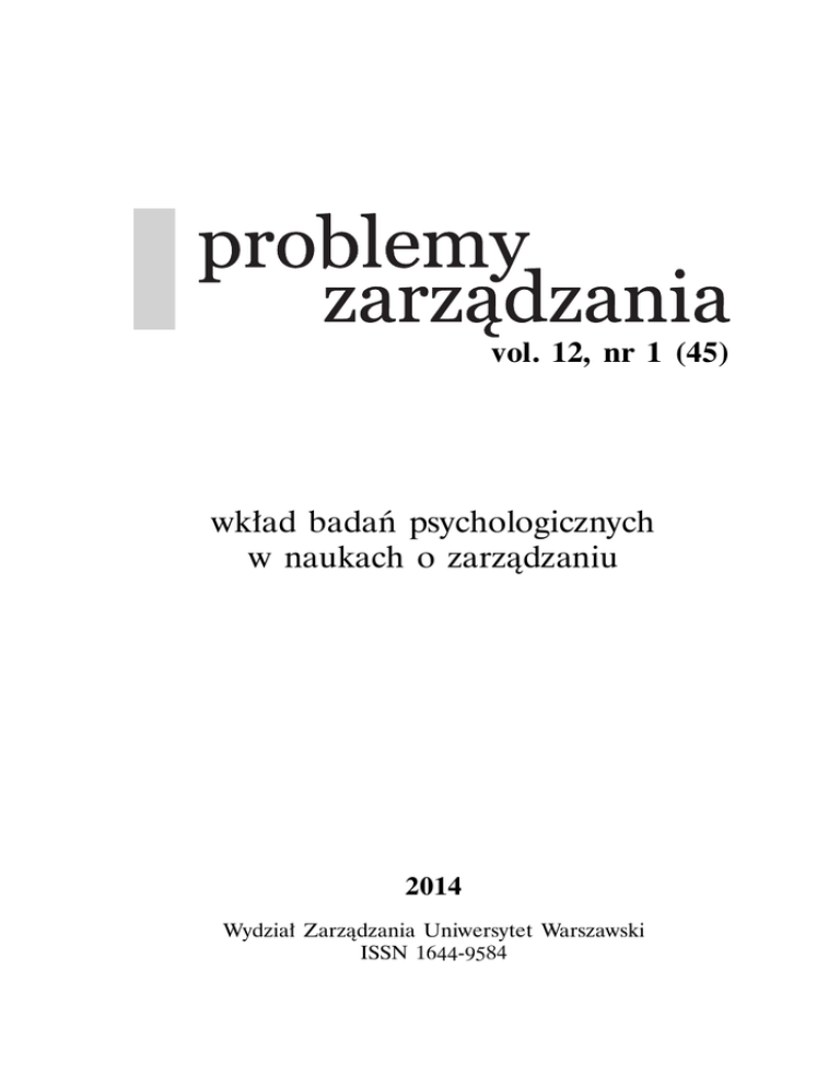 vol. 12, nr 1 (45) wkład badań psychologicznych w naukach o zarządzaniu 2014 Wydział Zarządzania Uniwersytet Warszawski ISSN 1644-9584 Redakcja dr hab. prof. UW Beata Glinka, dr hab. prof. UW Przemysław Hensel Redaktorzy tematyczni prof. zw. dr hab. Grażyna Wieczorkowska-Wierzbińska dr Grzegorz Król Redaktor statystyczny prof. dr hab. Jerzy Wierzbiński Recenzenci prof. zw. dr hab. Monika Kostera dr Grzegorz Król prof. zw. dr hab. Grażyna Wieczorkowska-Wierzbińska prof. dr hab. Jerzy Wierzbiński dr Irena Zinserling Redakcja językowa mgr Monika Sikorska, mgr Amelia Wydra Sekretarz redakcji mgr Anita Sosnowska Rada Programowa prof. prof. prof. prof. prof. prof. prof. Bernard Arogyaswamy (Le Moyne College, NY) dr hab. Ryszard Borowiecki (Uniwersytet Ekonomiczny, Kraków) George Cairns (RMIT, Australia) Lothar Cerny (Cologne University of Applied Sciences) Barbara Czarniawska (Gothenburg Research Institute, Uniwersytet w Göteborgu) dr hab. Marian Gorynia (Uniwersytet Ekonomiczny, Poznań) dr hab. Stefan Kwiatkowski (Wydział Zarządzania, UW i Akademia Leona Koźmińskiego w Warszawie) prof. dr hab. Krzysztof Konecki (Instytut Socjologii, Uniwersytet Łódzki) prof. dr Slawomir Magala (Rotterdam School of Management, Erasmus University) dr Julian Mahari (BPH Breakthrough Projects Holding AG, Szwajcaria) prof. Jeff Michelman (University of North Florida) prof. Gyewan Moon (Kyungpook National University) prof. dr hab. Alojzy Z. Nowak (Wydział Zarzadzania, UW) prof. dr hab. Krzysztof Obłój (Wydział Zarzadzania, UW) prof. Patrick O’Sullivan (Grenoble Bussines School, Francja) prof. Rolf Solli (Goteborg University i Gothenburg Research Institute, Szwecja) prof. Victor Starodubrovskij (Międzynarodowy Instytut Zarządzania, Moskwa) prof. Jeff W. Steagall (Weber University, Uthah) prof. dr hab. Andrzej Szumański (Wydział Prawa i Administracji, Uniwersytet Jagielloński) prof. Ruth Taplin (University of Leicester) prof. zw. dr hab. Jan Turyna (Wydział Zarządzania UW) prof. Janine Wedel (SPP, George Mason University) prof. dr hab. Zofia Wysokińska (Instytut Ekonomii, Uniwersytet Łódzki) prof. dr hab. Anna Zielińska-Głębocka (Wydział Ekonomiczny, Uniwersytet Gdański) Adres redakcji Redakcja Problemów Zarządzania, Szturmowa 1/3 pok. A102, 02-678 Warszawa www.pz.wz.uw.edu.pl, [email protected] Wydawca Wydawnictwo Naukowe Wydziału Zarządzania UW Pismo można zaprenumerować lub nabyć pojedyncze egzemplarze, wysyłając zamówienie na e-mail: [email protected] lub fax: (22) 5534198 z dopiskiem: Wydawnictwo Naukowe WZ. Chęć dokonania prenumeraty można również zgłaszać telefonicznie pod numerem: (22) 5534198. Na zamówieniu złożonym przez instytucję należy podać: nazwę instytucji zamawiającej, adres, numer NIP oraz zgodę na wystawienie faktury bez podpisu odbiorcy. Cena kwartalnika dla prenumeratorów 25 zł (100 zł za rok). Wysyłka niezwłocznie po ukazaniu numeru. Cena prenumeraty zawiera koszt przesyłki. Prenumeratorzy prywatni (nie instytucje) mogą zamawiać kwartalnik wysyłając pieniądze na konto: Uniwersytet Warszawski Wydział Zarządzania, numer konta: 11-116022020000000060848803 z dopiskiem „zapłata za kwartalnik Problemy Zarządzania”. Opracowanie komputerowe, druk i oprawa: Dom Wydawniczy ELIPSA, ul. Inflancka 15/198, 00-189 Warszawa tel./fax 22 635 03 01, 22 635 17 85 e-mail: [email protected], www.elipsa.pl Spis treści Od redaktorów naukowych. . . . . . . . . . . . . . . . . . . . . . . . . . . . . . . . . . . 5 Artykuły Zaangażowane badania jakościowe Jerzy Kociatkiewicz, Monika Kostera . . . . . . . . . . . . . . . . . . . . . . . . . . . 9 Psychologiczne podejście do rozumienia postaw konsumenckich Dominika Maison, Katarzyna Stasiuk . . . . . . . . . . . . . . . . . . . . . . . . . . . 18 Pracownik i pracodawca – wykorzystanie technik projekcyjnych w badaniu postrzegania wzajemnych relacji Anna Pawłowska, Agnieszka Postuła . . . . . . . . . . . . . . . . . . . . . . . . . . . 30 Jawna vs utajona potrzeba władzy Norbert Maliszewski, Klaudyna Jankowska, Hubert Suszek . . . . . . . . . 50 Konsekwencje aktywizacji kategorii związanych z władzą i pieniędzmi Anna Olga Kuźmińska . . . . . . . . . . . . . . . . . . . . . . . . . . . . . . . . . . . . . . . 66 Diagnoza psychologiczna predyspozycji pracowników Grażyna Wieczorkowska-Wierzbińska . . . . . . . . . . . . . . . . . . . . . . . . . . . 81 Zaangażowanie w pracę – problemy z pomiarem Konrad Kulikowski, Magdalena Madej . . . . . . . . . . . . . . . . . . . . . . . . . . 99 Konsekwencje wyboru typu skali odpowiedzi w badaniach ankietowych Jerzy Wierzbiński, Anna O. Kuźmińska, Grzegorz Król . . . . . . . . . . . . . 113 Ewaluacja projektów i abstraktów – wpływ indywidualnego stylu ewaluacji na oceny Grzegorz Król, Katarzyna Kinga Kowalczyk . . . . . . . . . . . . . . . . . . . . . . 137 Myślenie strategiczne w małych i średnich organizacjach Aleksandra Wąsowska . . . . . . . . . . . . . . . . . . . . . . . . . . . . . . . . . . . . . . . 156 Cechy osobowości jako predyktor motywacji i efektywności działań przedsiębiorcy Magdalena Kaczmarek . . . . . . . . . . . . . . . . . . . . . . . . . . . . . . . . . . . . . . 175 Poczucie jakości życia w grupie kierowników i specjalistów – test modelu MOA Barbara Mróz . . . . . . . . . . . . . . . . . . . . . . . . . . . . . . . . . . . . . . . . . . . . . . 191 Wykorzystanie gier w rozwijaniu kompetencji zawodowych Waldemar Grzywacz, Michał Mijal . . . . . . . . . . . . . . . . . . . . . . . . . . . . . 207 Problemy Zarządzania, vol. 12, nr 1 (45): 5 – 7 ISSN 1644-9584, © Wydział Zarządzania UW Od redaktorów naukowych Jak podkreślają Kociatkiewicz i Kostera: „Psychologia i inne nauki społeczne były obecne od samego początku w procesie tworzenia nauk zarządzania, a więc w sposób naturalny przejmowane są metody badawcze pochodzące z tych nauk”. To, co wyróżnia prace psych