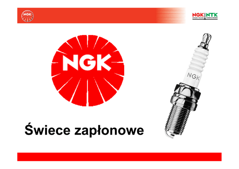 Świece zapłonowe NGK na świecie WSPARCIE TECHNICZNE DLA KLIENTÓW NIEMCY Centrum techniczne w Komaki Fabryka DETROIT Centrum techniczne w Centrali JAPONIA Centrum techniczne w Detroit w U.S.A. Centrum techniczne w Europie BRAZYLIA Centrum techniczne w Brazylii NGK na oryginalnym wyposażeniu · Alfa Romeo · General Motors · AMG/Mercedes · Honda · Aston Martin · Hyundai · Audi · Isuzu · Bentley · Jaguar · BMW · Kia · Citroen · Lancia · Daewoo · Lotus · Daihatsu · Maserati · Daimler Chrysler · Mazda · Ferrari · Mitsubishi · Fiat · Nissan · Ford · Opel świece zapłonowe sondy lambda Rozwój 1950 1980 2000 Rozwój geometrii świec zapłonowych w przeszłości obecnie w przyszłości 50.5 56 HEX 16 HEX 20.7 HEX 14 19 M14 M14 Bi-HEX 12 51 Pt 19 51 51 HEX 16 M12 26.5 M10 26.5 Ni 19 M12 Pt Ir alloy Ir alloy Nowoczesne koncepcje silników mniejsze gniazdo do montażu świec 19 26.5 wię średksza zaw nica o ró w obecnie w przyszłości Ø 14 mm Ø 10-12 mm Świeca standardowa miedziana elektroda środkowa nakrętka SAE elektroda masy uszczelka metalowa gwint uszczelki izolator izolator ceramiczny Świeca z rezystorem przeciwzakłóceniowym opornik przeciwzakłóceniowy Konstrukcja świec zapłonowych typ standardowy 10 -15.000 km świeca dwuelektrodowa świeca trójelektrodowa 25-40.000 km 40-60.000 km Konstrukcja świec zapłonowych elektroda platynowa typ 12 mm przedłużony punkt iskrzenia typ 10 mm gwint 12 mm hex:16.0 mm typ 8 mm typ kompaktowy typ sportowy Zasada działania V-Line elektroda masy zasięg płomienia V-wycięcie elektroda środkowa Rozprzestrzenianie się zasięgu płomienia w tym samym czasie V-Line 29 – BKUR5ET Mercedes, VW, Seat V-Line 30 – BKR6EQUP Alpina, Audi,Bentley, BMW, Mini, Porsche, Rolls Royce, Vauxhall V-Line 31 – PTR5D-10 Ford, Mazda V-Line 32 – BCPR5ES Citroen, Peugeot, Renault, Skoda Świeca zapłonowa z podwójną elektrodą platynową VW Lupo 60.000 km Główny problem nagar powoduje odpływ napięcia Dodatkowa droga iskrzenia Aktualne technologie na oryginalnym wyposażeniu w celu uniknięcia osadzania się nagaru Dodatkowa droga iskrzenia Świece zapłonowe ślizgowe i półślizgowe Aktualne technologie na oryginalnym wyposażeniu w celu uniknięcia osadzania się nagaru Świeca zapłonowa z iskrą ślizgową Świeca irydowa IX Świece irydowe oferują najwyższą jakość zapłonu, mniejszą emisję spalin oraz żywotność jeszcze dłuższą niż świece platynowe. Świeca zapłonowa irydowa IX Fot. 1: Nowa irydowa elektroda środkowa o średnicy 0,6 mm Fot. 2 : Na krawędzi izolatora następują wyładowania elektryczne, które spalają nagromadzony w tym miejscu nagar. Powoduje to bezproblemowy start zimnego silnika. Świeca zapłonowa irydowa IX Zlikwidowany nagar na krawędzi izolatora gwarantuje, że ładunki elektryczne nie spływają po nim i następuje przeskok iskry między elektrodami. Oryginalne wyposażenie DaimlerChrysler 100.000 km Oryginalne wyposażenie Świeca hybrydowa dla Audi 2.0l FSI 60.000 km Świece sportowe Świece sportowe powinny być używane przy obrotach (>12000 obr./min.) i mocy (>70 kW/l) ! Oznakowanie B C P R 7 E wartość cieplna średnica gwintu B: 14 mm D: 12 mm C: 10 mm 12 zimna opornik przeciwzakłóceniowy wysunięty punkt zapłonu 11 odstęp elektrod 9 : 0,9 mm 11: 1,1 mm 2 ciepła wielkość klucza C: 16 mm S - długość gwintu E: długi H: krótki S. standardowy A: specjalny B: “ ........... Wartości cieplne 5 ciepła 6 7 zimna Zachowanie termiczne samozapłon temperatura świecy strefa bezpieczeństwa (5 ciepła) (6) strefa optymalnej pracy (7 zimna) strefa zakopcenia prędkość / obciążenie silnika Zakopcenie Zakopcenie jest spowodowane niesprzyjającymi warunkami pracy lub zastosowanien zbyt zimnej świecy. Stopienie elektrod Stopienie elektrod jest spowodowane samozapłonem lub spalaniem stukowym. Moment dokręcania nowa 1/2 2/3 używana 1/12 - 1/8 Momenty dokręcania świec: 14 mm: 25-30 Nm 12 mm: 15-20 Nm 10 mm: 10-12 Nm Efekt koronny Normalne brązowe przebarwienie na skutek gromadzenia się elektrycznie naładowanych cząstek oleju. Nie jest ono oznaką złego funkcjonowanie świecy ani nieszczelności. W przypadku silników Zetec zaleca się wymianę kabli zapłonowych. Pozostałości po spalaniu Pozostałości po spalonym oleju w starych silnikach zbierają się na świecy i tym samym sprzyjają samozapłonowi. Pęknięcie izolatora Pęknięcie ceramiki jest spowodowane uszkodzeniem mechanicznym (montaż, transport, uderzenie) lub szokiem termicznym. Normalny wygląd biało-szare przebarwienia izolatora oraz niewielki nalot DZIĘKUJĘMY ZA UWAGĘ!