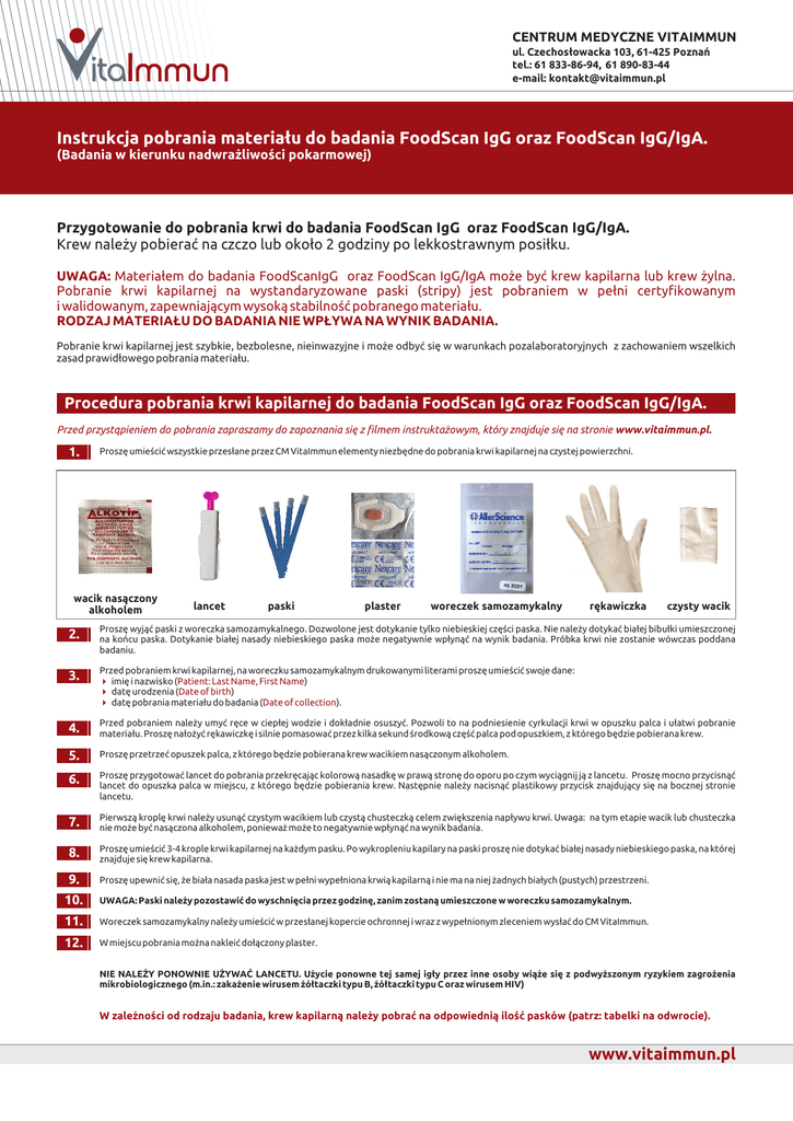 CENTRUM MEDYCZNE VITAIMMUN ul. Czechosłowacka 103, 61-425 Poznań tel.: 61 833-86-94, 61 890-83-44 e-mail: [email protected] Instrukcja pobrania materiału do badania FoodScan IgG oraz FoodScan IgG/IgA. (Badania w kierunku nadwrażliwości pokarmowej) Przygotowanie do pobrania krwi do badania FoodScan IgG oraz FoodScan IgG/IgA. Krew należy pobierać na czczo lub około 2 godziny po lekkostrawnym posiłku. UWAGA: Materiałem do badania FoodScanIgG oraz FoodScan IgG/IgA może być krew kapilarna lub krew żylna. Pobranie krwi kapilarnej na wystandaryzowane paski (stripy) jest pobraniem w pełni certyfikowanym i walidowanym, zapewniającym wysoką stabilność pobranego materiału. RODZAJ MATERIAŁU DO BADANIA NIE WPŁYWA NA WYNIK BADANIA. Pobranie krwi kapilarnej jest szybkie, bezbolesne, nieinwazyjne i może odbyć się w warunkach pozalaboratoryjnych z zachowaniem wszelkich zasad prawidłowego pobrania materiału. Procedura pobrania krwi kapilarnej do badania FoodScan IgG oraz FoodScan IgG/IgA. Przed przystąpieniem do pobrania zapraszamy do zapoznania się z filmem instruktażowym, który znajduje się na stronie www.vitaimmun.pl. 1. Proszę umieścić wszystkie przesłane przez CM VitaImmun elementy niezbędne do pobrania krwi kapilarnej na czystej powierzchni. wacik nasączony alkoholem lancet paski plaster woreczek samozamykalny rękawiczka czysty wacik 2. Proszę wyjąć paski z woreczka samozamykalnego. Dozwolone jest dotykanie tylko niebieskiej części paska. Nie należy dotykać białej bibułki umieszczonej na końcu paska. Dotykanie białej nasady niebieskiego paska może negatywnie wpłynąć na wynik badania. Próbka krwi nie zostanie wówczas poddana badaniu. 3. Przed pobraniem krwi kapilarnej, na woreczku samozamykalnym drukowanymi literami proszę umieścić swoje dane: 4 imię i nazwisko (Patient: Last Name, First Name) 4 datę urodzenia (Date of birth) 4 datę pobrania materiału do badania (Date of collection). 4. Przed pobraniem należy umyć ręce w ciepłej wodzie i dokładnie osuszyć. Pozwoli to na podniesienie cyrkulacji krwi w opuszku palca i ułatwi pobranie materiału. Proszę nałożyć rękawiczkę i silnie pomasować przez kilka sekund środkową część palca pod opuszkiem, z którego będzie pobierana krew. 5. Proszę przetrzeć opuszek palca, z którego będzie pobierana krew wacikiem nasączonym alkoholem. 6. Proszę przygotować lancet do pobrania przekręcając kolorową nasadkę w prawą stronę do oporu po czym wyciągnij ją z lancetu. Proszę mocno przycisnąć lancet do opuszka palca w miejscu, z którego będzie pobierania krew. Następnie należy nacisnąć plastikowy przycisk znajdujący się na bocznej stronie lancetu. 7. Pierwszą kroplę krwi należy usunąć czystym wacikiem lub czystą chusteczką celem zwiększenia napływu krwi. Uwaga: na tym etapie wacik lub chusteczka nie może być nasączona alkoholem, ponieważ może to negatywnie wpłynąć na wynik badania. 8. Proszę umieścić 3-4 krople krwi kapilarnej na każdym pasku. Po wykropleniu kapilary na paski proszę nie dotykać białej nasady niebieskiego paska, na której znajduje się krew kapilarna. 9. Proszę upewnić się, że biała nasada paska jest w pełni wypełniona krwią kapilarną i nie ma na niej żadnych białych (pustych) przestrzeni. 10. UWAGA: Paski należy pozostawić do wyschnięcia przez godzinę, zanim zostaną umieszczone w woreczku samozamykalnym. 11. Woreczek samozamykalny należy umieścić w przesłanej kopercie ochronnej i wraz z wypełnionym zleceniem wysłać do CM VitaImmun. 12. W miejscu pobrania można nakleić dołączony plaster. NIE NALEŻY PONOWNIE UŻYWAĆ LANCETU. Użycie ponowne tej samej igły przez inne osoby wiąże się z podwyższonym ryzykiem zagrożenia mikrobiologicznego (m.in.: zakażenie wirusem żółtaczki typu B, żółtaczki typu C oraz wirusem HIV) W zależności od rodzaju badania, krew kapilarną należy pobrać na odpowiednią ilość pasków (patrz: tabelki na odwrocie). www.vitaimmun.pl W zależności od rodzaju badania, krew kapilarną należy pobrać na odpowiednią ilość pasków. Badanie w kierunku nadwrażliwości pokarmowej IgG – zależnej Rodzaj badania FoodScan IgG 96 składników pokarmowych FoodScan IgG PLUS 112 składników pokarmowych Ilość pasków 3 paski 6 pasków Badanie w kierunku nadwrażliwości pokarmowej IgG/IgA – zależnej Rodzaj badania FoodScan IgG/IgA 96 składników pokarmowych FoodScan IgG/IgA PLUS 112 składników pokarmowych Ilość pasków 8 pasków 16 pasków UWAGA: Istnieje możliwość pobrania krwi kapilarnej z kilku palców, jeżeli nie ma możliwości pobrania krwi z jednego palca na wymaganą ilość pasków. W tym celu dołączamy kolejne lancety. Procedura pobrania krwi żylnej do badania FoodScan IgG/IgA 4 4 4 4 Pobranie krwi z żyły należy przeprowadzić w laboratorium. Próbkę krwi należy odwirować (10 min., 3000 obrotów). Probówkę z surowicą należy opisać imieniem i nazwiskiem. Opisaną probówkę należy umieścić w ochronnym plastikowym opakowaniu. Badanie w kierunku nadwrażliwości pokarmowej IgG – zależnej Rodzaj badania Ilość surowicy FoodScan IgG 96 składników pokarmowych 1 ml FoodScan IgG PLUS 112 składników pokarmowych 2 ml Badanie w kierunku nadwrażliwości pokarmowej IgG/IgA – zależnej Rodzaj badania Ilość surowicy FoodScan IgG/IgA 96 składników pokarmowych 2 ml FoodScan IgG/IgA PLUS 112 składników pokarmowych 4 ml Stabilność materiału: 4 4 4 4 FoodScan IgG: 3 doby od pobrania FoodScan IgG/IgA: 3 doby od pobrania Food Scan IgGPLUS: 3 doby od pobrania FoodScan IgG/IgA PLUS: 3 doby od pobrania Wysyłka materiału: Materiał do badania można wysłać Pocztą Polską lub wybranym przez Państwa kurierem. Transport materiału nie musi odbywać się w warunkach specjalnych, ponieważ temperatura nie wpływa na wynik badania. Czas oczekiwania na wynik: 3 tygodnie UWAGA: Pobraną próbkę wraz z wypełnionym zleceniem należy przesł