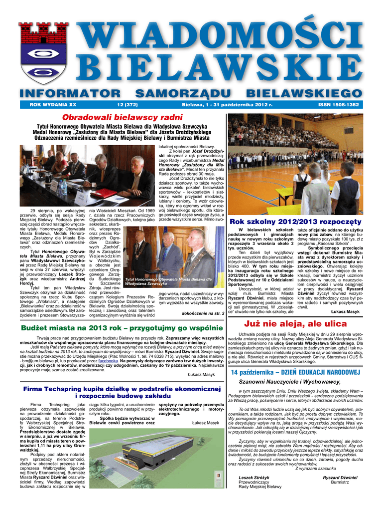 INFORMATOR ROK WYDANIA XX SAMORZĄDU 12 (372) BIELAWSKIEGO Bielawa, 1 - 31 października 2012 r. ISSN 1508-1362 Obradowali bielawscy radni Tytuł Honorowego Obywatela Miasta Bielawa dla Władysława Szewczyka Medal Honorowy „Zasłużony dla Miasta Bielawa” dla Józefa Drożdżyńskiego Odznaczenia rzemieślnicze dla Rady Miejskiej Bielawy i Burmistrza Miasta 29 sierpnia, po wakacyjnej przerwie, odbyła się sesja Rady Miejskiej Bielawy. Podczas pierwszej części obrad nastąpiło wręczenie tytułu Honorowego Obywatela Miasta Bielawa, Medalu Honorowego „Zasłużony dla Miasta Bielawa” oraz odznaczeń rzemieślniczych. Tytuł Honorowego Obywatela Miasta Bielawa, przyznany panu Władysławowi Szewczykowi przez Radę Miejską Bielawy na sesji w dniu 27 czerwca, wręczyli jej przewodniczący Leszek Stróżyk oraz wiceburmistrz Andrzej Hordyj. Tytuł ten pan Władysław Szewczyk otrzymał za działalność społeczną na rzecz Klubu Sportowego „Włókniarz”, a następnie „Bielawianka” oraz za działalność w samorządzie osiedlowym. Był założycielem i prezesem Stowarzysze- lokalnej społeczności Bielawy. Z kolei pan Józef Drożdżyński otrzymał z rąk przewodniczącego Rady i wiceburmistrza Medal Honorowy „Zasłużony dla Miasta Bielawa”. Medal ten przyznała Rada podczas obrad 30 maja. Józef Drożdżyński to nie tylko działacz sportowy, to także wychowawca wielu pokoleń bielawskich sportowców - lekkoatletów i siatkarzy, wielki przyjaciel młodzieży, lubiany i ceniony. To wzór człowieka, który ma ogromny wkład w roznia Właścicieli Mieszkań. Od 1969 wój bielawskiego sportu, dla którer. działa na rzecz Pracowniczych go poświęcił część swojego życia, a Ogrodów Działkowych, kolejno jako przede wszystkim serce. Mimo swosekretarz, skarbnik, wiceprezes oraz prezes Rodzinnych Ogrodów Działkowych „Zachód”. Był w Zarządzie Wojewódzkim w Wałbrzychu, a obecnie jest członkiem Okręgowego Zarządu Sudeckiego Tytuł Honorowego Obywatela Miasta Bielawa dla w Szczawnie Władysława Szewczyka Zdroju. Jest również przewodnijego wieku, nadal uczestniczy w wyczącym Kolegium Prezesów Ro- darzeniach sportowych klubu, z któdzinnych Ogrodów Działkowych w rym wyjeżdża na wszystkie zawody. Bielawie. Swoją działalnością społeczną i zawodową oraz talentem dokończenie na str. 2 organizacyjnym wyróżnia się wśród Budżet miasta na 2013 rok – przygotujmy go wspólnie Trwają prace nad przygotowaniem budżetu Bielawy na przyszły rok. Zapraszamy więc wszystkich mieszkańców do wspólnego opracowania planu finansowego na kolejne dwanaście miesięcy. Jeśli mają Państwo ciekawe pomysły, które mogą wpłynąć na rozwój Bielawy, a przy tym chcą mieć wpływ na kształt budżetu na 2013 rok, to zachęcam do współpracy – mówi Burmistrz Ryszard Dźwiniel. Swoje sugestie można przekazywać do Urzędu Miejskiego (Plac Wolności 1, tel. 74 8328 715), wysyłać na adres mailowy - [email protected], lub przekazać przez facebooka. Na pomysły dotyczące zarówno tzw dużych inwestycji, jak i drobnych remontów, modernizacji czy udogodnień, czekamy do 19 października. Najciekawsze propozycje mają szansę zostać zrealizowane. Łukasz Masyk Firma Techspring kupiła działkę w podstrefie ekonomicznej i rozpocznie budowę zakładu Firma Techspring jako pierwsza otrzymała zezwolenie na prowadzenie działalności gospodarczej, na terenie Podstrefy Wałbrzyskiej Specjalnej Strefy Ekonomicznej w Bielawie. Przedsiębiorstwo dostało zgodę w sierpniu, a już we wrześniu firma kupiła od miasta teren o powierzchni 1,11 ha przy ulicy Grunwaldzkiej. Podpisy pod aktem notarialnym sprzedaży nieruchomości, złożyli w obecności prezesa i wiceprezesa Wałbrzyskiej Specjalnej Strefy Ekonomicznej, Burmistrz Miasta Ryszard Dźwiniel oraz właściciel firmy. Według zapowiedzi budowa zakładu rozpocznie się w Rok szkolny 2012/2013 rozpoczęty W bielawskich szkołach podstawowych i gimnazjach naukę w nowym roku szkolnym rozpoczęło 3 września około 2 tys. uczniów. Ten dzień był wyjątkowy przede wszystkim dla pierwszaków, których w bielawskich szkołach jest blisko 400. W tym roku miejska inauguracja roku szkolnego 2012/2013 odbyła się w Szkole Podstawowej nr 10 z Oddziałami Sportowymi. Uroczystość, w której udział wziął m.in. Burmistrz Miasta Ryszard Dźwiniel, miała miejsce w wyremontowanej podczas wakacji sali gimnastycznej. W „dziesiątce” otwarto nie tylko rok szkolny, ale także oficjalnie oddano do użytku nowy plac zabaw, na którego budowę miasto pozyskało 100 tys. zł z programu „Radosna Szkoła” . Symbolicznego przecięcia wstęgi dokonał Burmistrz Miasta wraz z dyrektorem szkoły i przedstawicielką samorządu uczniowskiego. Otwierając kolejny rok szkolny i nowe miejsce do rekreacji, burmistrz życzył uczniom sukcesów w nauce, a nauczycielom cierpliwości i wielu osiągnięć w pracy dydaktycznej. Ryszard Dźwiniel życzył również wszystkim aby nadchodzący czas był pełen radości i samych pozytywnych chwil. Łukasz Masyk Już nie aleja, ale ulica Uchwała podjęta na sesji Rady Miejskiej w dniu 29 sierpnia wprowadziła zmianę nazwy ulicy. Nazwę ulicy Aleja Generała Władysława Sikorskiego zmieniono na ulicę Generała Władysława Sikorskiego. Dla zamieszkałych przy tej ulicy nie oznacza to żadnych zmian, gdyż i tak numeracja nieruchomości i meldunki prowadzone są w odniesieniu do ulicy, a nie alei. Również w rejestrach urzędowych Gminy, Starostwa i GUS figuruje ulica Generała Władysława Sikorskiego. 14 października – DZIEŃ EDUKACJI NARODOWEJ Szanowni Nauczyciele i Wychowawcy, w tym zaszczytnym Dniu, Dniu Waszego święta, składamy Wam – Pedagogom bielawskich szkół i przedszkoli - serdeczne podziękowania za Waszą pracę, poświęcenie i serce, którym obdarzacie swoich uczniów. ciągu kilku tygodni, a uruchomienie sprężyny na potrzeby przemysłu produkcji powinno 