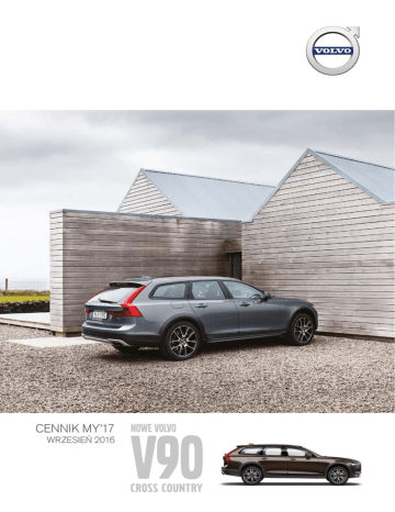 VOLVO V90 Cross Country| 1 CENNIK MY’17 WRZESIEŃ 2016 NOWE VOLVO V90 VOLVO V90 Cross Country| 2 VOLVO V90 Cross Country| 3 SPIS TREŚCI Jednostki napędowe 05 Wyposażenie standardowe06 Bezpieczeństwo 08 Komfort 08 Funkcjonalność 10 Multimedia 11 Wykończenie wnętrza 13 Tapicerki 14 Lakiery20 Koła 21 Promocyjne pakiety wyposażenia 22 Wybrane Systemy Bezpieczeństwa 24 Volvo On Call26 Pakiet gwarancyjny 27 Akcesoria 28 Dane techniczne 30 VOLVO V90 Cross Country| 4 VOLVO V90 Cross Country| 5 SILNIKI DIESLA Cena w zł z VAT (litr/KM) Skrzynia biegów Cross Country Cross Country PRO D4 AWD 2.0/190 manualna, 6 biegów 230 100 248 600 D4 AWD 2.0/190 automatyczna Geartronic, 8 biegów 239 700 258 200 D5 AWD 2.0/235 automatyczna Geartronic, 8 biegów 250 900 269 400 Silnik SILNIKI BENZYNOWE Silnik (litr/KM) Skrzynia biegów Cena w zł z VAT Cross Country Cross Country PRO T5 AWD 2.0/254 automatyczna Geartronic, 8 biegów 248 800 267 300 T6 AWD 2.0/320 automatyczna Geartronic, 8 biegów 292 100 310 600 Polestar Performance dla V90 Cross Country D5 AWD i T6 AWD PAKIET SERWISOWY VOLVO CARE Powyższe ceny zawierają pakiet serwisowy Volvo Care na okres 3 lat lub 100.000 km ( w zależności od tego, który warunek zostanie wcześniej spełniony), pokrywający koszty okresowych przeglądów, wliczając w to oryginalne części Volvo, olej oraz robociznę. Pakiet obejmuje czynności przewidziane zakresem przeglądów okresowych Volvo. Więcej informacji na temat Volvo Care, dodatkowego pakietu Care+ oraz zakresu przeglądów okresowych znajdą Państwo u Autoryzowanego Dealera Volvo. VOLVO V90 Cross Country| 6 WYPOSAŻENIE STANDARDOWE Opis wyposażenia BEZPIECZEŃSTWO oraz WŁAŚCIWOŚCI JEZDNE – 7 poduszek powietrznych: dla kierowcy i pasażera, dwie poduszki boczne (dwukomorowe), kurtyny powietrzne (IC), poduszka chroniąca kolana kierowcy – CITY SAFETY - Układ wspomagania hamowania dla różnicy prędkości pomiędzy pojazdami sięgającej 50 km/h – Unikanie lub łagodzenie skutków zderzeń z innymi samochodami na skrzyżowaniach - rozwiązanie wprowadzone po raz pierwszy na świecie – Unikanie lub łagodzenie skutków zderzeń z pieszymi i rowerzystami oraz zwięrzętami do prędkości 40km/h. System działa również w ciemności – Unikanie lub łagodzenie skutków zderzeń z pieszymi i rowerzystami oraz zwięrzętami do prędkości 40km/h. System działa również w ciemności – SYSTEM BEZPIECZEŃSTWA INTELLISAFE ASSIST zawiera: - Active Cruise Control (ACC) - aktywny tempomat - Pilot Assist II generacji - wspomaganie kierowania przy prędkości do 130 km/h, nie wymagające obecności pojazdu z przodu - Lane Keeping Aid (LKA) - układ utrzymania pasa ruchu - Queue Assist - funkcjonalność ACC wspomagająca jazdę w korkach: samodzielne zatrzymanie i ruszenie za pojazdem - Distance Alert - układ ostrzegania o zbyt małej odległości od poprzedzającego pojazdu – RSI (ROAD SIGN INFORMATION) - układ informowania o znakach drogowych – Napęd na wszystkie koła AWD (All WHEEL DRIVE) Borg Warner 5 generacji z system Instant Traction™ (dla silnika D4 AWD, D5 AWD, T5 AWD, T6 AWD) – ESC (ELECTRONIC STABILITY CONTROL) - układ elektronicznej kontroli stabilności i trakcji – SIPS (SIDE IMPACT PROTECTION SYSTEM) system zabezpieczeń przed skutkami uderzeń bocznych – WHIPS (WHIPLASH PROTECTION SEATING SYSTEM) system zabezpieczeń przed urazami kręgosłupa szyjnego – ABS (ANTI-LOCK BRAKE SYSTEM) z elektronicznym układem rozdziału sił hamowania (EBD – Electronic Brake Distribution) – CTC (CORNER TRACTION CONTROL) - kontrola trakcji w zakręcie – TSA (TRAILER STABILITY ASSIST) system stabilizacji pojazdu w czasie holowania przyczepy – EBA (EMERGENCY BRAKE ASSISTANCE) - układ wspomagania nagłego hamowania – EBL (EMERGENCY BRAKE LIGHTS) - ostrzeganie innych użytkowników drogi o gwałtownym hamowaniu – RSC (ROLL STABILITY CONTROL) - układ stabilizacji przechyłu – Regulacja pasów bezpieczeństwa w pierwszym i drugim rzędzie siedzeń – Przednie pasy bezpieczeństwa z elektrycznymi napinaczami łagodzącymi skutki kolizji – Napinacze pasów bezpieczństwa – Zwalnianie pedału hamulca - rozwiązanie wprowadzone po raz pierwszy na świecie – Czujnik deszczu – Autoalarm Volvo Guard z czujnikiem przechyłu oraz ruchu – Zdalnie sterowany zamek centralny – Centralna blokada schowka – Immobilizer – Wyłącznik poduszki powietrznej pasażera – Elektryczny hamulec postojowy – Funkcja Auto Hold WNĘTRZE – System Audio High Performance - centralny wyświetlacz o przekątnej 9 cali - moc 330 W - 10 głośników - złącze AUX / USB – Sensus Connect Infotainment System wraz z zestawem głośnomówiacym Bluetooth. – 8" graficzny wyświetlacz zegarówL – ECC (ELECTRONIC CLIMATE CONTROL) - kilimatyzacja elektroniczna 2-strefowa – Trójramienna, skórzana kierownica – Sterowanie audio z kierownicy – Dywaniki tekstylne – Podświetlane lusterka wewnętrzne dla kierowcy i pasażera – Skórzane pokrycie dźwigni zmiany biegów – Komputer pokładowy z komunikatami w języku polskim – Wskaźnik temperatury zewnętrznej – Kanapa tylna (dzielona w proporcjach 40/60) – Gniazdo 12V w tylnej części konsoli centralnej – Podłokietnik przedni – Schowek w konsoli centralnej i w przednich drzwiach – Uchwyty na kubki z przodu – Lampki do czytania z przodu i z tyłu – Listwa ochronna wewnętrznej strony bagażnika – Ręcznie składane zagłówki tylnej kanapy VOLVO V90 Cross Country| 7 WYPOSAŻENIE STANDARDOWE NADWOZIE – Elektrycznie regulowane i podgrzewane lusterka zewnętrzne – Barwione szyby – Oznaczenie modelu oraz silnika - Zintegrowane relingi dachowe WERSJA WYPOSAŻENIA Cross Country ZAWIERA DODATKOWO: – Fotele komfortowe z tapicerką skórzaną XAX0 – Światła drogowe w technologii LED – Wykończenie wnętrza DARK WALNUT – Koła ze stopów lekkich 18", 5-ramienne – Skórzana, wielofunkcyjna kierow