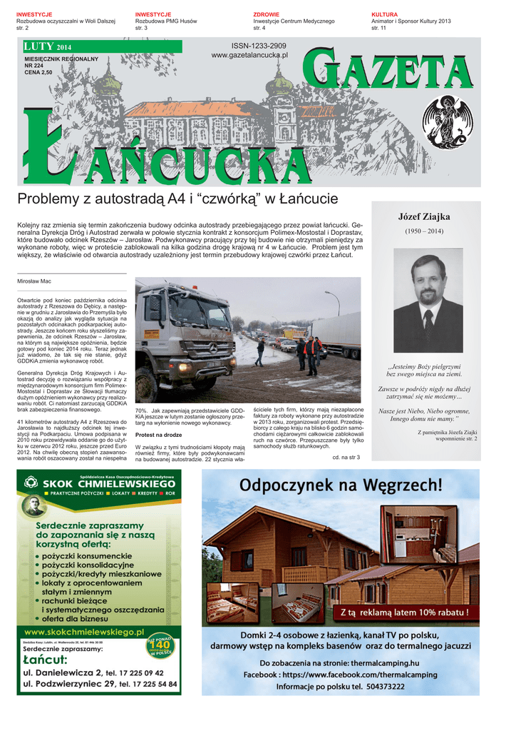 INWESTYCJE Rozbudowa oczyszczalni w Woli Dalszej str. 2 INWESTYCJE Rozbudowa PMG Husów str. 3 LUTY 2014 ZDROWIE Inwestycje Centrum Medycznego str. 4 KULTURA Animator i Sponsor Kultury 2013 str. 11 ISSN-1233-2909 www.gazetalancucka.pl MIESIĘCZNIK REGIONALNY NR 224 CENA 2,50 Problemy z autostradą A4 i “czwórką” w Łańcucie Kolejny raz zmienia się termin zakończenia budowy odcinka autostrady przebiegającego przez powiat łańcucki. Generalna Dyrekcja Dróg i Autostrad zerwała w połowie stycznia kontrakt z konsorcjum Polimex-Mostostal i Doprastav, które budowało odcinek Rzeszów – Jarosław. Podwykonawcy pracujący przy tej budowie nie otrzymali pieniędzy za wykonane roboty, więc w proteście zablokowali na kilka godzina drogę krajową nr 4 w Łańcucie. Problem jest tym większy, że właściwie od otwarcia autostrady uzależniony jest termin przebudowy krajowej czwórki przez Łańcut. Józef Ziajka (1950 – 2014) Mirosław Mac Otwartcie pod koniec października odcinka autostrady z Rzeszowa do Dębicy, a następnie w grudniu z Jarosławia do Przemyśla było okazją do analizy jak wygląda sytuacja na pozostałych odcinakach podkarpackiej autostrady. Jeszcze końcem roku słyszeliśmy zapewnienia, że odcinek Rzeszów – Jarosław, na którym są największe opóźnienia, będzie gotowy pod koniec 2014 roku. Teraz jednak już wiadomo, że tak się nie stanie, gdyż GDDKiA zmienia wykonawcę robót. Generalna Dyrekcja Dróg Krajowych i Autostrad decyzję o rozwiązaniu współpracy z międzynarodowym konsorcjum firm PolimexMostostal i Doprastav ze Słowacji tłumaczy dużym opóźnieniem wykonawcy przy realizowaniu robót. Ci natomiast zarzucają GDDKiA brak zabezpieczenia finansowego. 41 kilometrów autostrady A4 z Rzeszowa do Jarosławia to najdłuższy odcinek tej inwestycji na Podkarpaciu. Umowa podpisana w 2010 roku przewidywała oddanie go do użytku w czerwcu 2012 roku, jeszcze przed Euro 2012. Na chwilę obecną stopień zaawansowania robót oszacowany został na niespełna „Jesteśmy Boży pielgrzymi bez swego miejsca na ziemi. Zawsze w podróży nigdy na dłużej zatrzymać się nie możemy… 70%. Jak zapewniają przedstawiciele GDDKiA jeszcze w lutym zostanie ogłoszony przetarg na wyłonienie nowego wykonawcy. Protest na drodze W związku z tymi trudnościami kłopoty mają również firmy, które były podwykonawcami na budowanej autostradzie. 22 stycznia wła- ściciele tych firm, którzy mają niezapłacone faktury za roboty wykonane przy autostradzie w 2013 roku, zorganizowali protest. Przedsiębiorcy z całego kraju na blisko 6 godzin samochodami ciężarowymi całkowicie zablokowali ruch na czwórce. Przepuszczane były tylko samochody służb ratunkowych. cd. na str 3 Nasze jest Niebo, Niebo ogromne, Innego domu nie mamy.” Z pamiętnika Józefa Ziajki wspomnienie str. 2 2 GAZETA ŁAŃCUCKA Wspomnienie Józefa Ziajki Józef Ziajka urodził się 7 września 1950 w Żarkach, w województwie krakowskim. Był absolwentem LO im. Stanisława Staszica w Chrzanowie. Studiował na Uniwersytecie Jagiellońskim, Wydział Biologii i Nauk o Ziemi, gdzie na kierunku Geografia uzyskał tytuł magistra. W czasie studiów działał w Kole Geografów i ZSP. W latach 1971-1973 był pełnomocnikiem praktyk robotniczych przy Dziekanie Wydziału BiNoZ. Za zaangażowanie w pracę społeczną został odznaczony w 1971 brązową, a w 1972 złotą odznaką OHP za organizację praktyk na Uniwersytecie Jagiellońskim. W roku 1972 założył rodzinę żeniąc się z żołynianką Stanisławą, z domu Brudniak, studentką Wydziału Prawa Uniwersytetu Jagiellońskiego. Odtąd Jego Małą Ojczyzną stała się ziemia łańcucka, gdzie przeniósł się na stałe. Rodzina Ziajków najpierw zamieszkała w Żołyni, przysiółek Kopanie, a od 1975 r., po wybudowaniu domu, w Łańcucie. Od tego czasu był człowiekiem dwóch zawodów, pracując jako nauczyciel i jako rolnik, bowiem wraz z rodzicami żony i jej bratem prowadził plantację tytoniu (ok. 2ha), w Kopaniach, w rodzinnym gospodarstwie teściów. Pracę w Liceum Ekonomicznym im. Mikołaja Kopernika w Łańcucie przy ul. Prusa 10 (obecnie ul. Farna) rozpoczął 1 września 1975 r. Wówczas do Zespołu Szkół oprócz LE należały również: Zasadnicza Szkoła Handlowa, Zasadnicza Szkoła Wielozawodowa oraz Średnie Studium Zawodowe o profilu społeczno-prawnym i operatywno-handlowym. Było to pięciosemestralne zaoczne studium zawodowe dla osób pracujących, kończące się egzaminem dojrzałości. Oprócz geografii, statystyki, uczył również takich przedmiotów jak: organizacja i technika sprzedaży, gospodarka przedsiębiorstw, fizyka i BHP. Ponadto pełnił funkcję opiekuna Szkolnego Koła PTTK, organizując szereg wycieczek szkolnych, biwaków, obozów wędrownych i rajdów rowerowych. W roku 1980 Szkolne Koło Krajoznawczo – Turystyczne, które prowadził, uznane zostało za najlepsze w województwie rzeszowskim, a młodzież z Jego Kółka Statystycznego doszła do finału centralnego. W roku 1981 decyzją Kuratora Oświaty i Wychowania w Rzeszowie otrzymał nagrodę za szczególne osiągnięcia w pracy dydaktyczno-wychowawczej. Jako nauczyciel Zespołu Szkół im. Kopernika miał zaszczyt pracować ze wspaniałymi wychowawcami, między innymi prof.: Jan Didyk, Danuta Fangor, Czesław Ćwiąkalski, Maria Kluz, Stefan Kwolek, Piotr Smycz, Maria Bytnar-Bazan, Ala Tkacz, Basia Nycz-Pantuła, Jola Tomaszek, Ola Strużak, dyr. Stanisław Czech, dyr. Krzysztof Szczepaniak i wielu innych. Od 1 września 1979 do 30 sierpnia 1985 uczył również geografii w Państwowym Technikum Mechanizacji Rolnictwa w Łańcucie. Bliski kontakt z wieloma wychowankami utrzymywał również po ukończeniu przez nich nauki w szkołach, w których uczył. A Jego pierwszy dzień w pracy 1 września 1975 wielu uczniów LE zapamiętało w sposób szczególny, bowiem „nowy nauczyciel” przyszedł z ręką w gipsie w „kształcie samo
