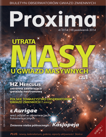 K str IET .4 A 8 ! AN SŁOWO WSTĘPU T ematem przewodnim niniejszego numeru są gwiazdy masywne. A stało się to za sprawą artykułu przygotowanego przez naszego dociekliwego autora Ryszarda Biernikowicza. W zasadzie trudno mówić tu o artykule, bo materiał jest tak obszerny, że musieliśmy podzielić go na trzy spore części. Mowa o tekście zatytułowanym „Utrata masy – jej wpływ na ewolucję i los bardzo masywnych gwiazd”. Autor w oparciu o artykuł prof. Nathana Smith’a z Steward Observatory (University of Arizona, USA) dostępny w internetowym archiwum preprintów naukowych (ostateczna wersja ukazała się w czasopiśmie Annual Review of Astronomy and Astrophysics) prezentuje nam obecny stan wiedzy o gwiazdach masywnych, utracie masy oraz ich ostatecznym losie. W bieżącym numerze prezentujemy część pierwszą materiału, następne części będziemy publikować w kolejnych numerach Proximy. Czynnych obserwatorów zachęcamy natomiast do przyłączenia się do międzynarodowej akcji obserwacyjnej układu zaćmieniowego ε Aurigae, którego ostatnie zaćmienie główne wystąpiło wprawdzie w latach 2009-2011, jednak istnieje uzasadnione podejrzenie, że w układzie mamy do czynienia również z ogromnym dyskiem materii. Z tego powodu AAVSO wystosowało alert, w którym wskazuje na potrzebę dalszych obserwacji gwiazdy. Ponadto w biuletynie nasze stałe pozycje, czyli supernowe w III kwartale bieżącego roku, kalendarium miryd na najbliższe 3 miesiące, zmienne nieba północnego (tym razem mowa o gwiazdozbiorze Kasjopei) oraz krótka prezentacja niezwykle ciekawej zmiennej HZ Herculis, będącej jednocześnie źródłem promieniowania rentgenowskiego. A na koniec raport z obserwacji słonecznych członków Towarzystwa Obserwatorów Słońca im. Wacława Szymańskiego w Żychlinie i podsumowanie aktywności słonecznej w III kwartale bieżącego roku. Zachęcam do lektury! Proxima Biuletyn obserwatorów gwiazd zmiennych Wydawca: Krzysztof Kida, Tropy Elbląskie 3, 82-310 Elbląg Rejestracja : ISSN 2391-629X Redaktor naczelny: Krzysztof Kida Opracowanie graficzne i skład: Maciej Nowaczyk Zespół redakcyjny: Bogdan Kubiak, Marian Legutko Współpraca: Ryszard Biernikowicz, Adam Derdzikowski, Tomasz Krzyt, Stanisław Świerczyński Email: [email protected] Strona www: http://www.astronomica.pl/proxima.html Biuletyn wydawany w wersji elektronicznej (format PDF), O Proximie... W biuletynie wykorzystano wyniki obserwacji zgromadzone w bazie AAVSO, uzyskane dzięki wysiłkowi obserwatorów z całego świata We acknowledge with thanks the variable star observations from the AAVSO International. Database contributed by observers worldwide and used in this bulletin Wszelkie prawa zastrzeżone. Żadna część tej publikacji nie może być reprodukowana w żadnej formie ani żadną metodą bez pisemnej zgody redakcji. Copyright © 2014 by PROXIMA Zdjęcie na okładce: Sharpless 2-106 (S2-106) to odległy o 2 tysiące lat świetlnych obszar HII, znajdujący się w gwiazdozbiorze Łabędzia. Mgławica skrywa w swym wnętrzu prawdziwy gwiezdny żłobek. Jej kształt regulowany jest przez intensywny wiatr gwiazdowy. Przypuszcza się, że masywna gwiazda centralna mgławicy (IRS 4) ma masę 15 mas Słońca i powstała zaledwie 100 tysięcy lat temu. Źródło: NASA & ESA 2 Proxima • październik 2014 SPIS TREŚCI PAZ D Z I E R N I K Słowo Wstępu 2 News 4 R Korony Północnej 4 Potrzebne obserwacje fotometryczne ε Aurigae 5 Już 26 milionów obserwacji w bazie AAVSO 6 Kalendarium Mirydy 7 Krzywe jasności wybranych miryd 9 Gwiezdne Kataklizmy Supernowe w III kwartale 2014 r. Poradnik obserwatora 11 11 13 Gwiazdozbiory nieba północnego - Kasjopeja 13 HZ Herculis 19 Astrofizyka Utrata masy - jej wpływ na ewolucję i los bardzo masywnych gwiazd cz.1/3 Aktywność słoneczna Raport z aktywności Słońca za III kwartał 2014 roku Galeria 7 20 20 41 42 47 Grafika: Fish3r NEWS R Korony Północnej Jesienią 2011 roku oraz wiosną 2013 roku notowano Spośród różnych astronomicznych wydarzeń trzewzrost jasności do około 12 mag (2011) i blisko 10 mag ciego kwartału 2014 roku nieco mniej słychać o od(2013). Wydawało się wtedy, że jest to już koniec rekryciach w świecie gwiazd zmiennych. Warto jednak kordowego minimum. Czy i tym razem sytuacja się odnotować powrót jasności słynnej gwiazdy zmiennej powtórzy? Czy jednak wreszcie R Korony pozbędzie R Korony Północnej do poziomu pozwalającego użyć się swojej ciemnej otoczki i zabłyśnie na „zwykłym” podczas jej obserwacji większych lornetek. Dodać poziomie ok. 6 mag? należy, że baza AAVSO osiąga kolejne miliony zgromadzonych w niej ocen jasności gwiazd. Oznacza to, że Marian Legutko (LMT) amatorska astronomia gwiazd zmiennych nadal ma się bardzo dobrze. Od lata bieżącego roku notuje się stały przyrost jasności tej popularnej wśród obserwatorów gwiazdy zmiennej. Wygląda na to, że tym razem trend ten się nie zmieni, chociaż R CrB potrafi sprawić niespodziankę. Jednak teraz wreszcie zaczynają być możliwe obserwacje lornetkowe. Minimum rozpoczęte latem 2007 należy do najdłuższych epizodów tego typu w historii obserwacji R CrB. Wartość minimalnej jasności gwiazdy osiągała rekordowe dla tej zmiennej poziomy, osiągając 14,5 – 15,1 mag. Ostatnie obserwowane minimum blasku o tak długim czasie trwania i tak małej jaRys. 1 Krzywa blasku R Korony Północnej z lat 1963-1965 na bazie obserwacji AAVSO sności miało miejsce w latach 1963-1965. Rys. 2 Krzywa blasku R Korony Północnej z lat 2007 - 2014 na bazie obserwacji AAVSO 4 Proxima • październik 2014 NEWS Potrzebne obserwacje fotometryczne ε Aurigae Epsilon Aurigae jest zaćmieniowym układem podwójnym o ekstremalnie długim okresie orbitalnym około 27,12 lat. Według jednego z bardziej prawdopodobnych modeli, w czasie zaćmienia głównego ogromny nieprzeźroczysty dysk częściowo przesłania nadolbrzyma typu wid